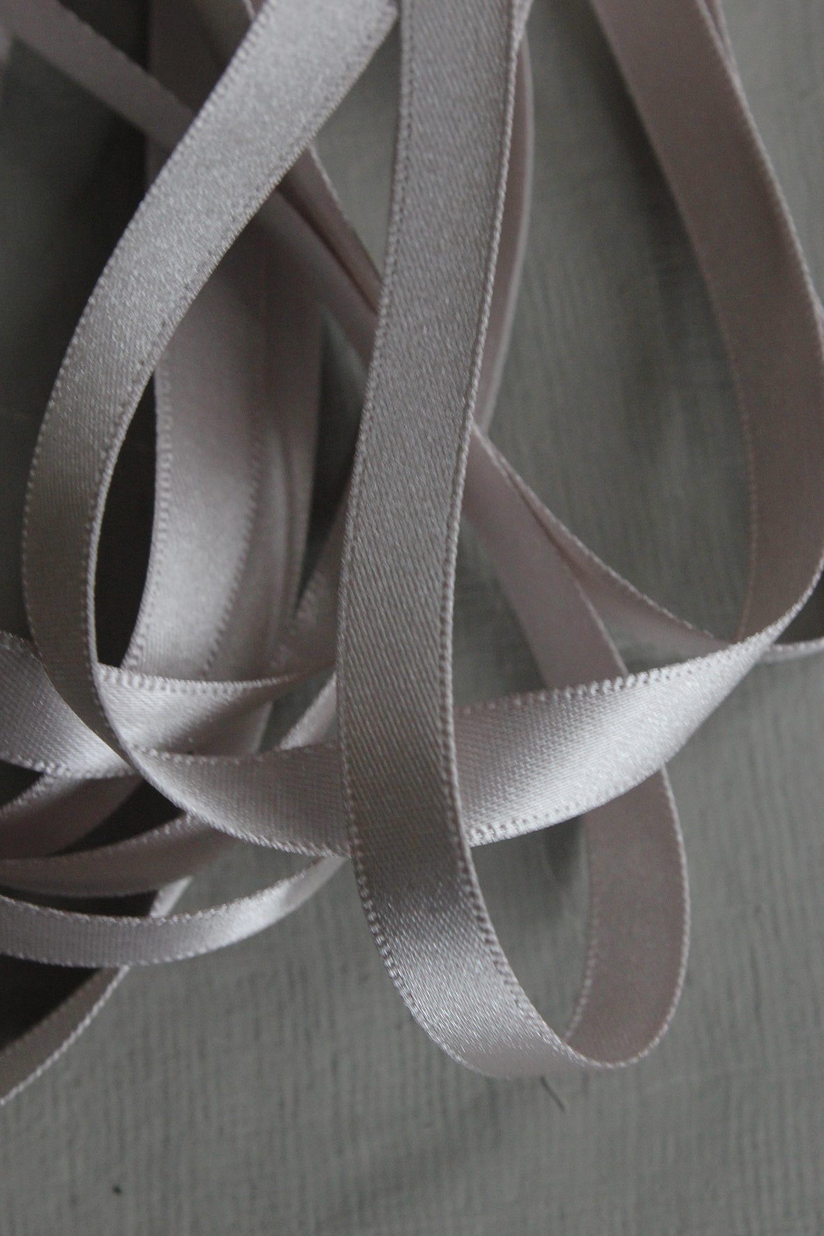 A lovely double sided satin vintage ribbon with a in a gentle warm silver with a very slight wash of pink/mauve.