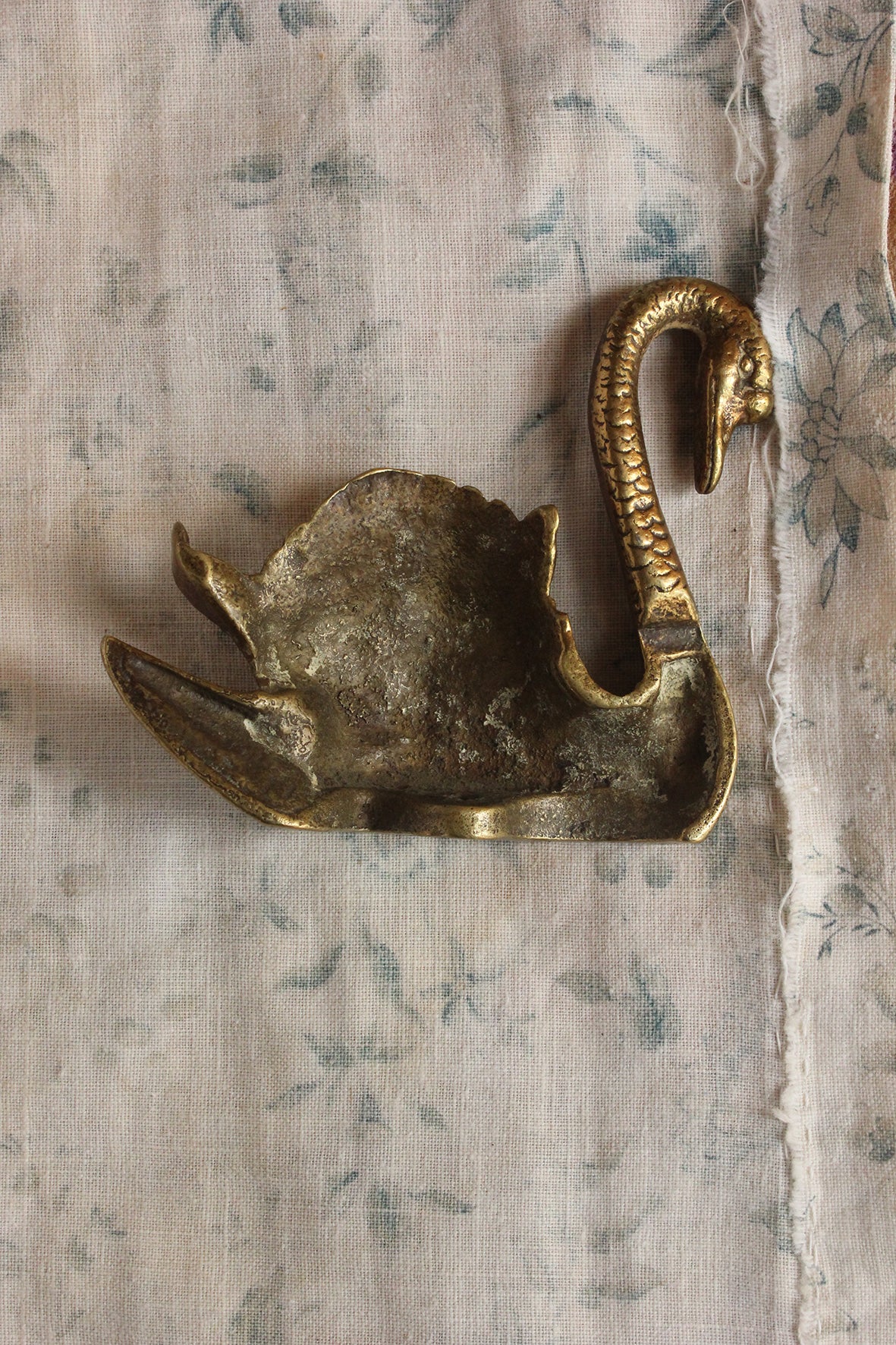 A beautiful old brass swan that is detailed to one side as it looks as if it may be from an old piece of furniture or possibly a clock. There is a hole to the base where it would have been attached. Free stands well to use as a calming ornament.