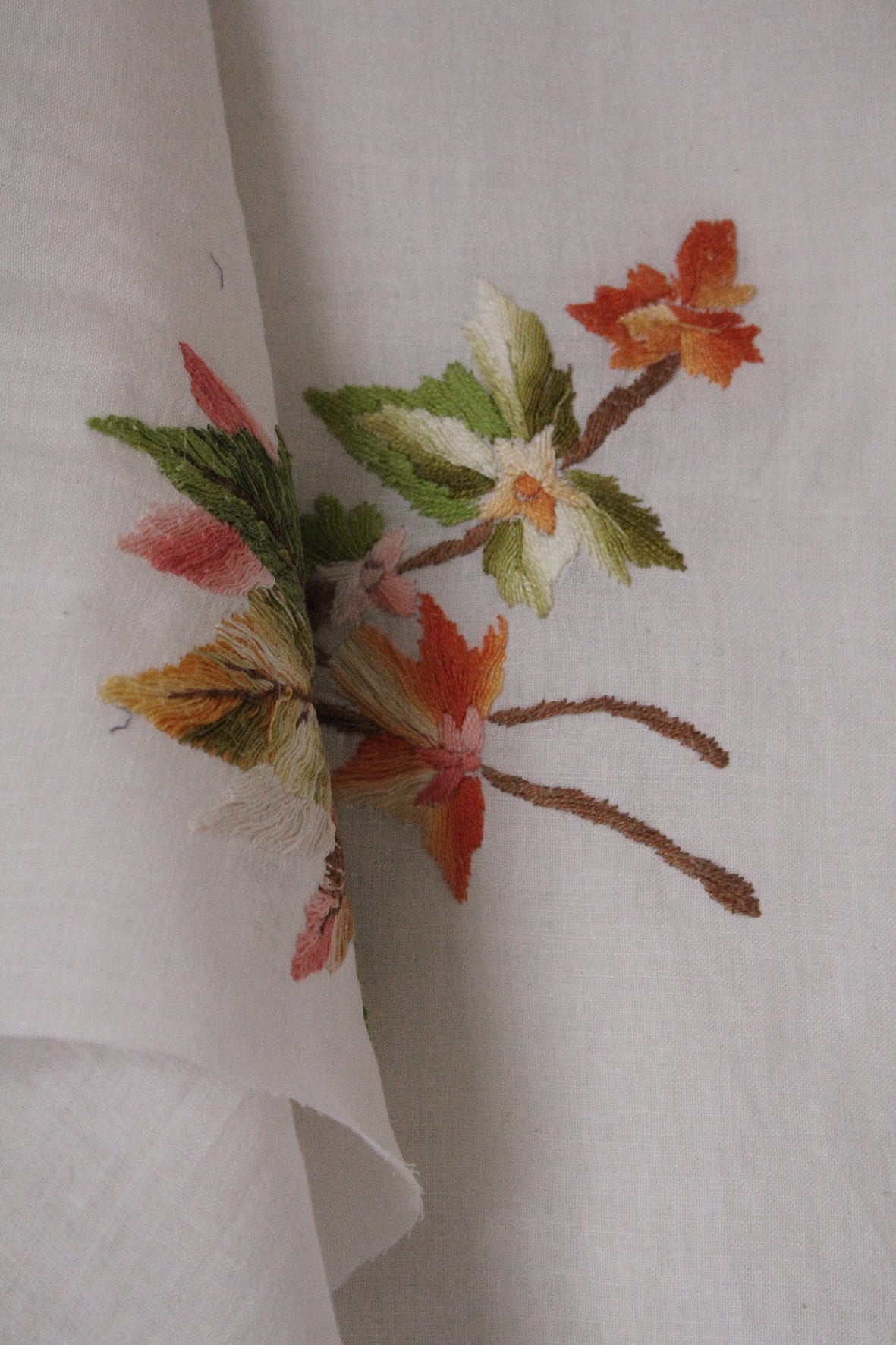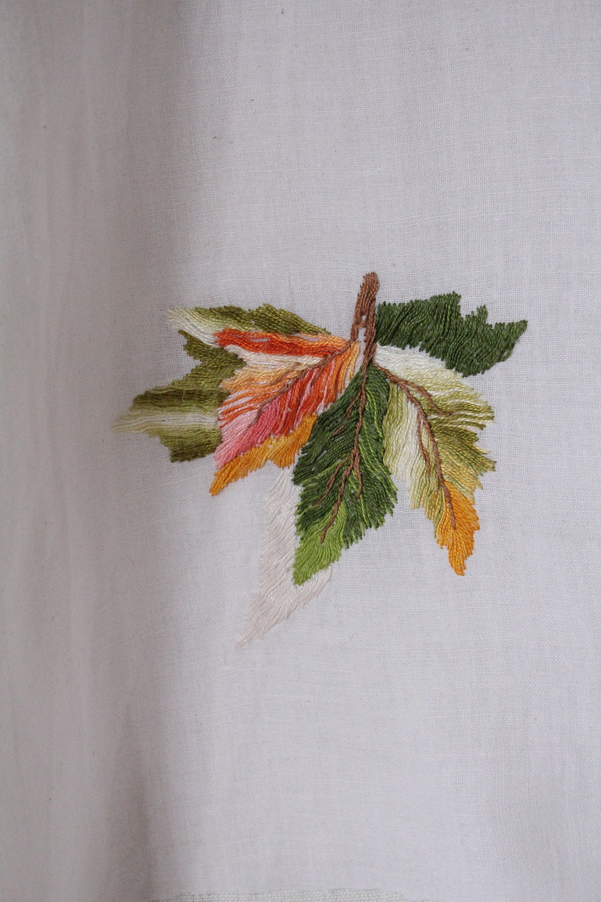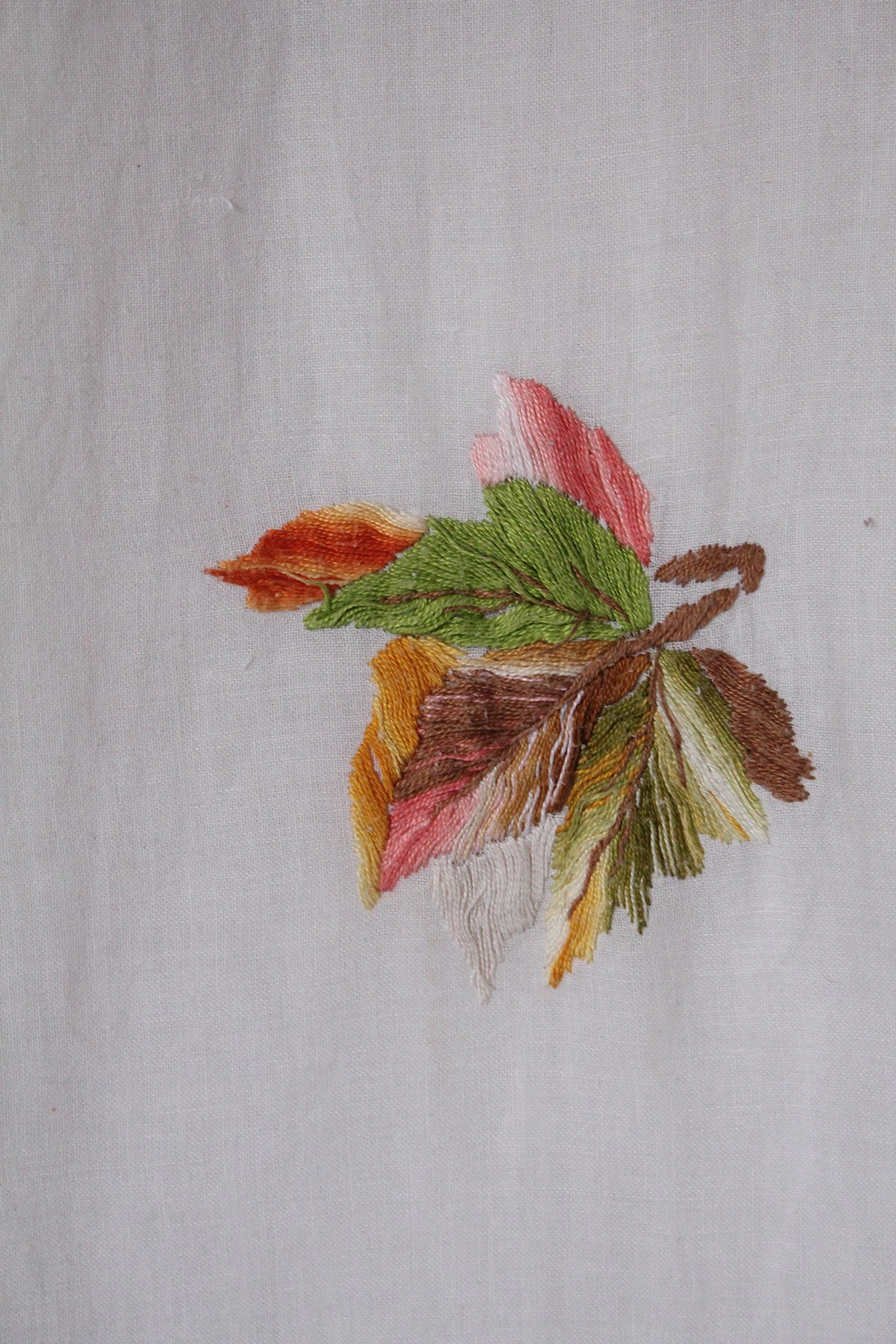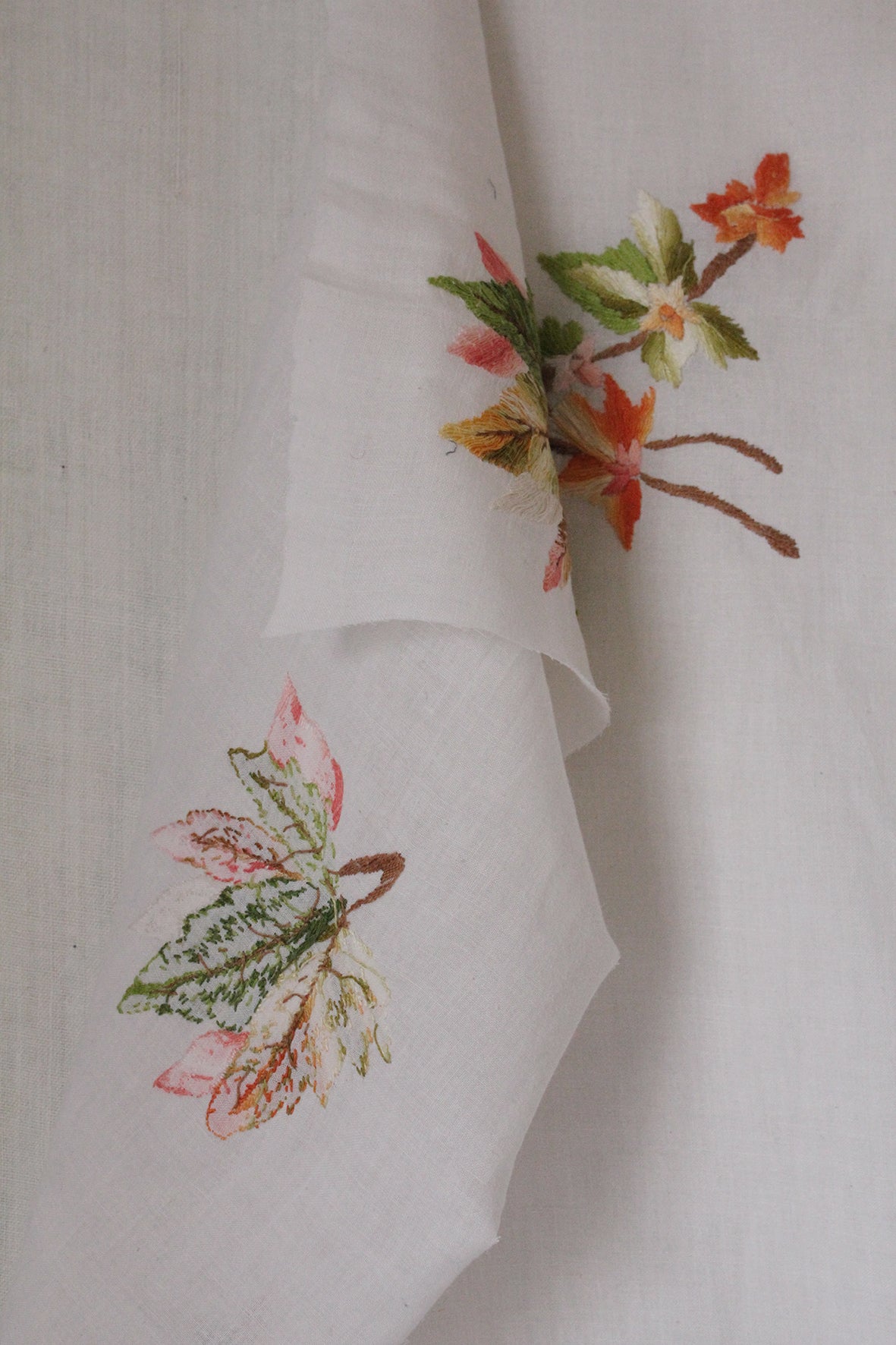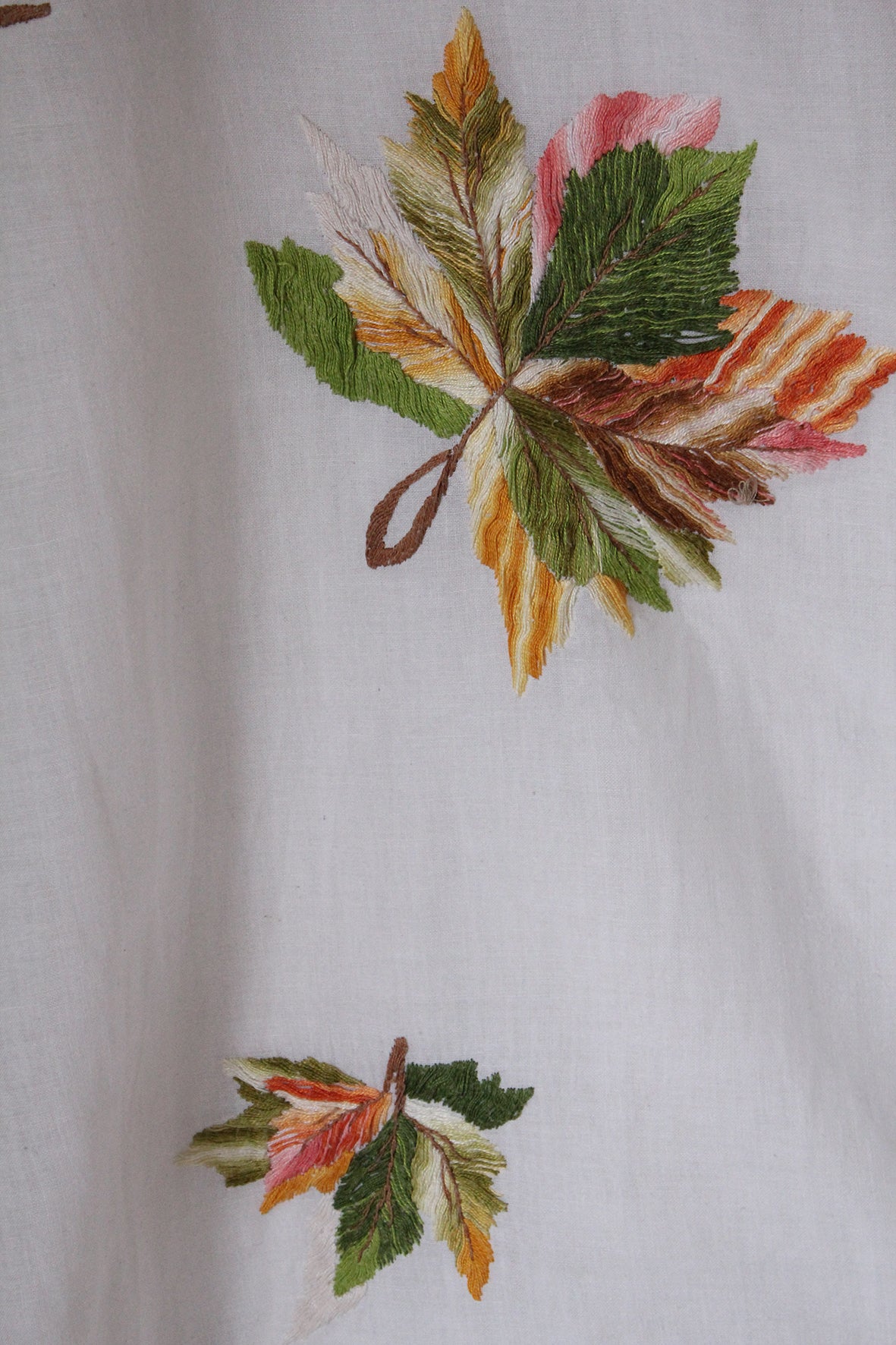 A panel of hand embroidered falling leaves and autumnal details on a gentle cotton base.