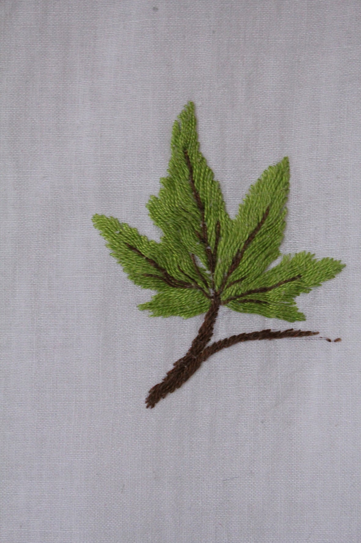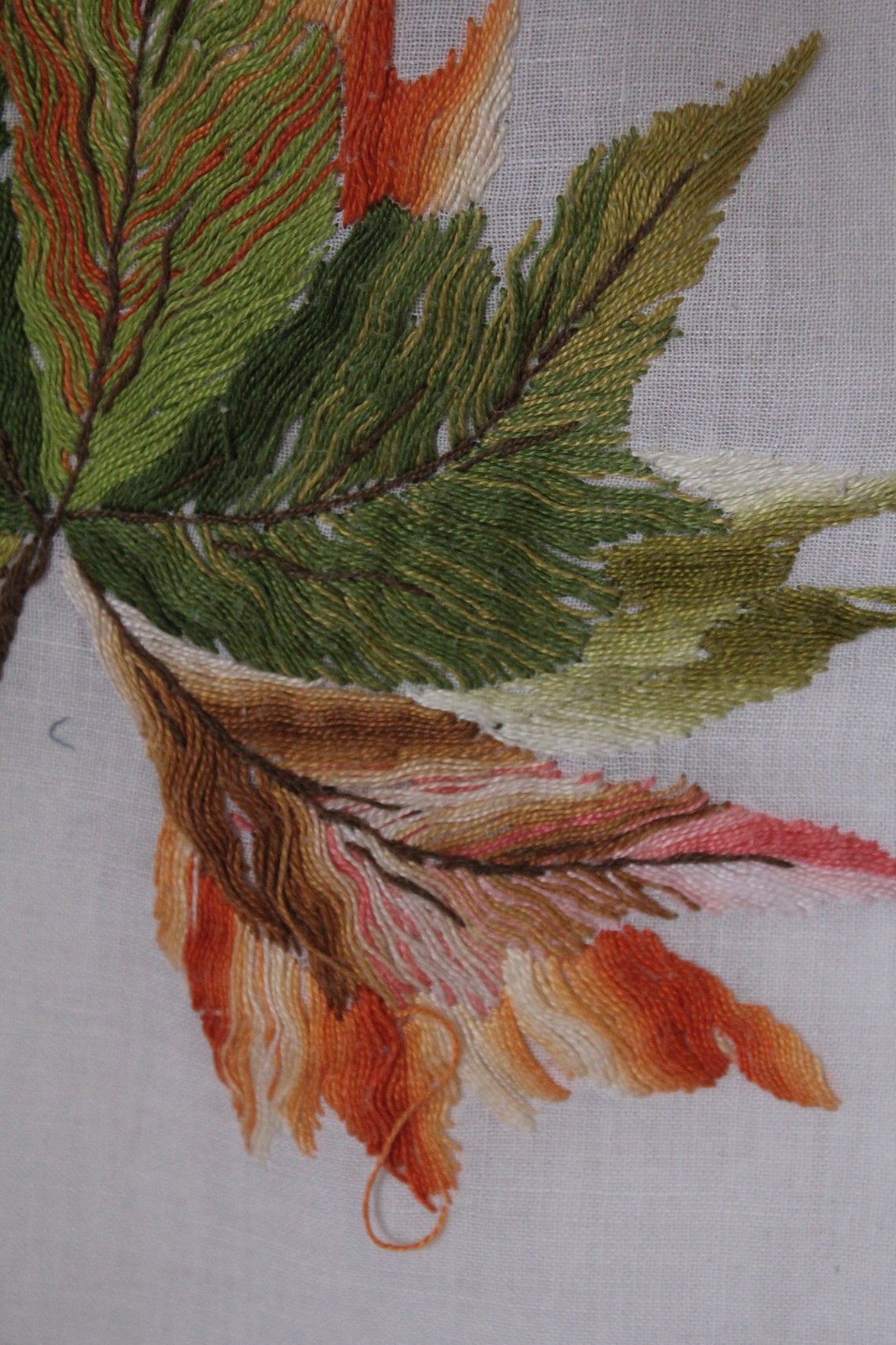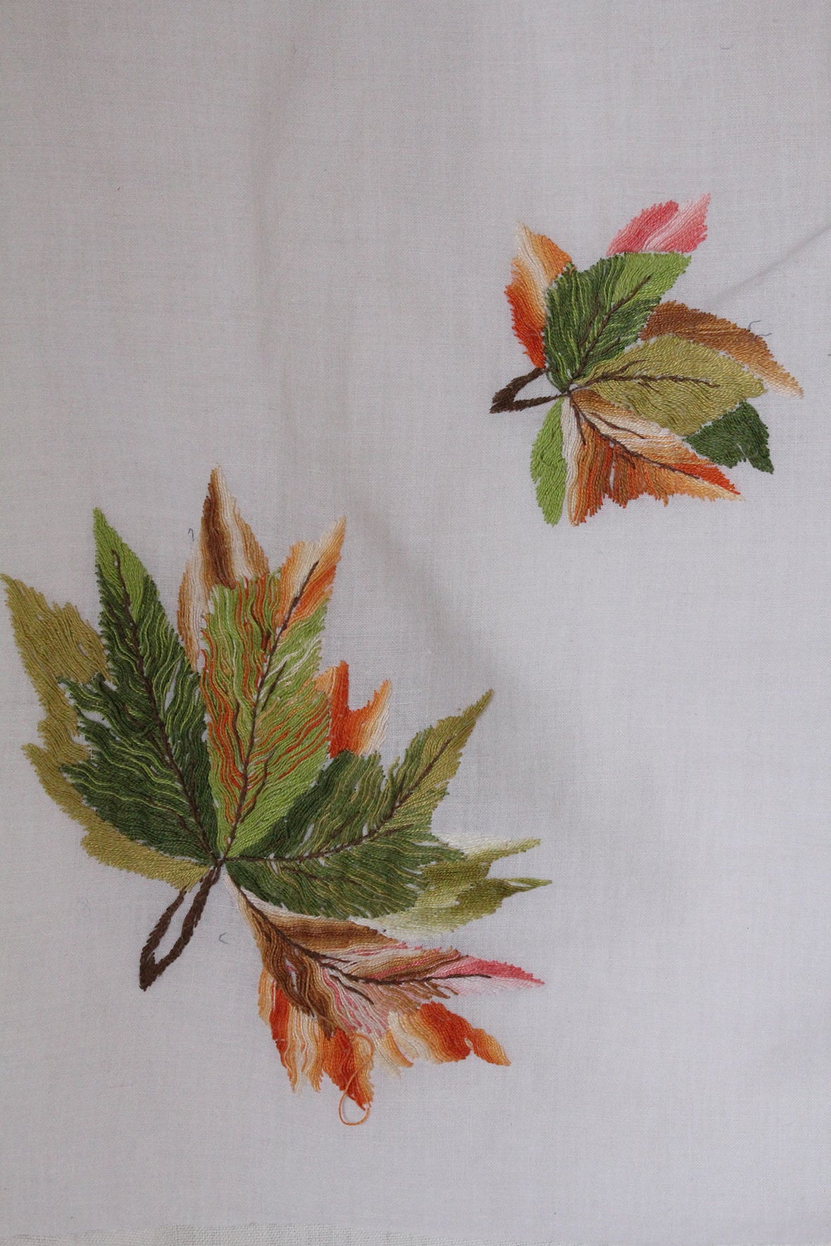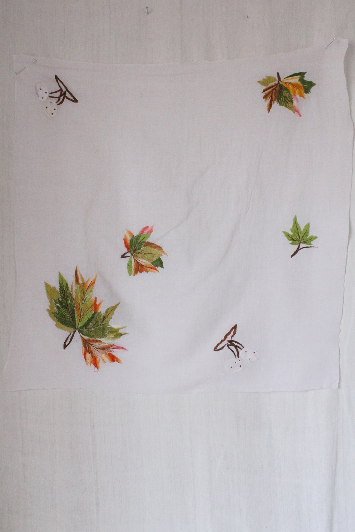 A panel of hand embroidered falling leaves and autumnal details on a gentle cotton base.