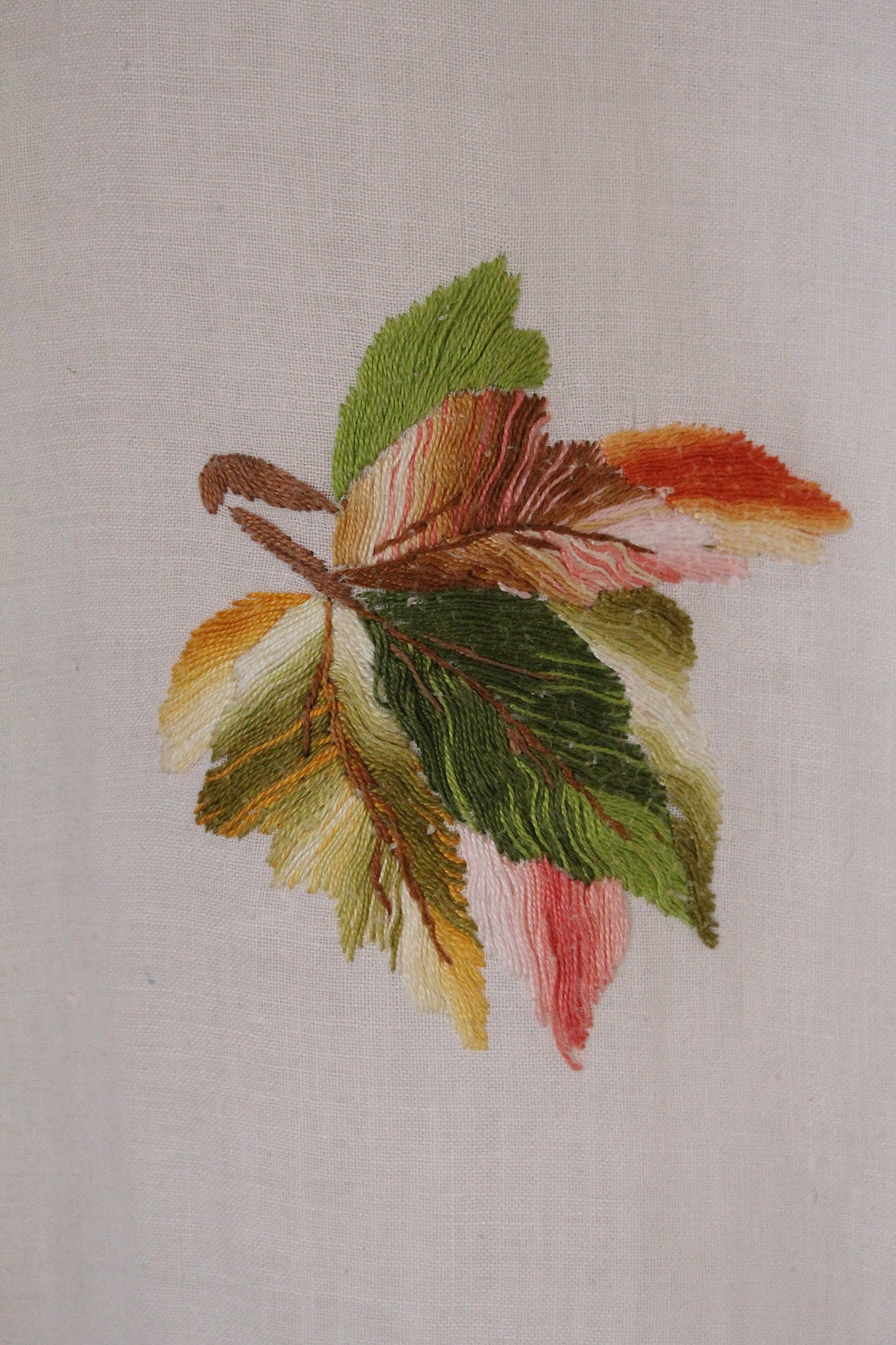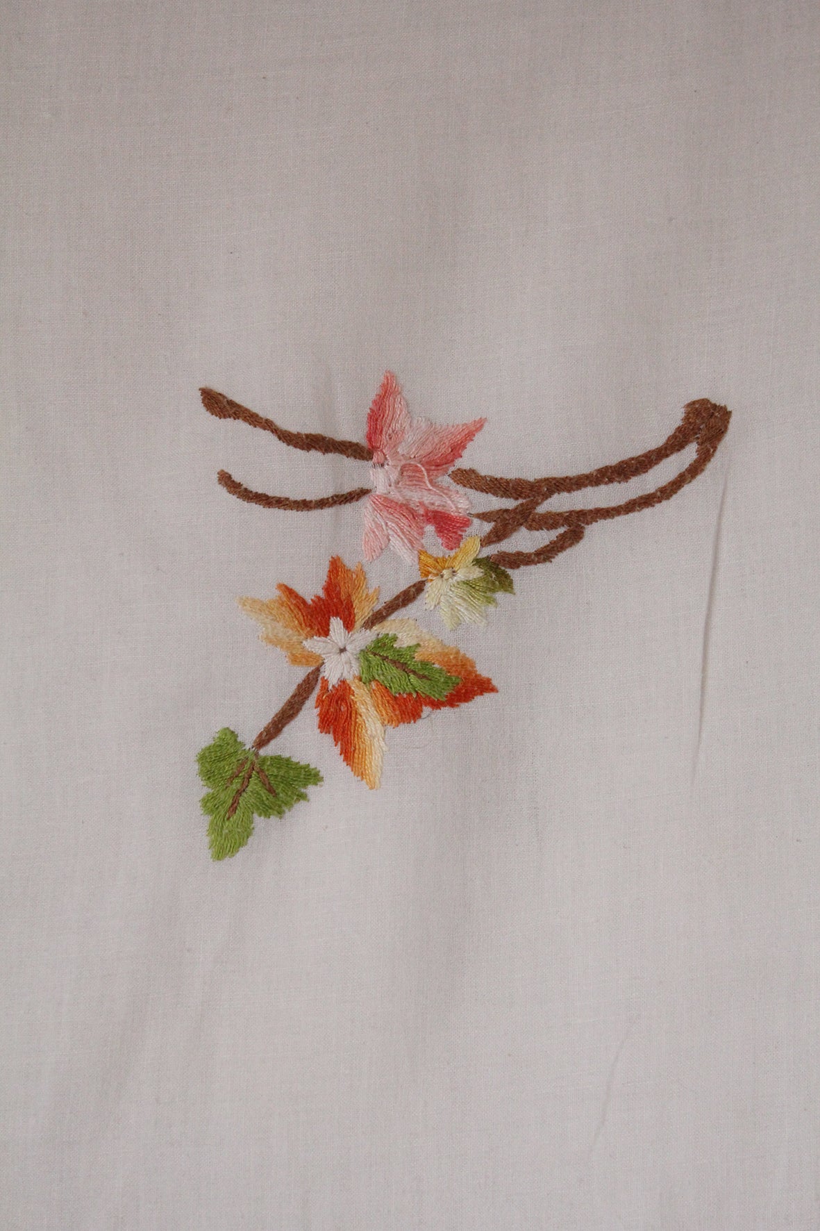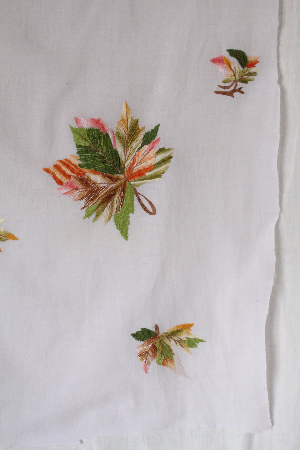 A panel of hand embroidered falling leaves and autumnal details on a gentle cotton base.