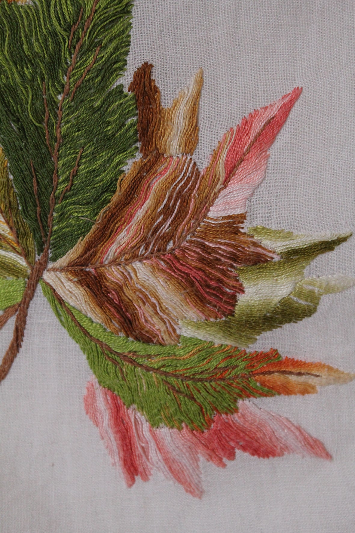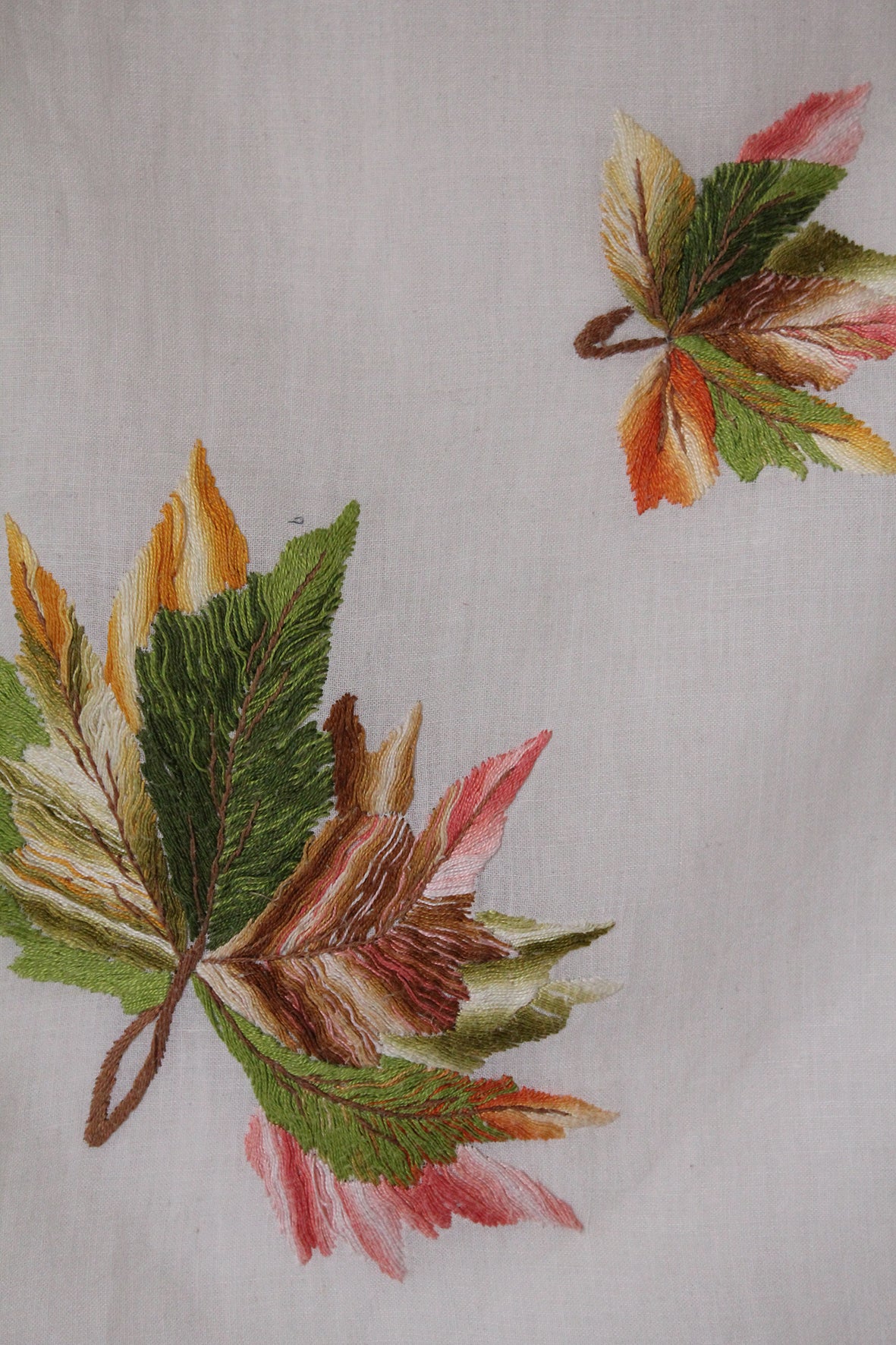 A panel of hand embroidered falling leaves and autumnal details on a gentle cotton base.