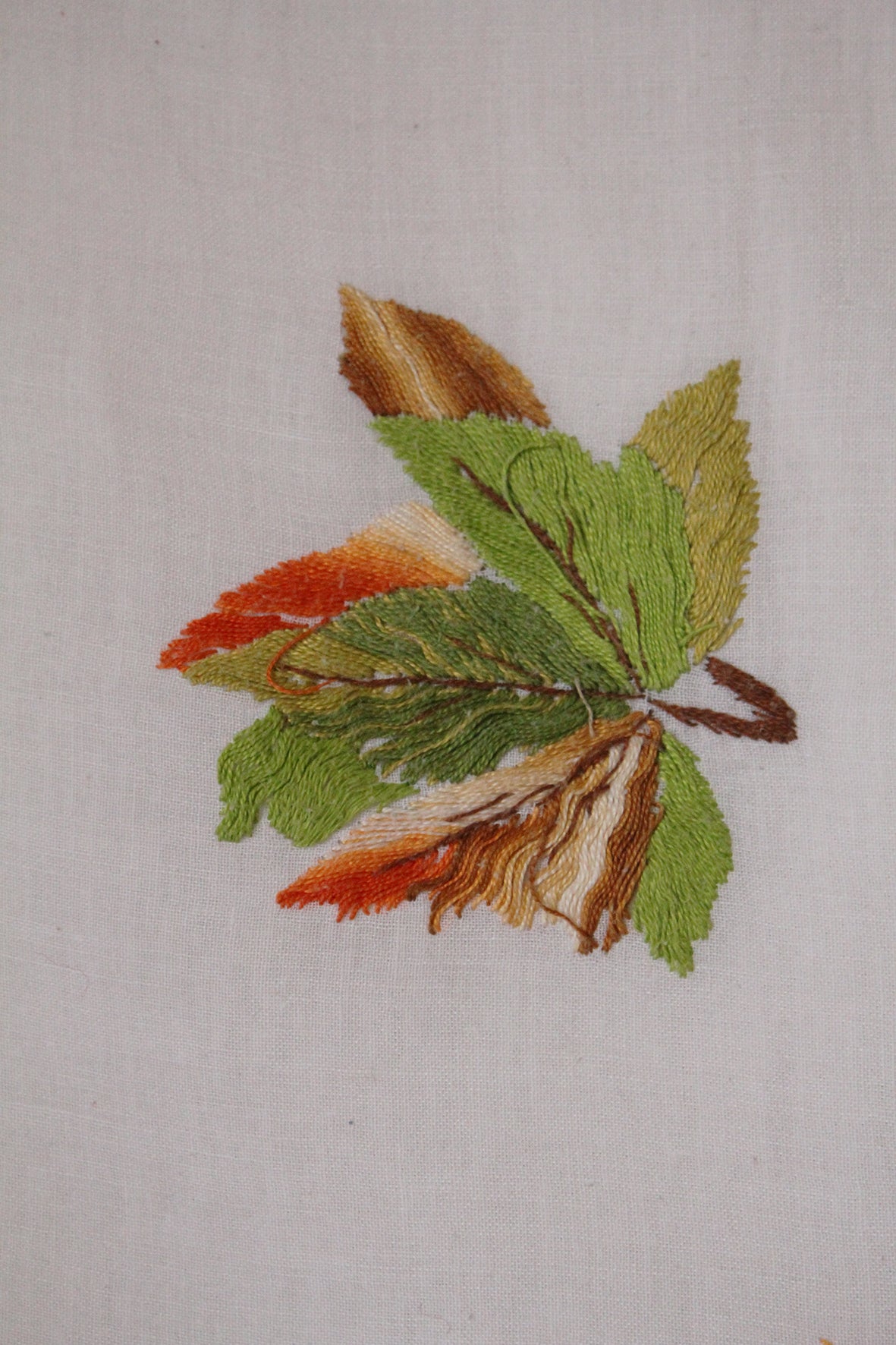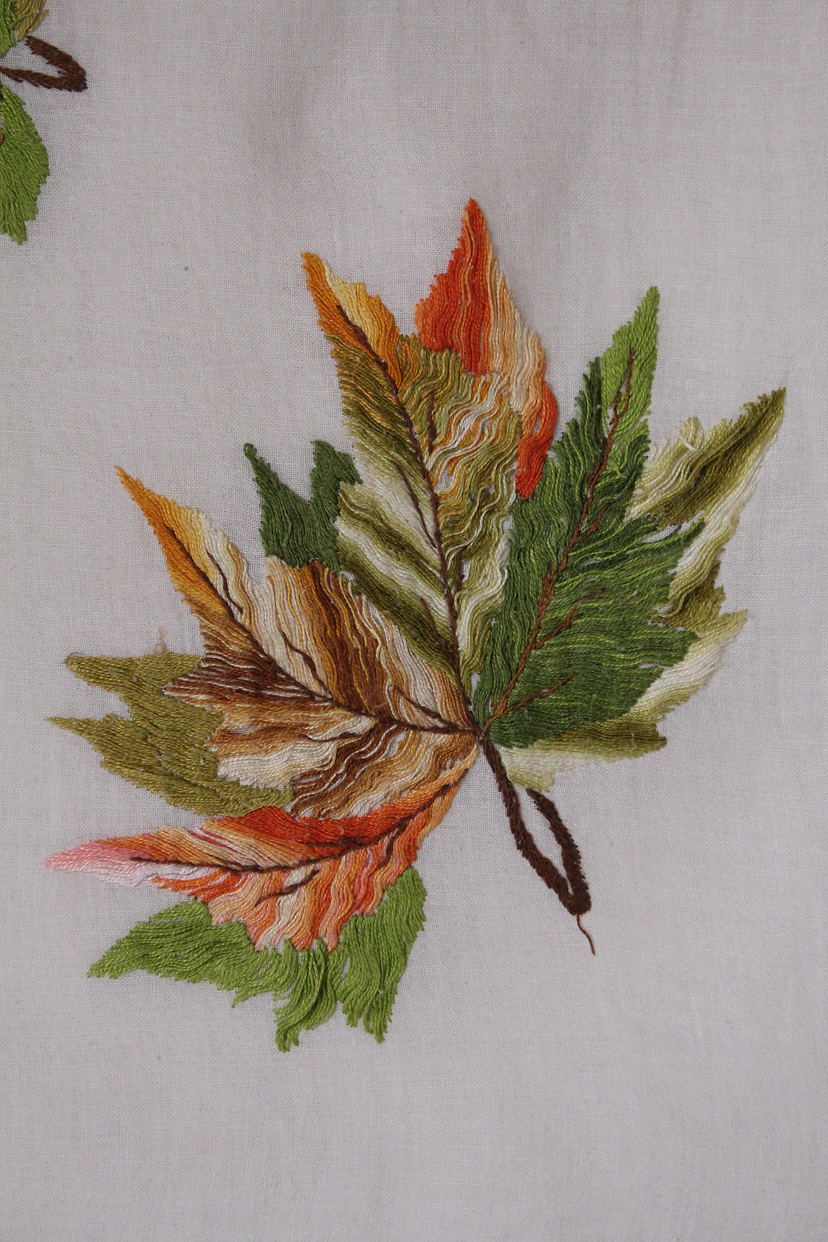 A panel of hand embroidered falling leaves and autumnal details on a gentle cotton base.