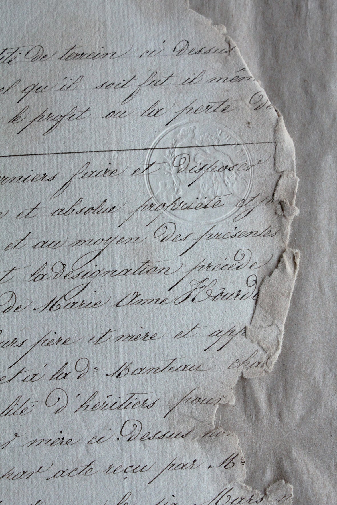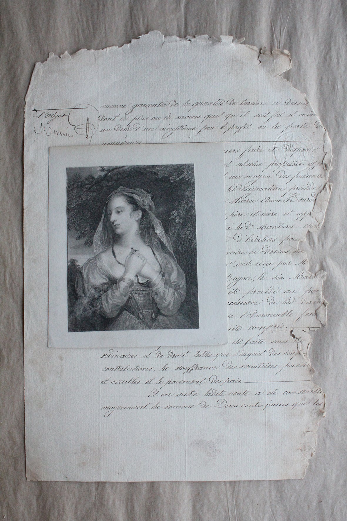 Layered here are two examples of old paper, one a French hand written page from an old law firm and the other a beautiful etched portrait of an actress in character. Both in well travelled condition but hold so much detail to either frame or use within a special project.