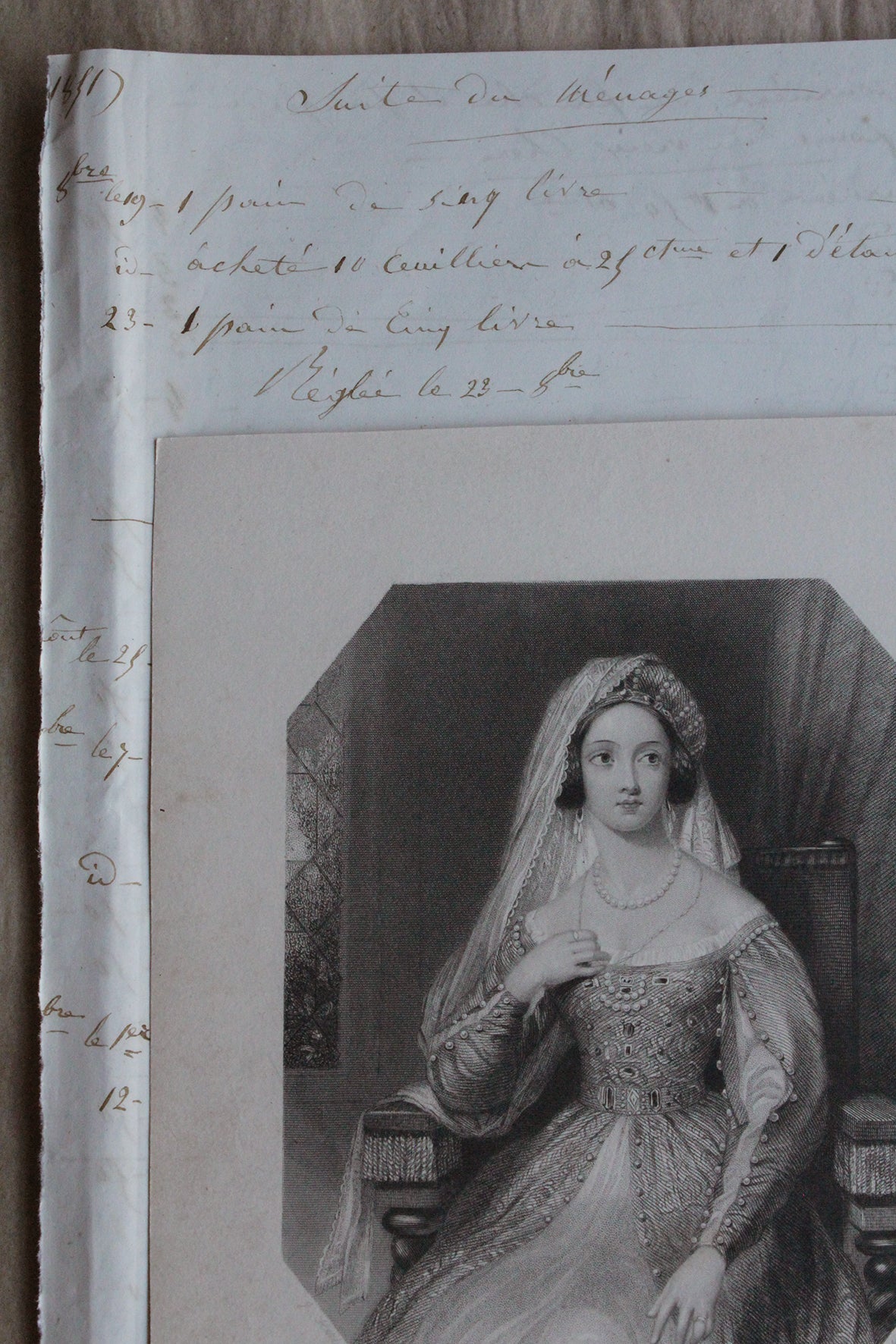 Layered here are two examples of old paper, one a French hand written page from an old law firm and the other a beautiful etched portrait.  Both in well travelled condition but hold so much detail to either frame or use within a special project.