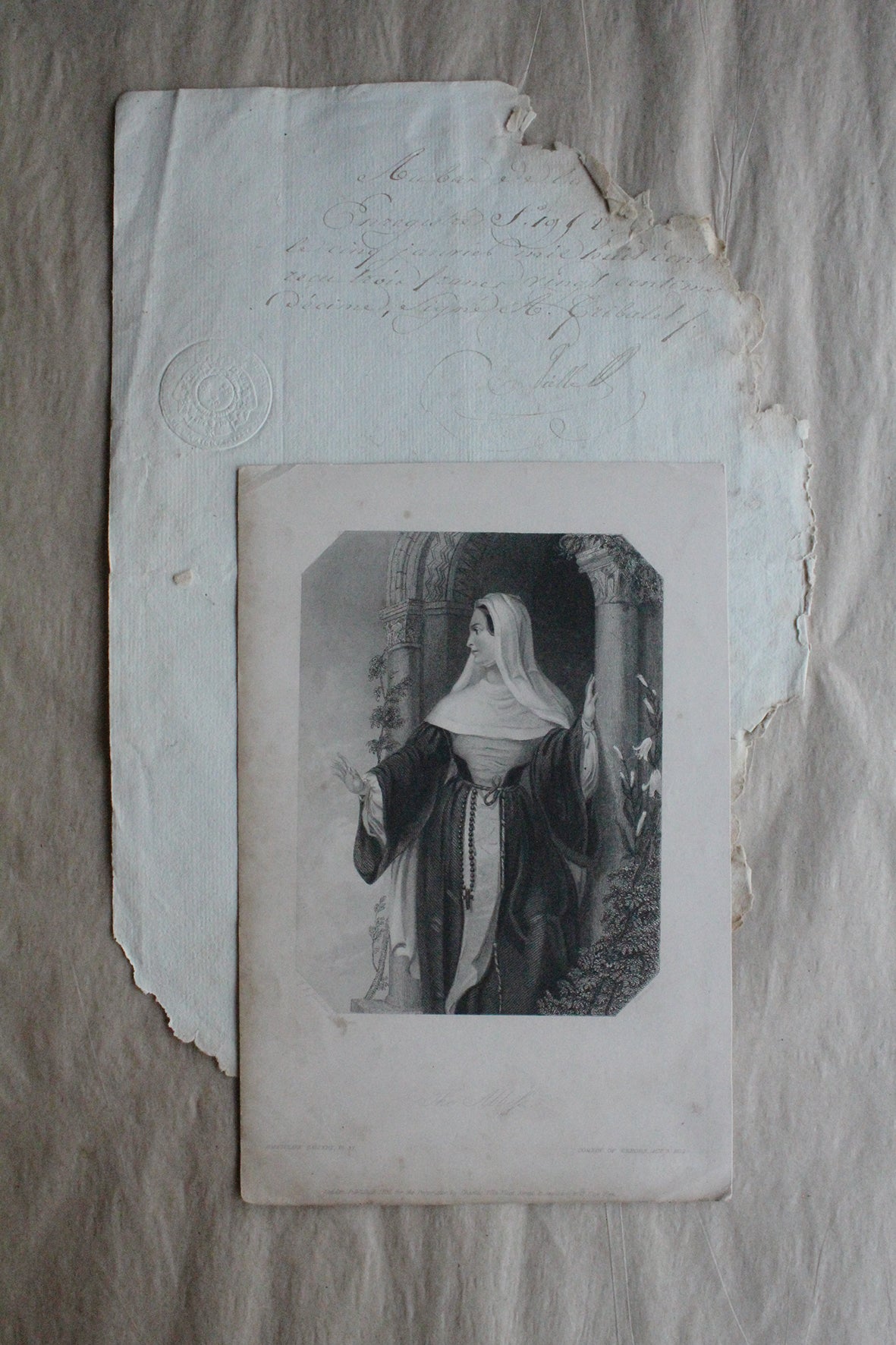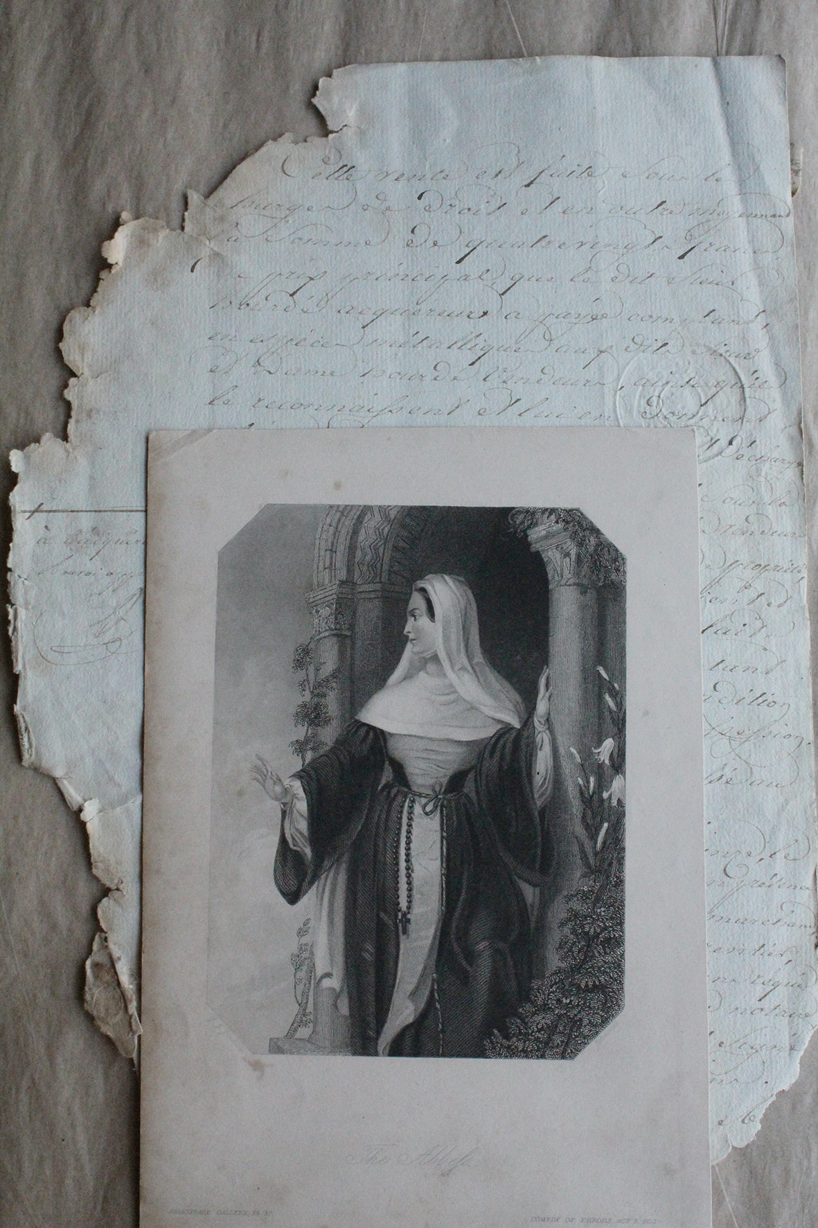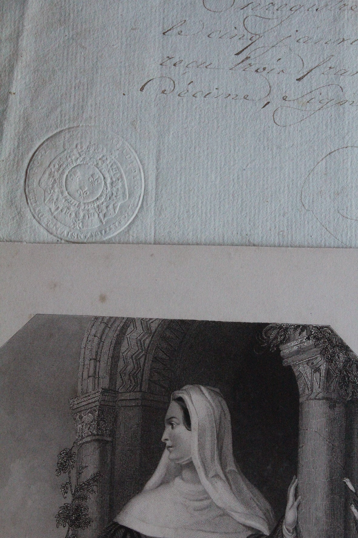 Layered here are two examples of old paper, one a French hand written page from an old law firm and the other a beautiful etched portrait. Both in well travelled condition but hold so much detail to either frame or use within a special project.