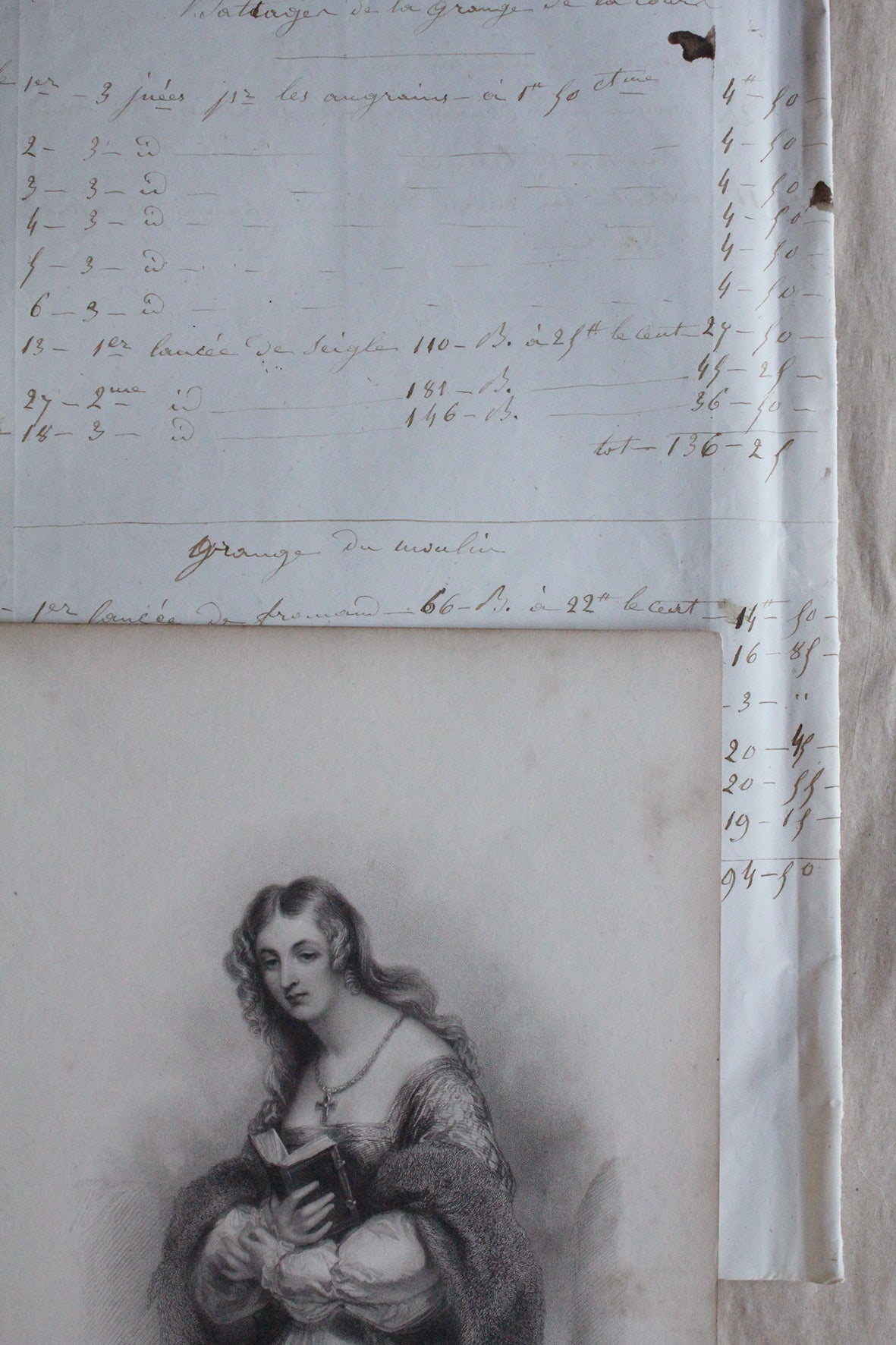 Layered here are two examples of old paper, one a French hand written page from an old law firm and the other a beautiful etched portrait. Both in well travelled condition but hold so much detail to either frame or use within a special project.