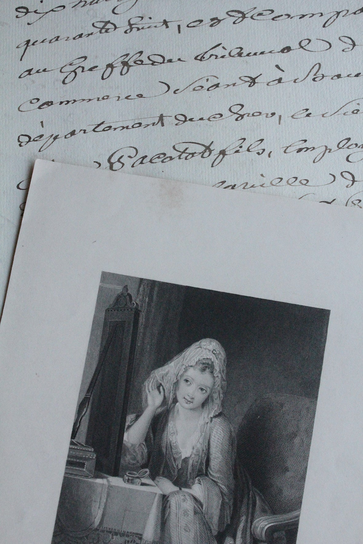 Layered here are two examples of old paper, one a French hand written page from an old law firm and the other a beautiful etched portrait.  Both in well travelled condition but hold so much detail to either frame or use within a special project.