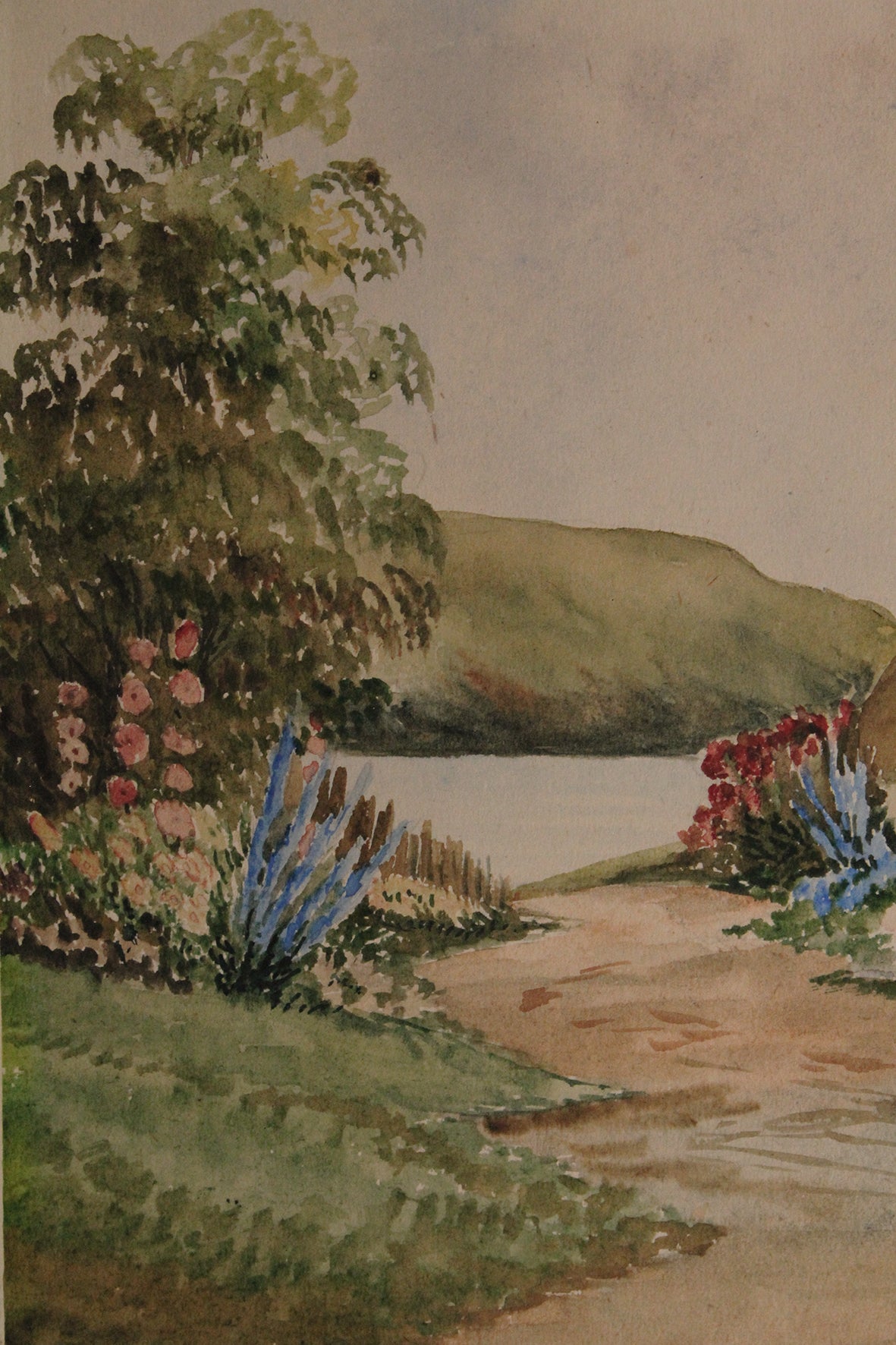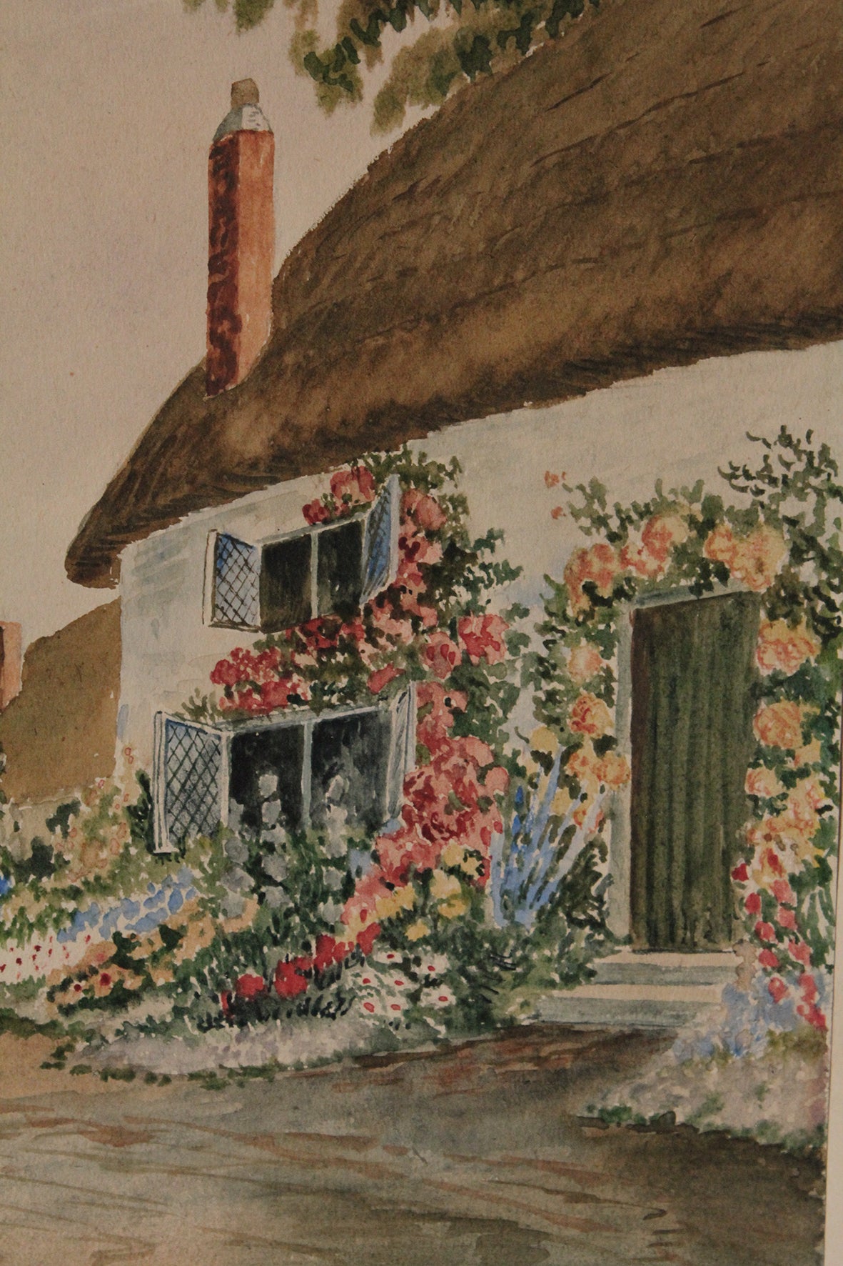 Beautiful old watercolour of a thatched cottage detailed with flowers and small beautiful brush marks.