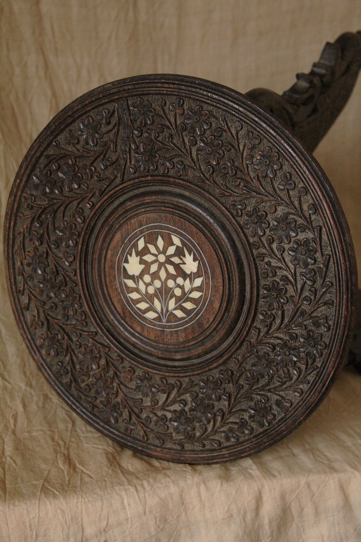 Highly decorative with carved vine and foliage details to the legs and the top is carved with an inlay decoration of ivory or another type of bone (popular for its time) in a foliage design.