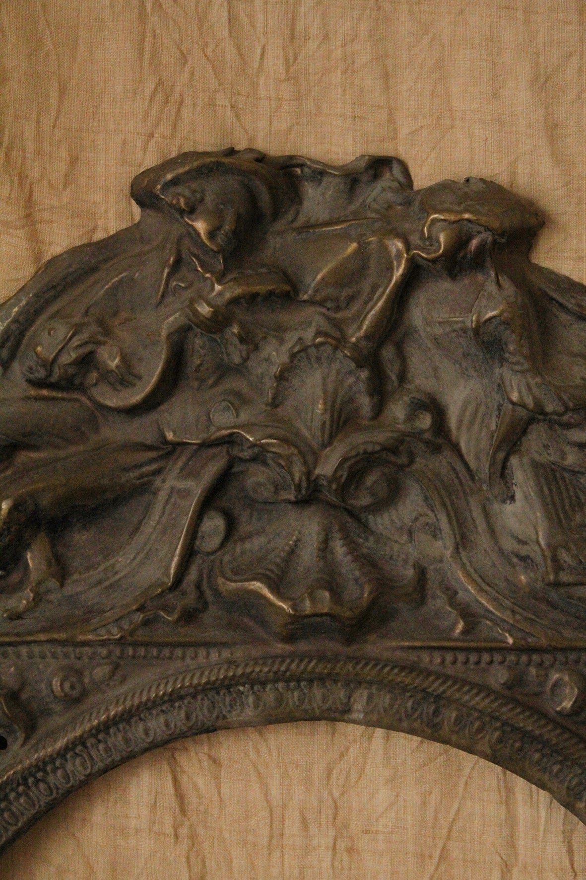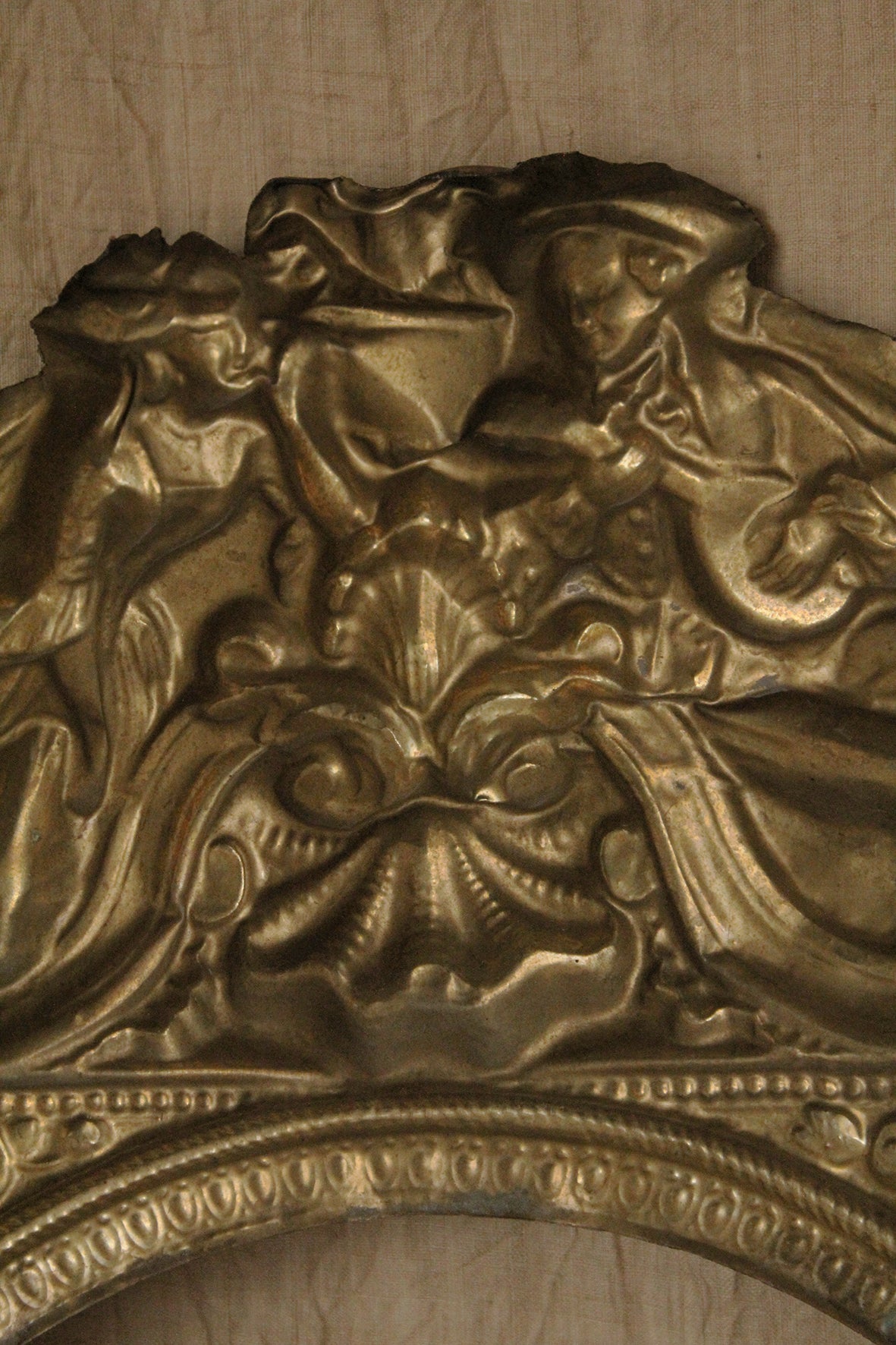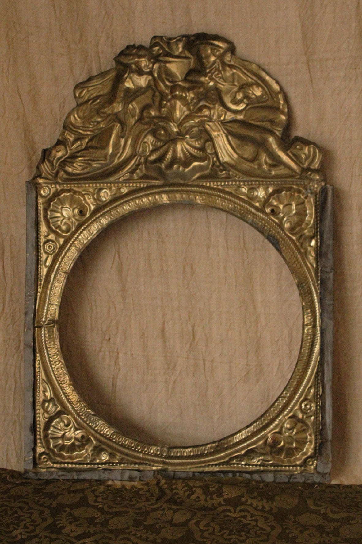 This piece is exquisite. It is well worn and travelled and most of the gild has worn away. It is a decorative mount that would have originally framed a clock face. Possibly French. To the top sit two lovers, he is courting her with gentle tunes from his mandolin. There are a fair few scalloped motifs throughout. The detail is still wonderful on the inside where the gilt is highly present and the decorative detailing is more present.