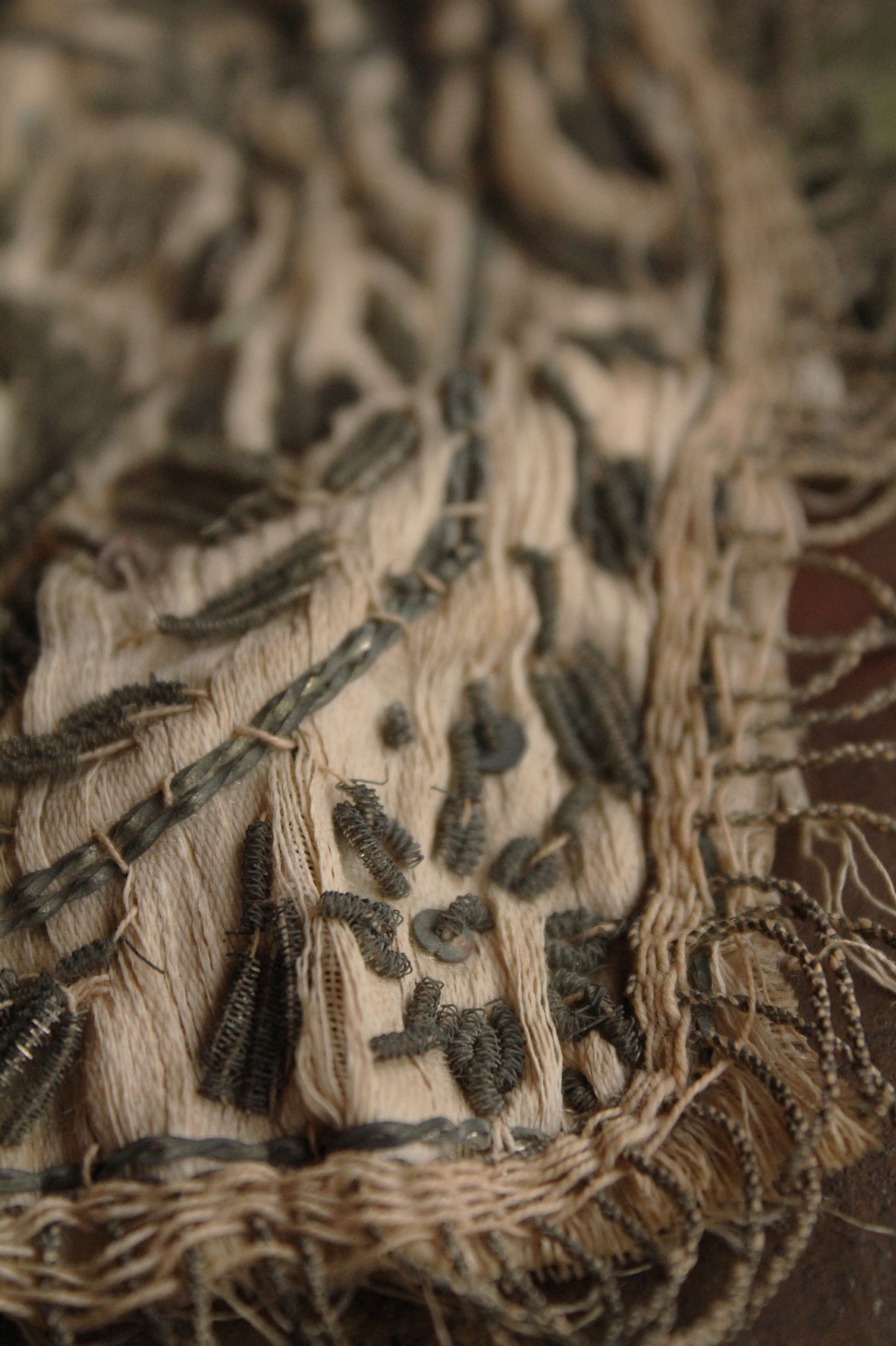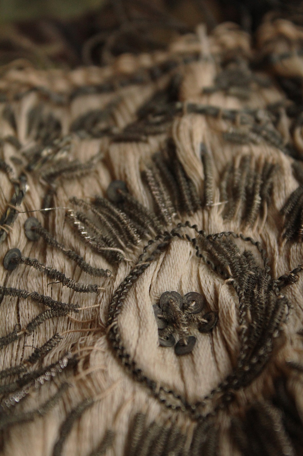 An old silk mat that has been hand stitched and decorated with metal sections to give the illusion of stitches but the motifs and lines are actually made up of tiny metal coils, the fringe is metal too but the thread seems to have dulled slightly and in the centre are a small collection of metal sequins.