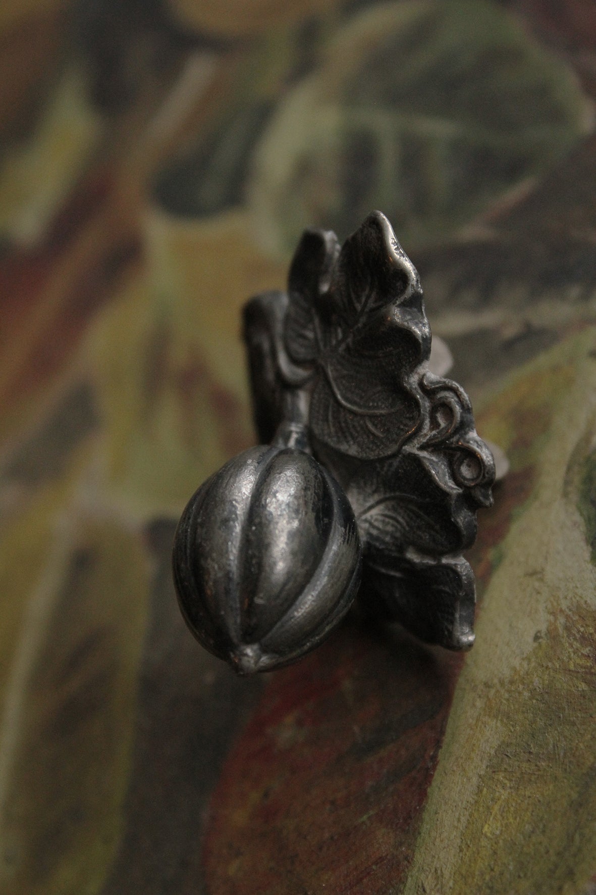 A sweet old worn handle in a formed gourd and leaf design.
