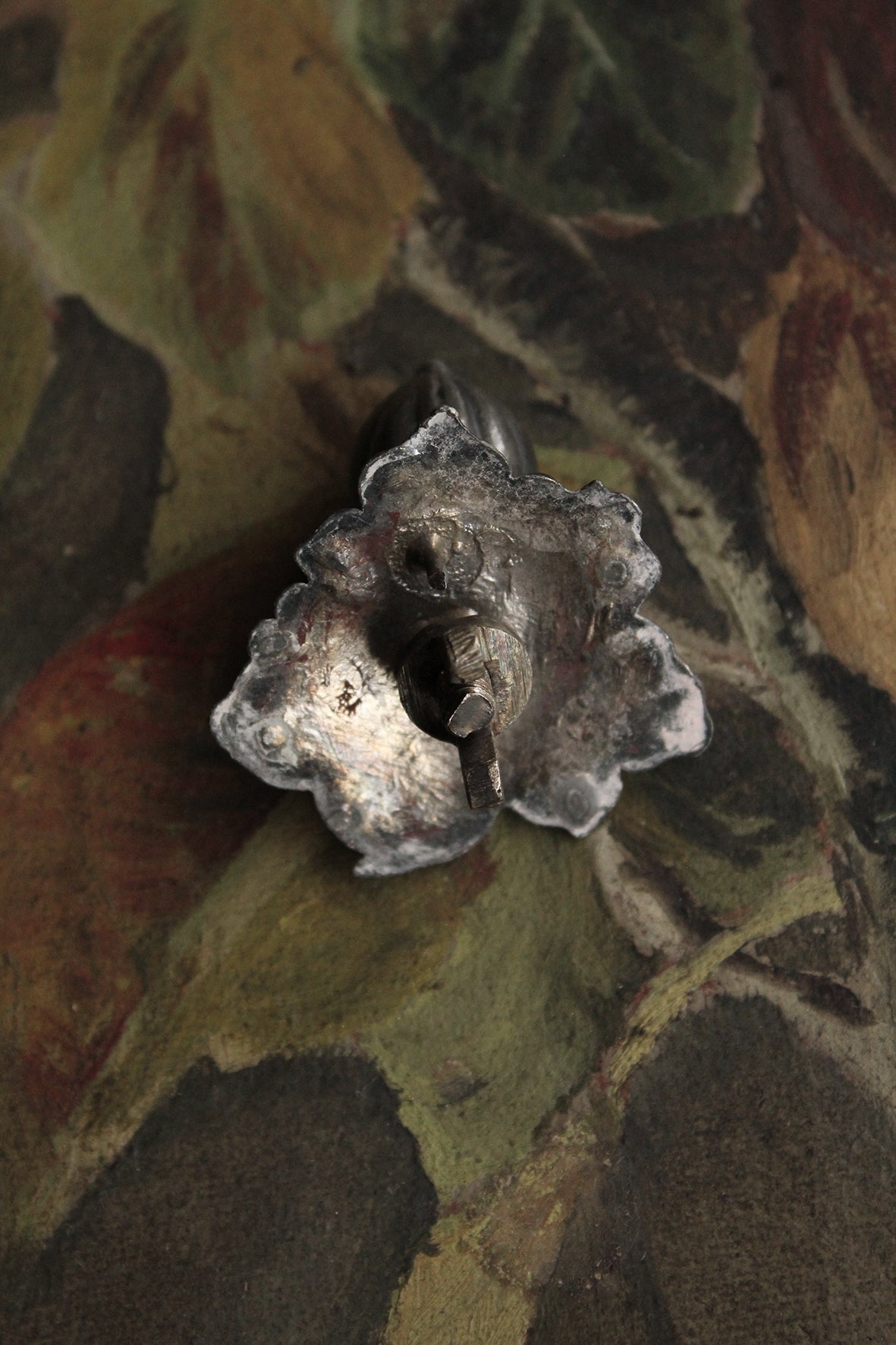 This is from an old Victorian teapot lid but it still has the old brass wingnut on the back and is perfect to fix to an old cupboard or something similar.