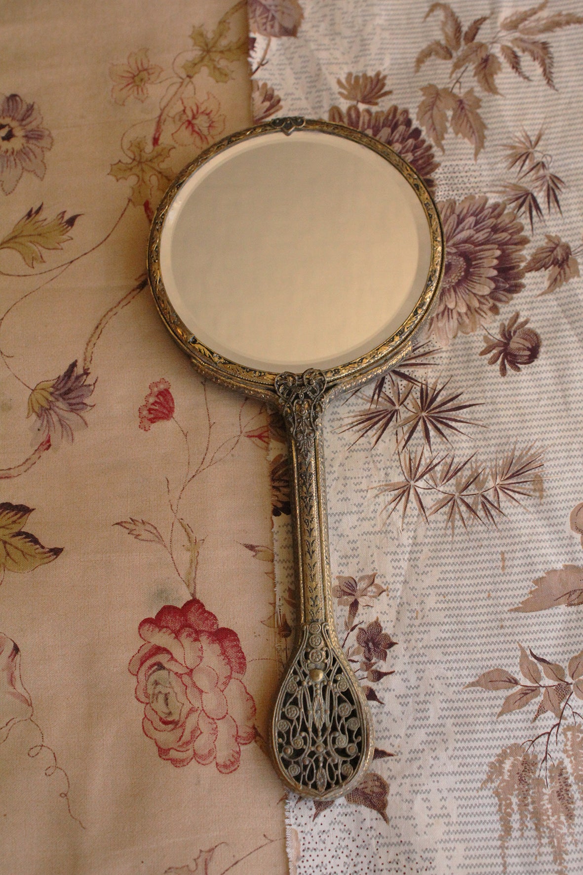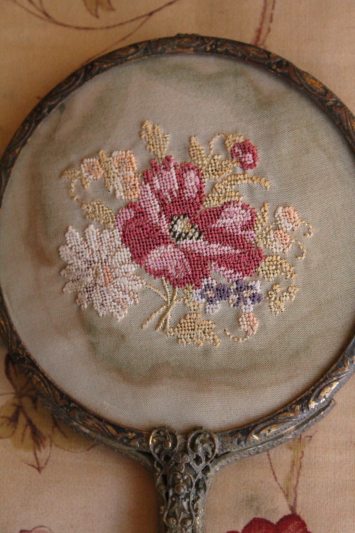 A wonderful old vanity hand held mirror that is layered with so much detail. Decorate along the handle and edge of the mirror with a back that holds a panel of floral embroidered needlepoint on silk. The silk has become water marked at some point to its journey.