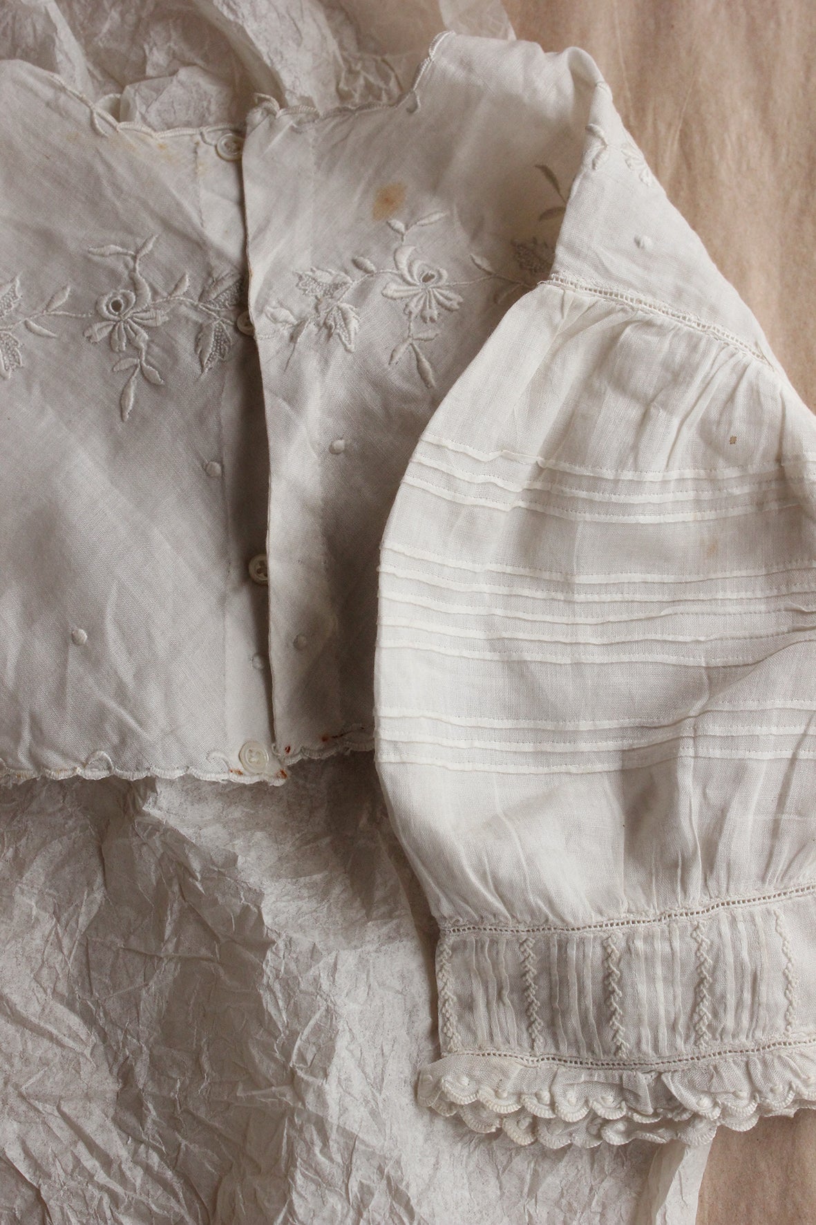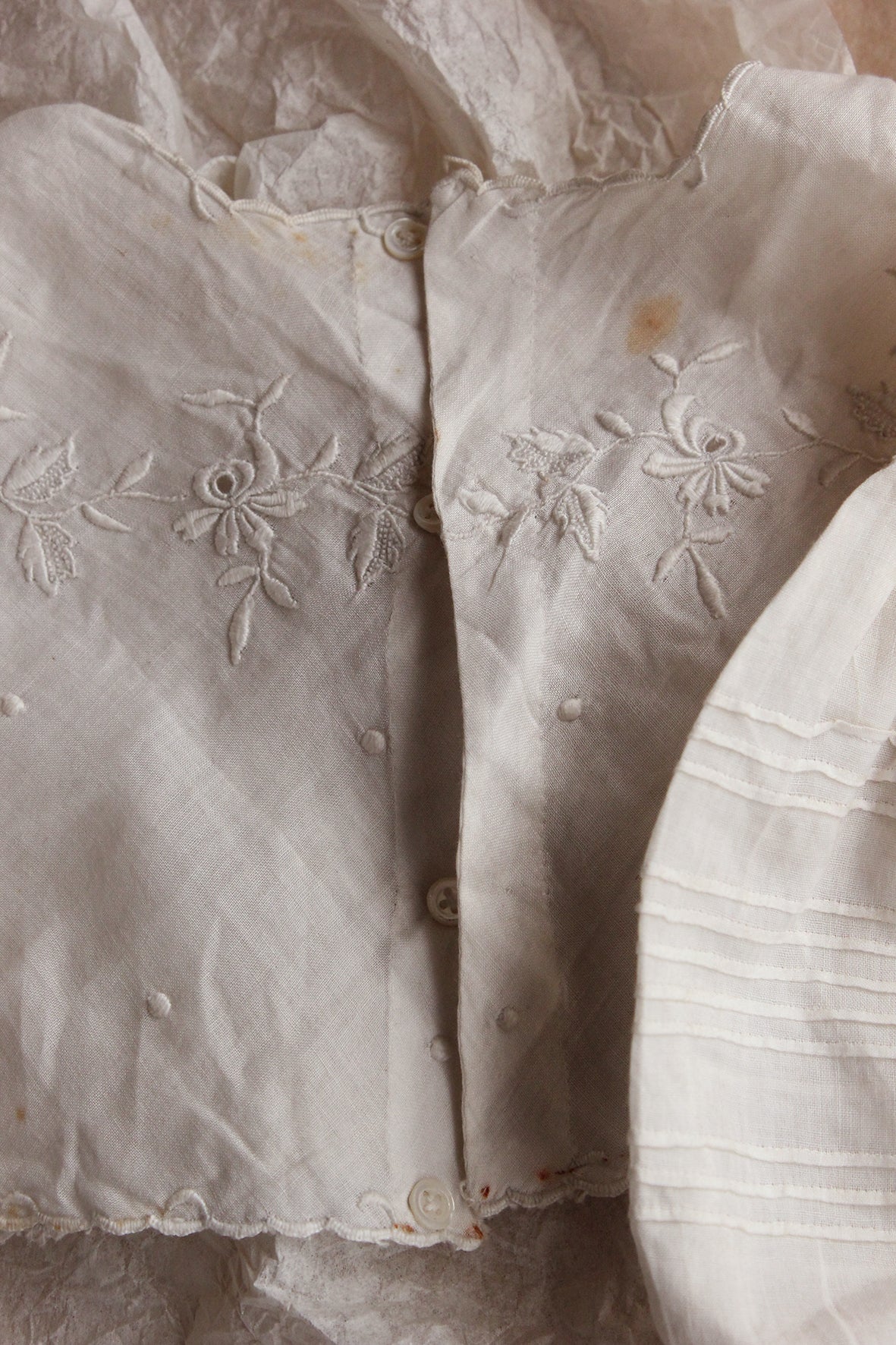 A beautiful babies over bodice with embroidered, eyelet and pleated details on a fine lawn. I have taken lots of photographs so you can see the delicate detailing. Buttons at the back with the original buttons. There are two small stains, one to the front and one to the back but the bodice is in good structural condition for age.