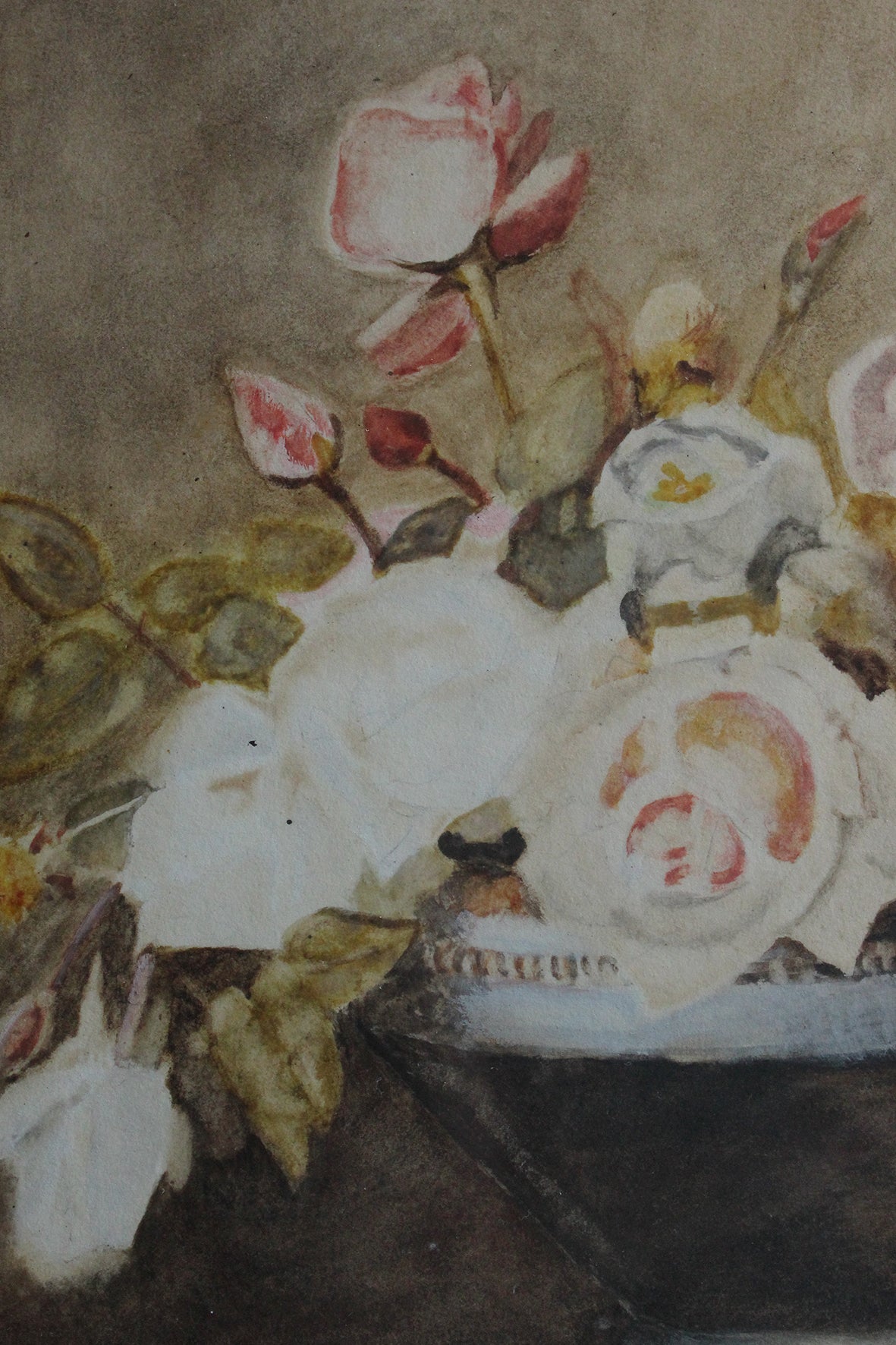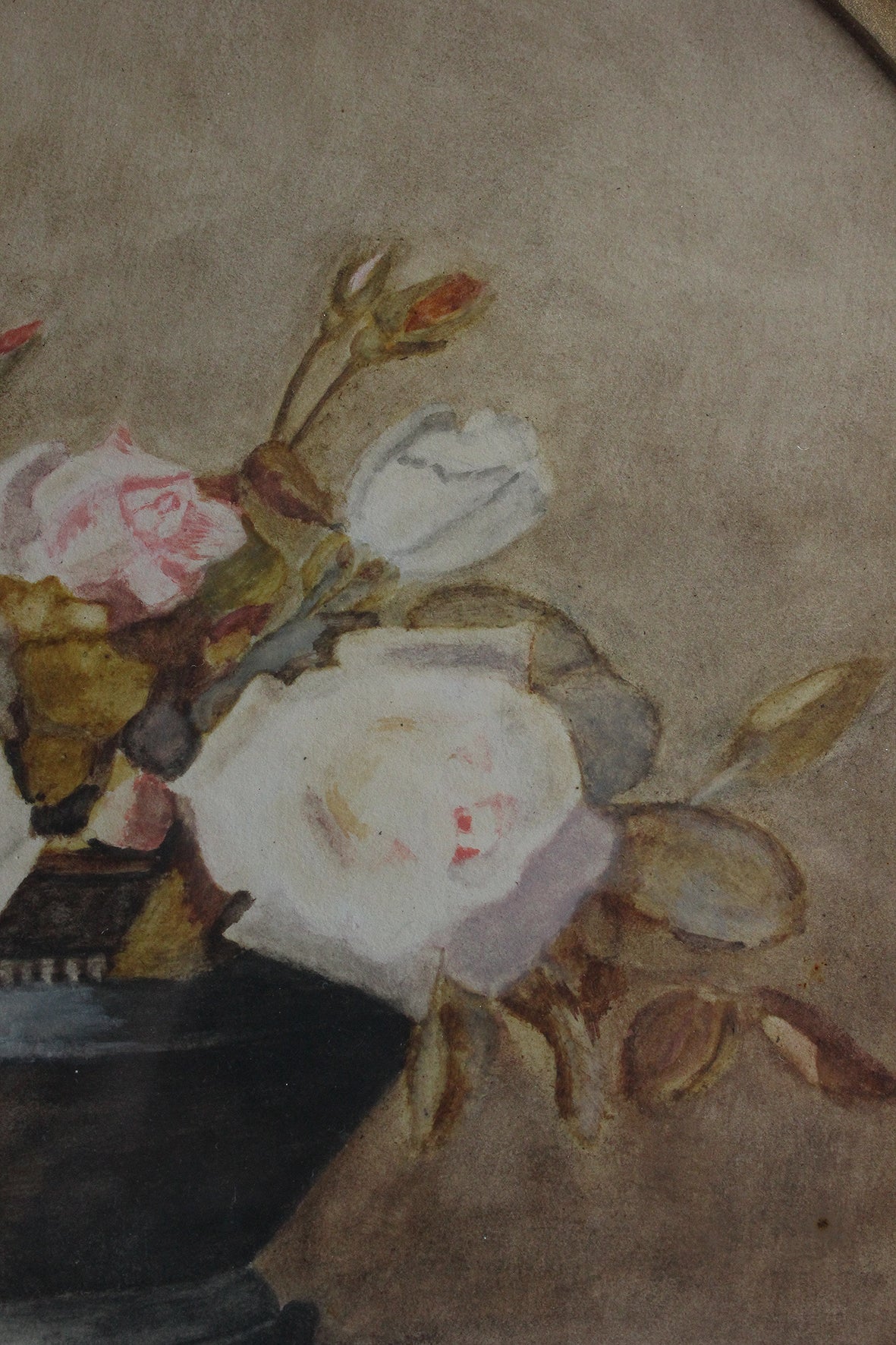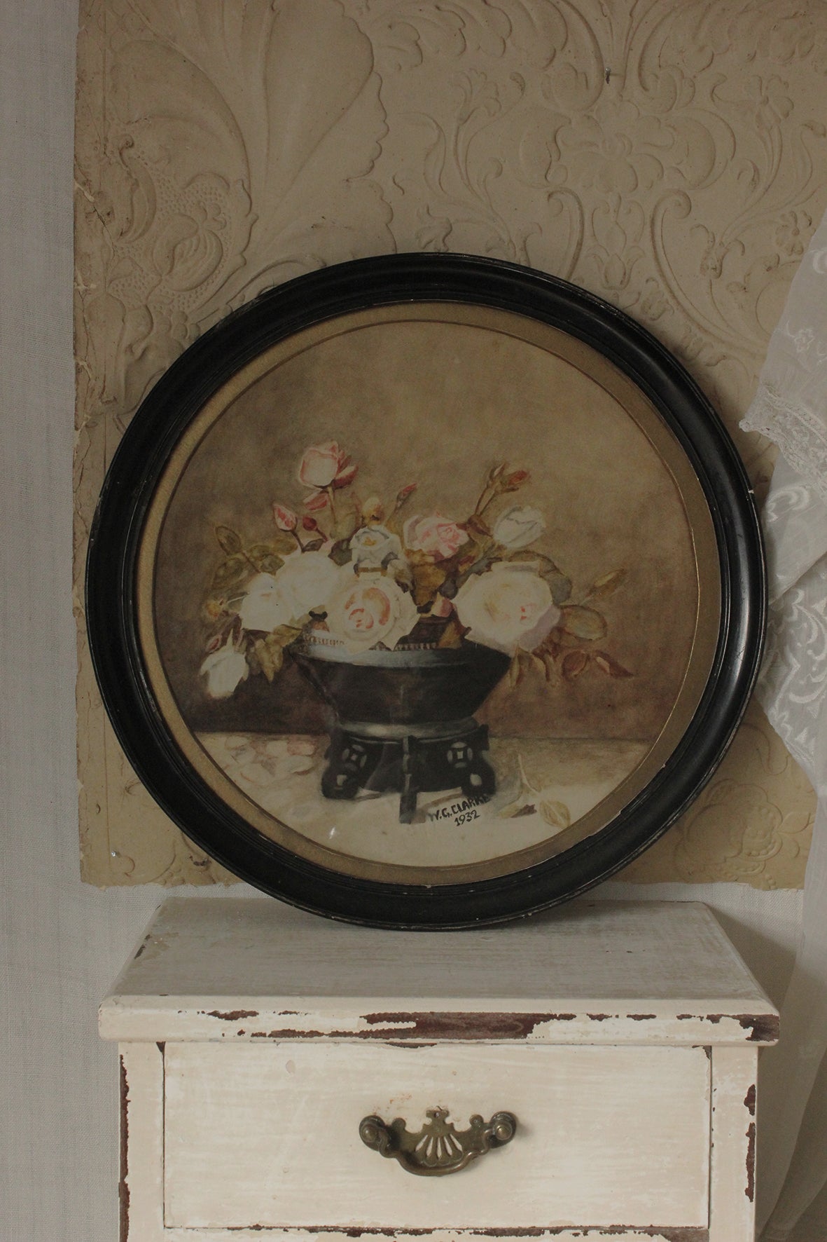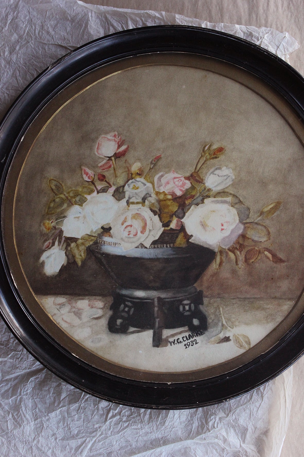 A beautiful old watercolour painting positioned in a simple black circular frame that is perfect to enhance the delicate details of the roses. A gentle and calm painting for a quiet corner of your home. The painting is signed and dated W.G.Clarke,1932 There are a fair few flaws to the frame from its journey but this ageing suits the watercolour far more than if it was in pristine condition.