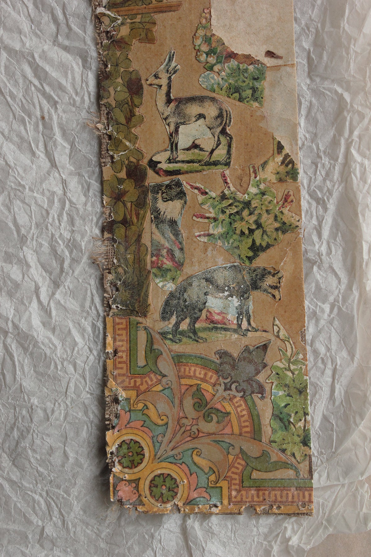 A beautiful and delicate reclaimed panel from an old Victorian screen. Filled with such detail that you can read like a story, look closely for the smaller details too. The individual paper pieces are fragile in places, the collage has been applied to a natural woven linen.