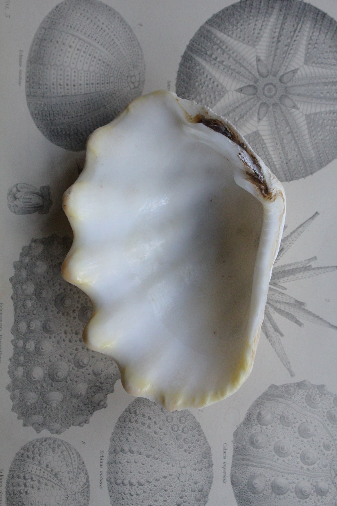 A beautiful old half clam shell, the kind of shell that can be decorative and practical as it is shaped to form a bowl/dish. You therefore have the choice to stand to show the decorative side to style in a calm corner of your home or stand upside down to form a dish to hold such things as rock salt on your kitchen table..