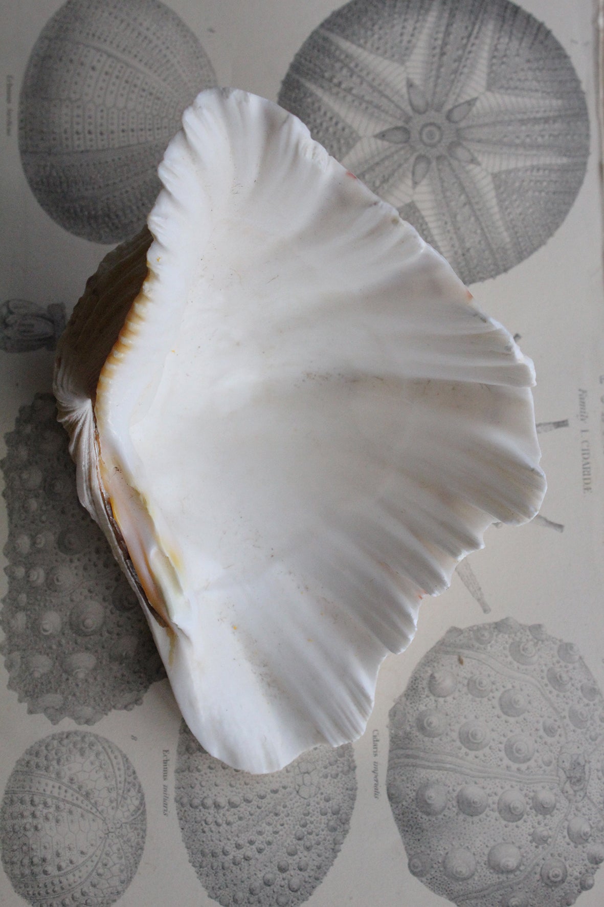 A beautiful old half clam shell, the kind of shell that can be decorative and practical as it is shaped to form a bowl/dish. You therefore have the choice to stand to show the decorative side to style in a calm corner of your home or stand upside down to form a dish to hold such things as rock salt on your kitchen table..