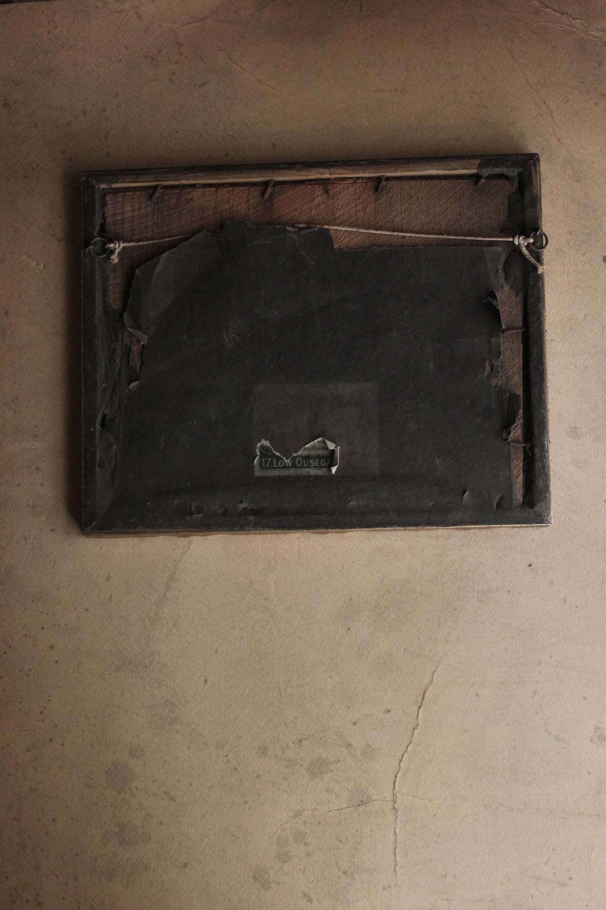 Original decorative frame (which is lovely) and backing. The backing is partly missing and loose in areas.
