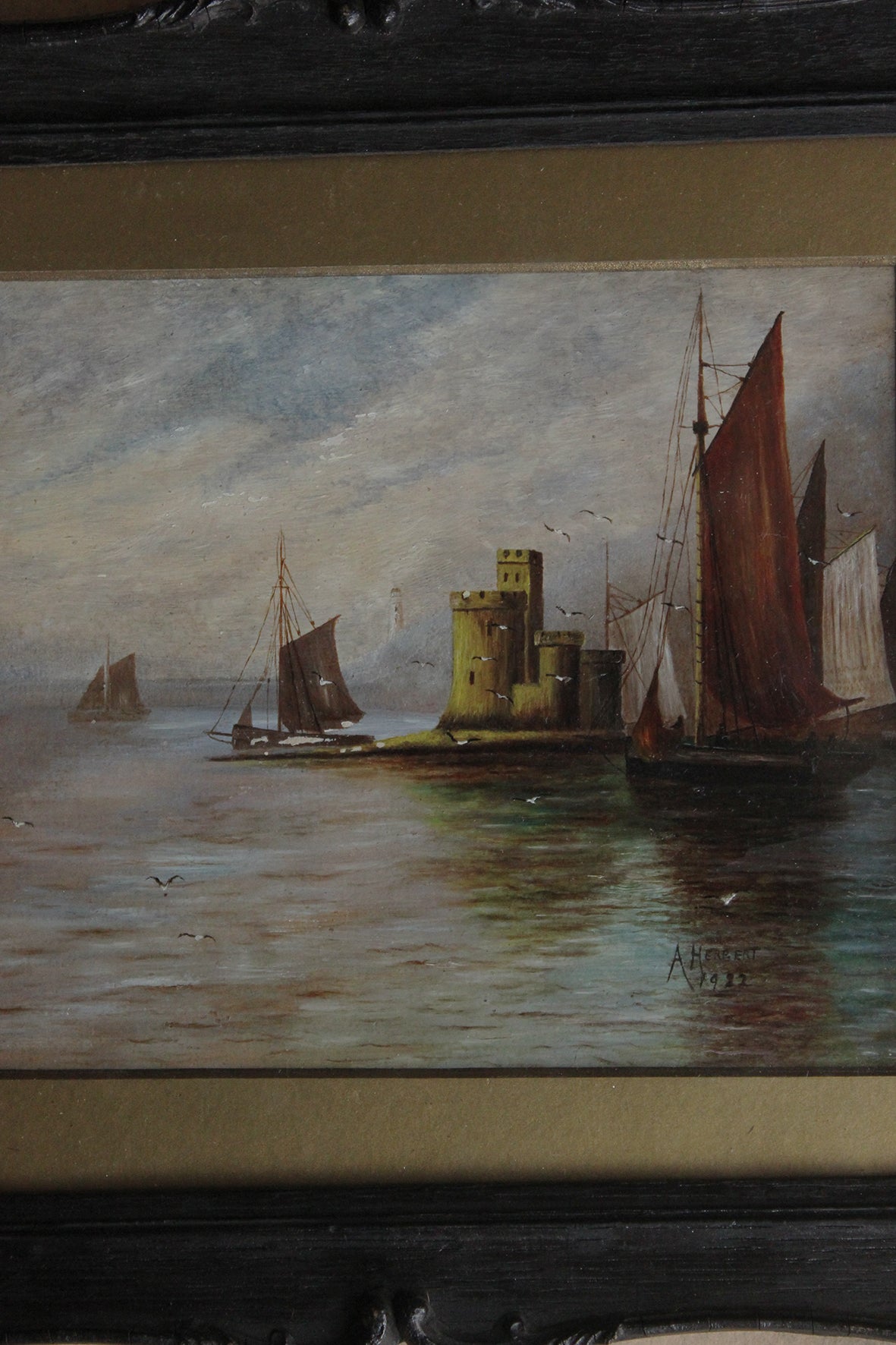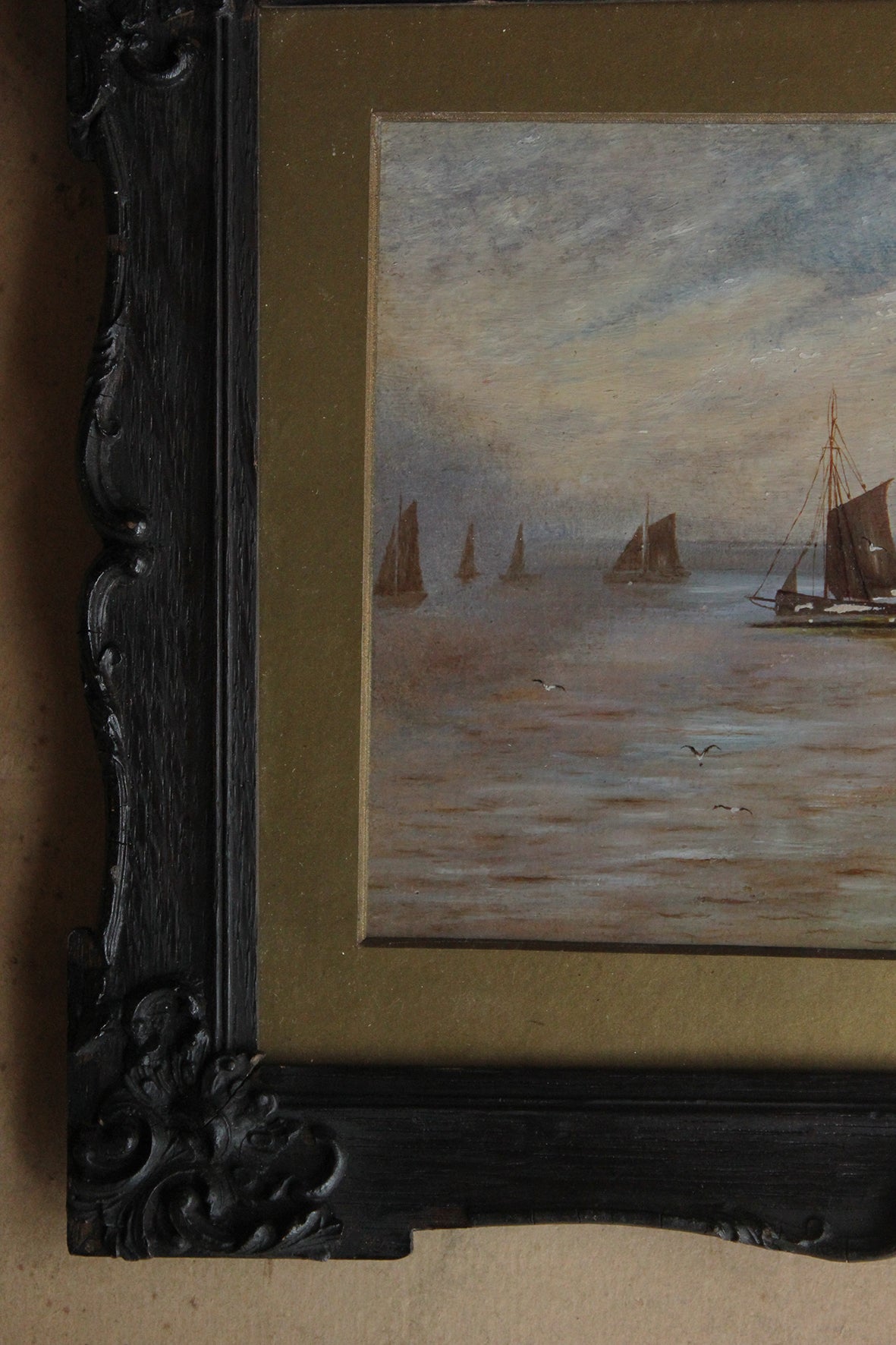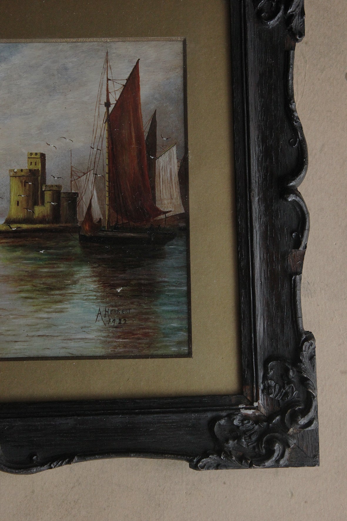 Original decorative frame (which is lovely) and the frame has been rebacked at some point on its journey. The frame has beautiful moulded detailing with a damage here and there where some details have broken away. There is also some small fragments of paint loss to the small little boat that sits central to the painting