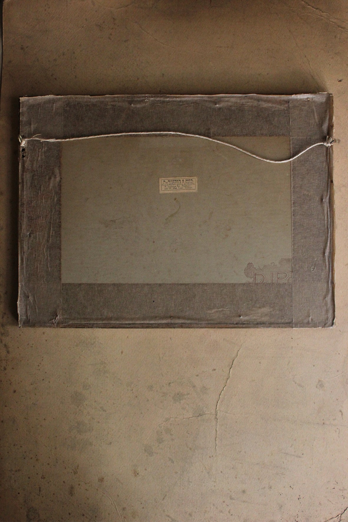 Frame measures 36cm x 27cm, it is the original frame. The back has been finished with framers tape some time ago to re-strengthen the attachment of the backing board to the frame. The mount has been hand gilded and has some marks with a crease to the top right corner. All these slight imperfections add to the character and beauty of this piece.