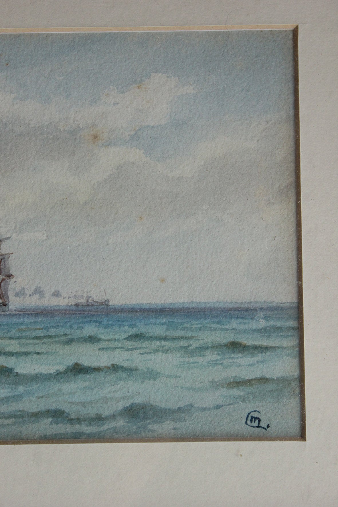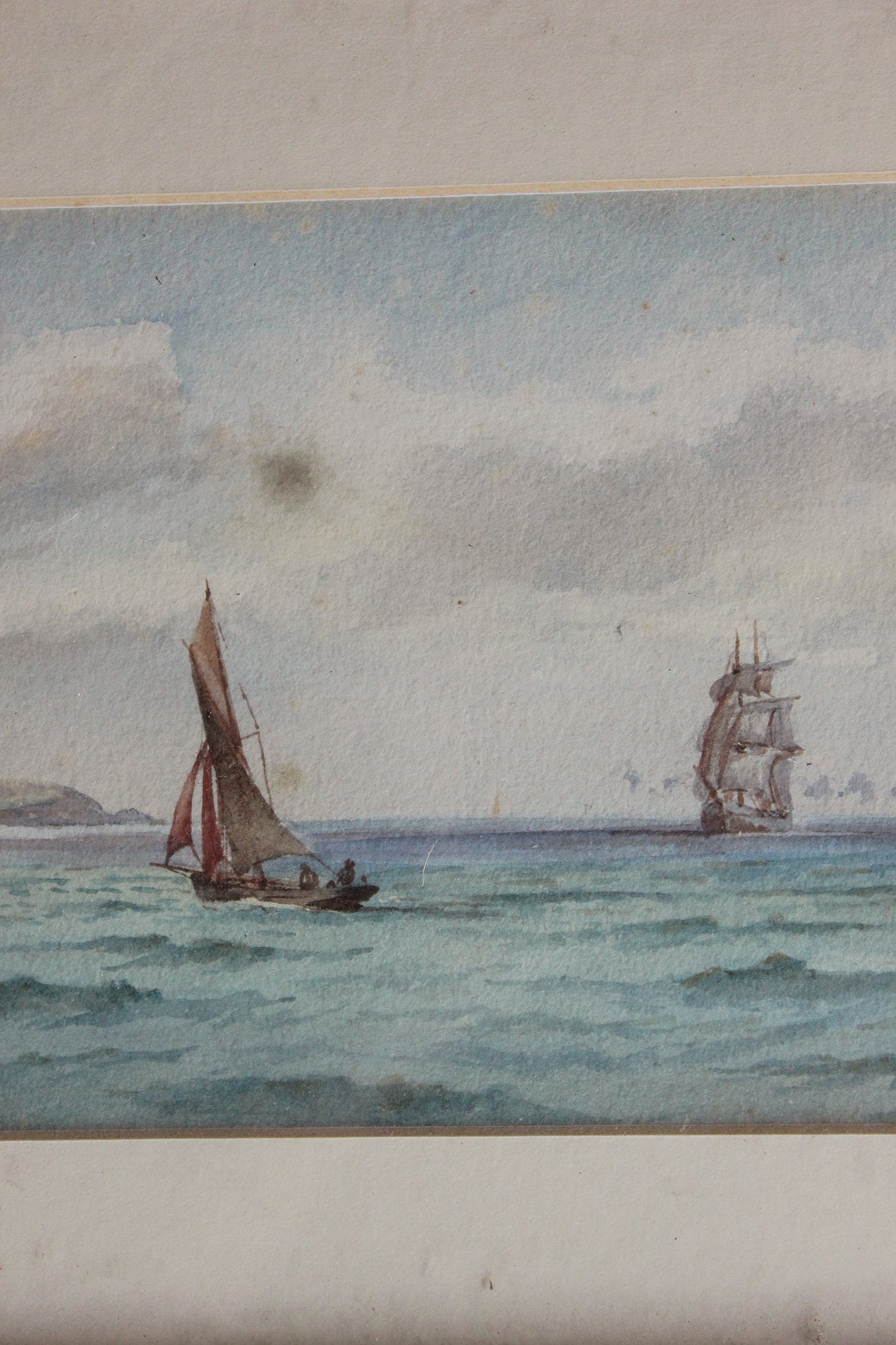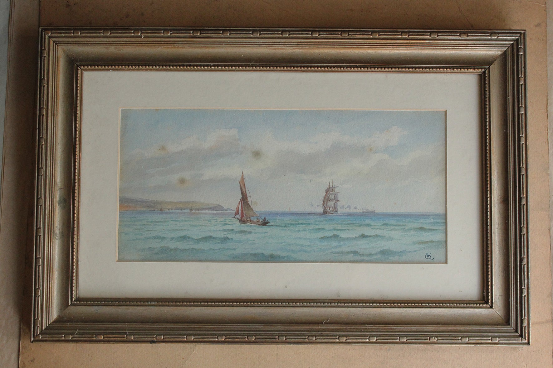 A rather lovely old watercolour that is sensitive in its execution. The passing of ships and boats into a bay. The horizon is very reminiscent of the North Yorkshire Coast but as all paintings we can imagine them to be anywhere....