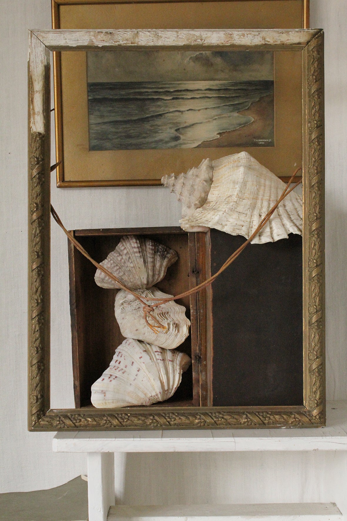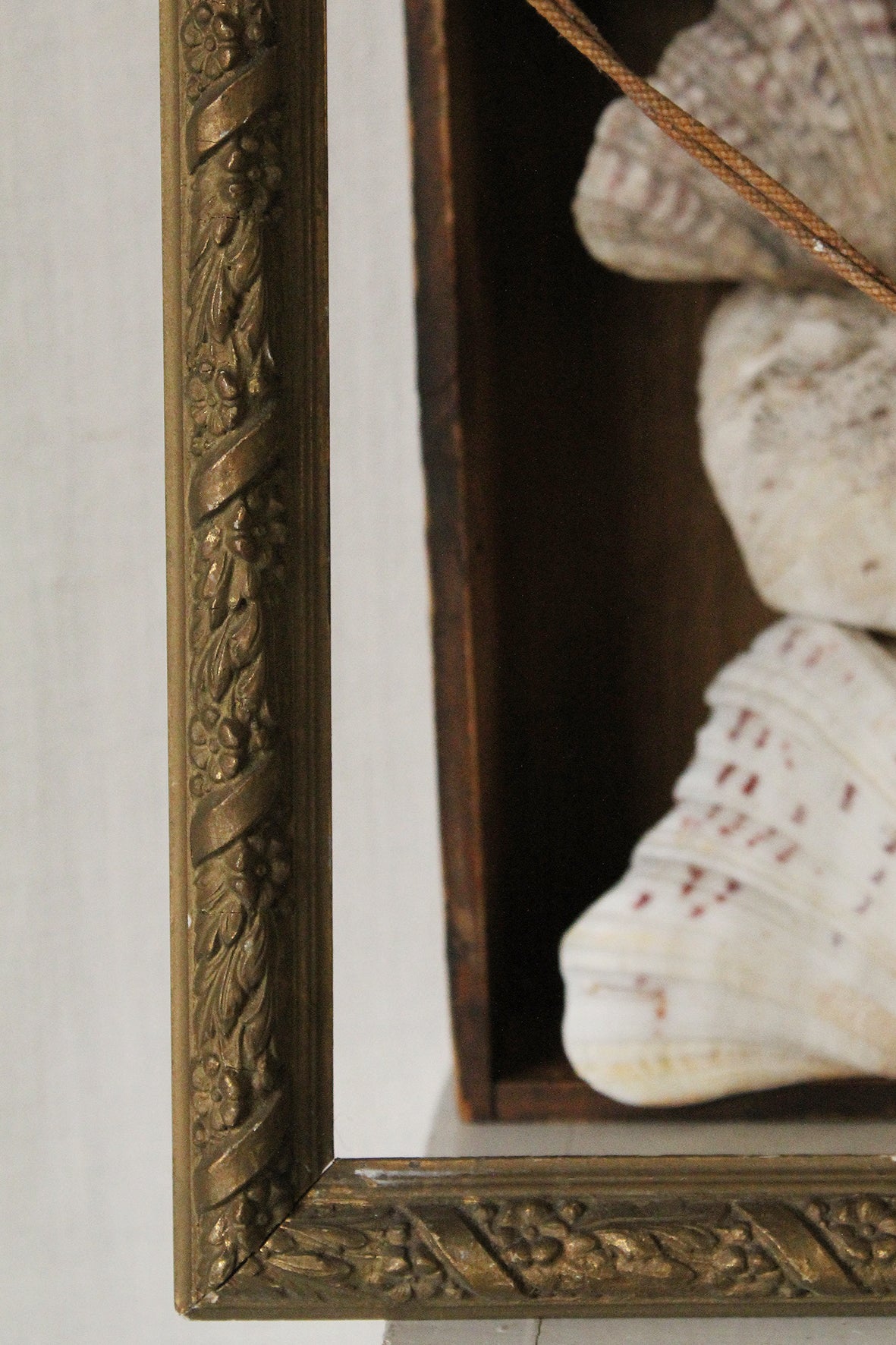 A perfectly imperfect old decorative frame where part of the plaster moulding has been removed on its journey. Empty frames look rather lovely just hanging on their own on a wall especially if you place a smaller empty frame inside another slightly off centre and playing with composition. A this time of year they are wonderful to hang on a wall and then tape a sculptural seed head inside to the wall to create a piece of art.