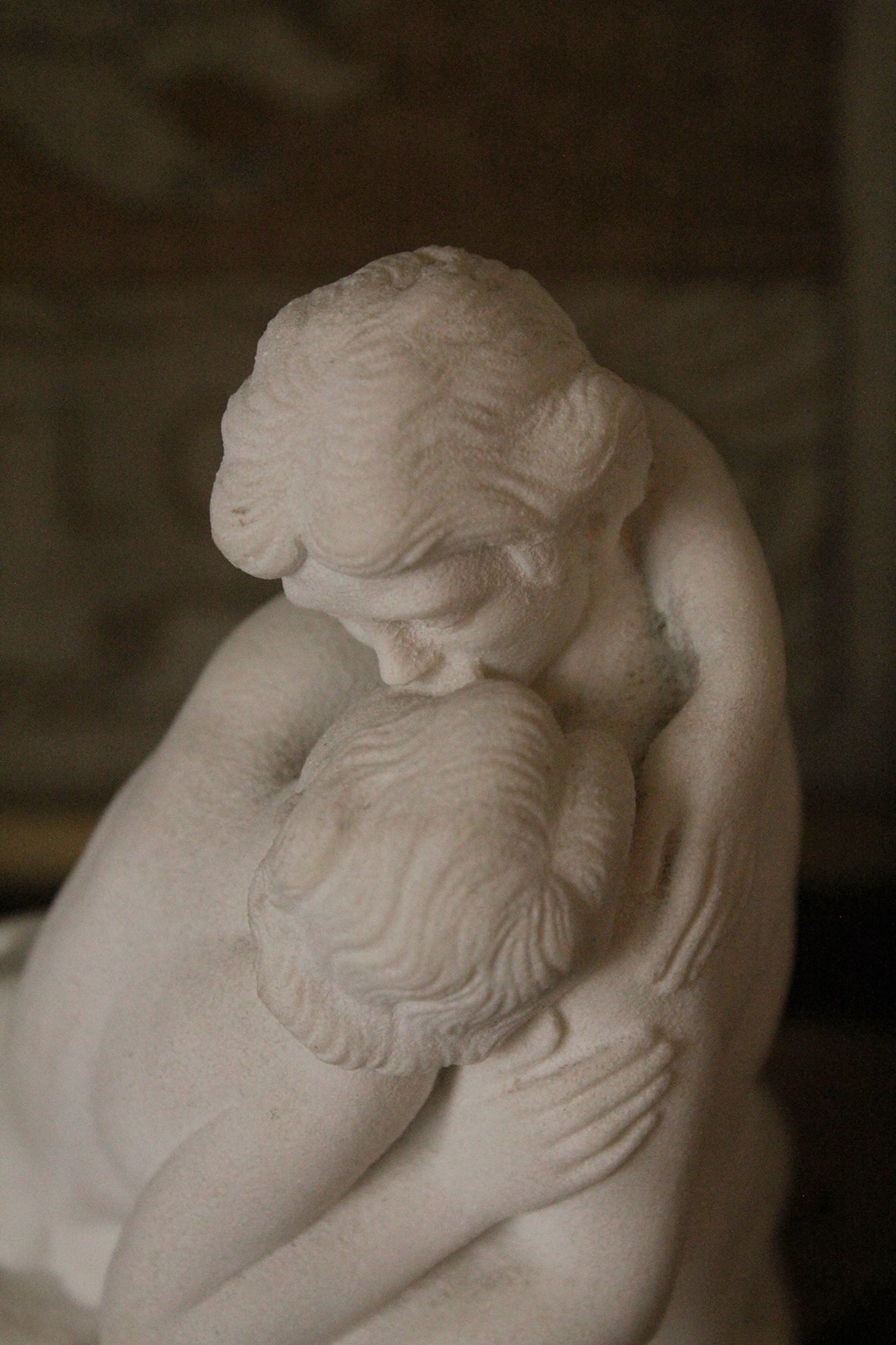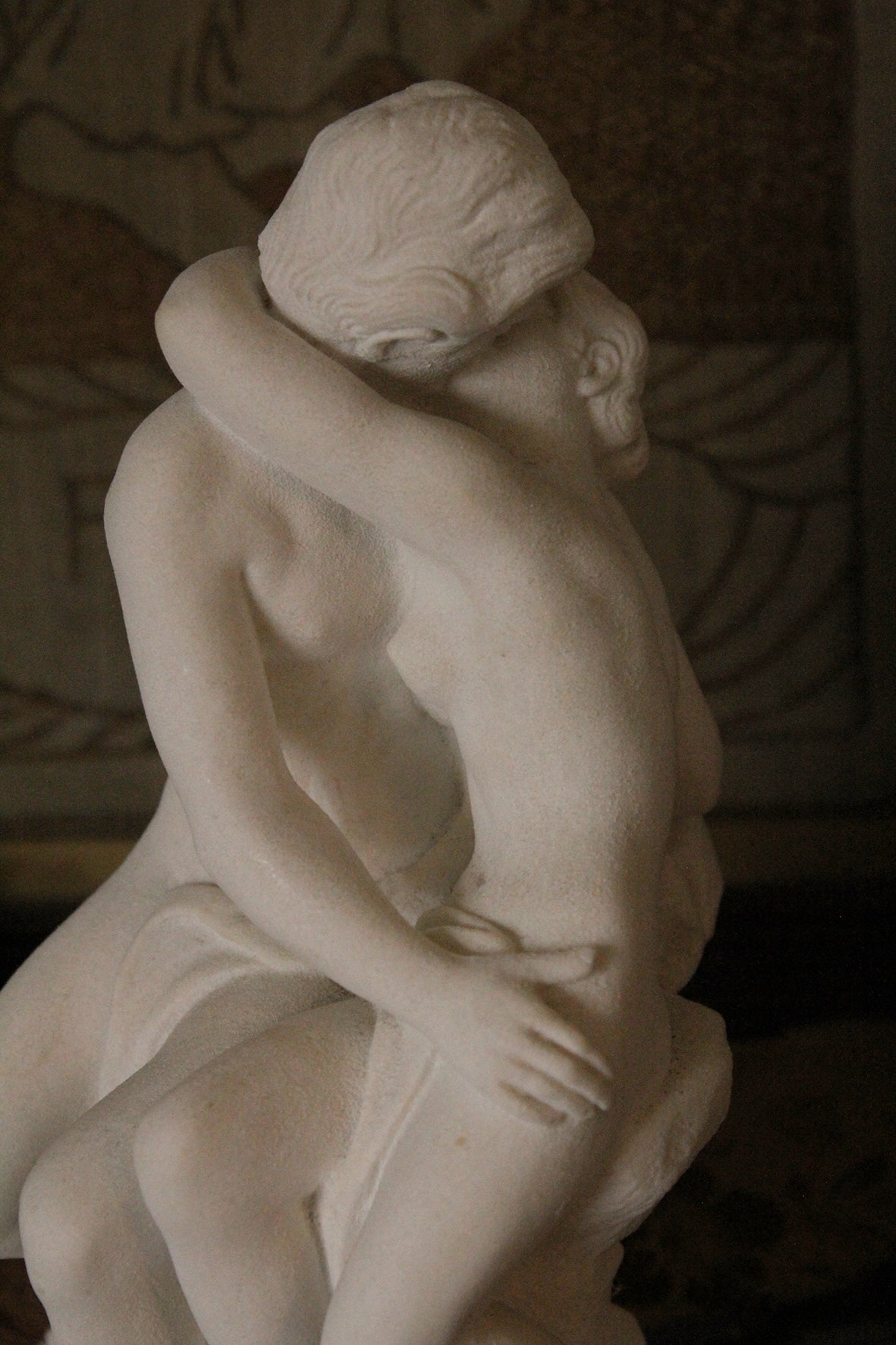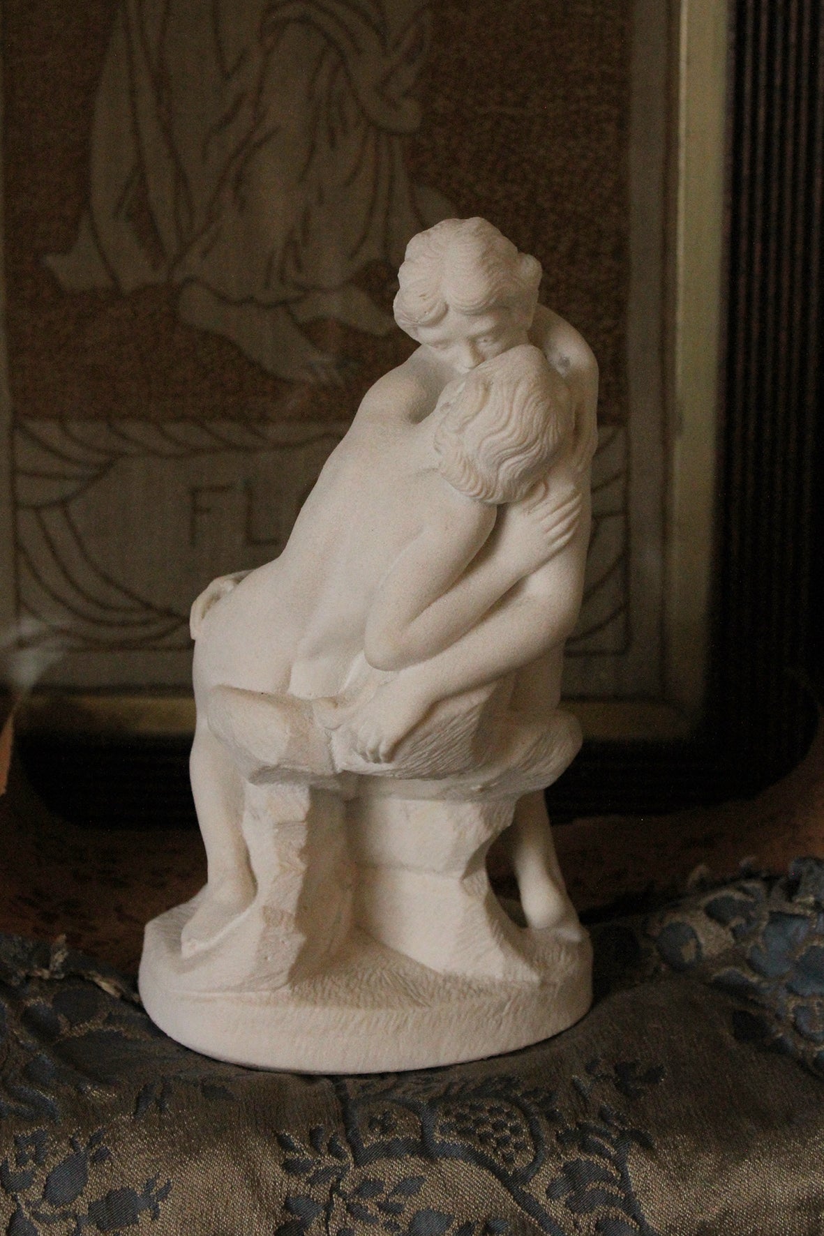 A vintage reproduction of Auguste Rodin's sculpture titled The Kiss. A wonderful romantic ornament for an equally romantic corner of your home.