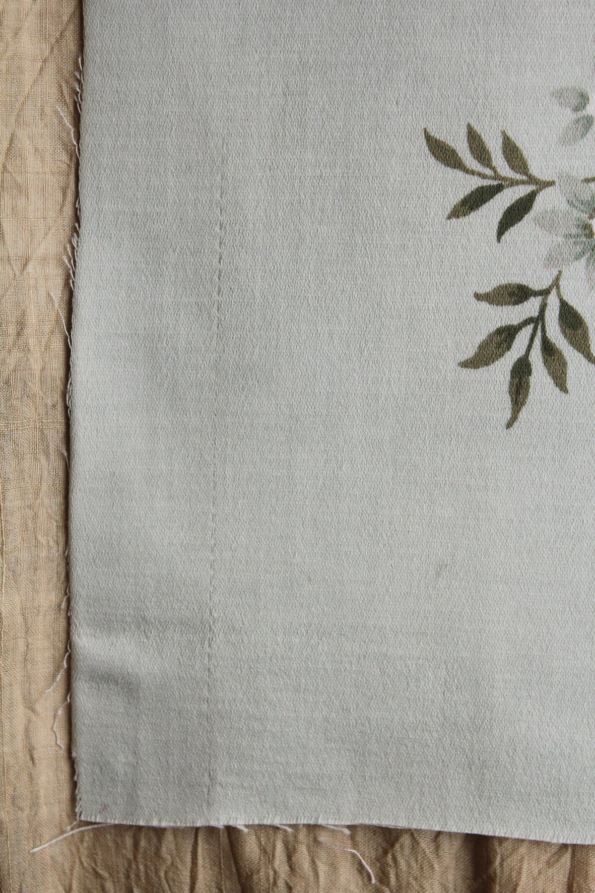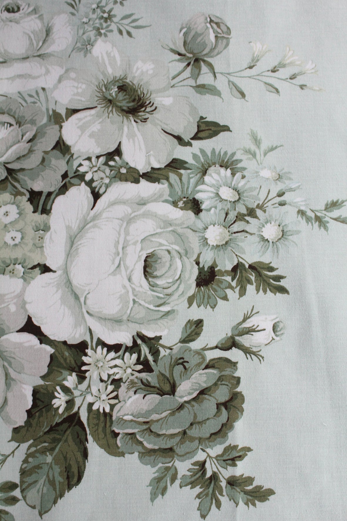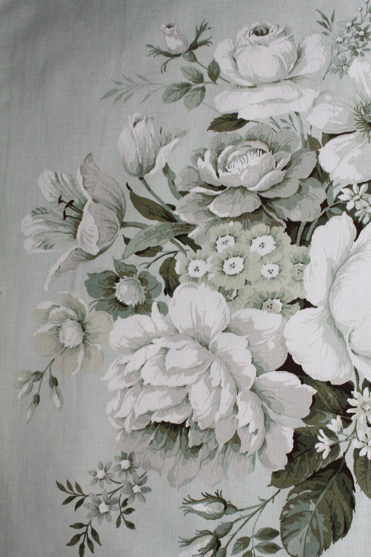 A gentle vintage floral Sanderson printed panel. Lovely soft mint green ground with complimenting green and grey tones within the flowers. This panel has an imperfection to one side which is a gentle thread pull about an inch in.