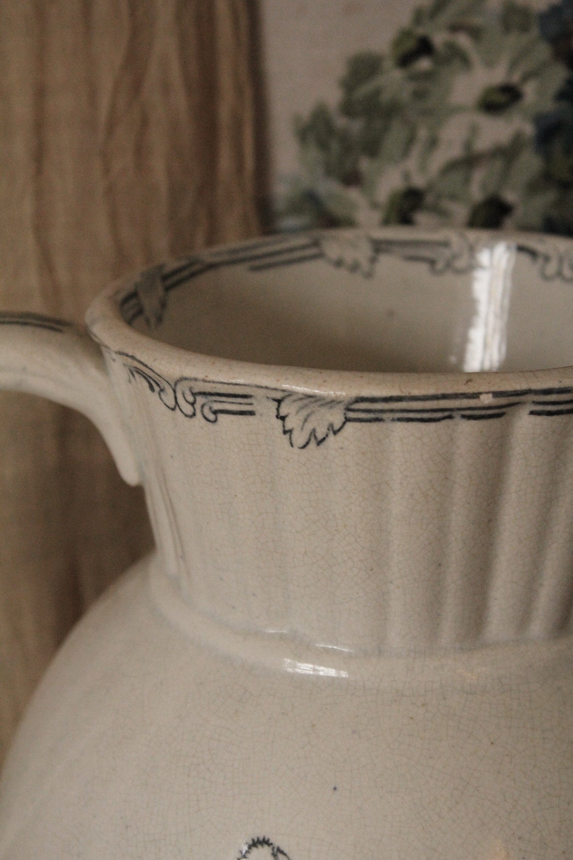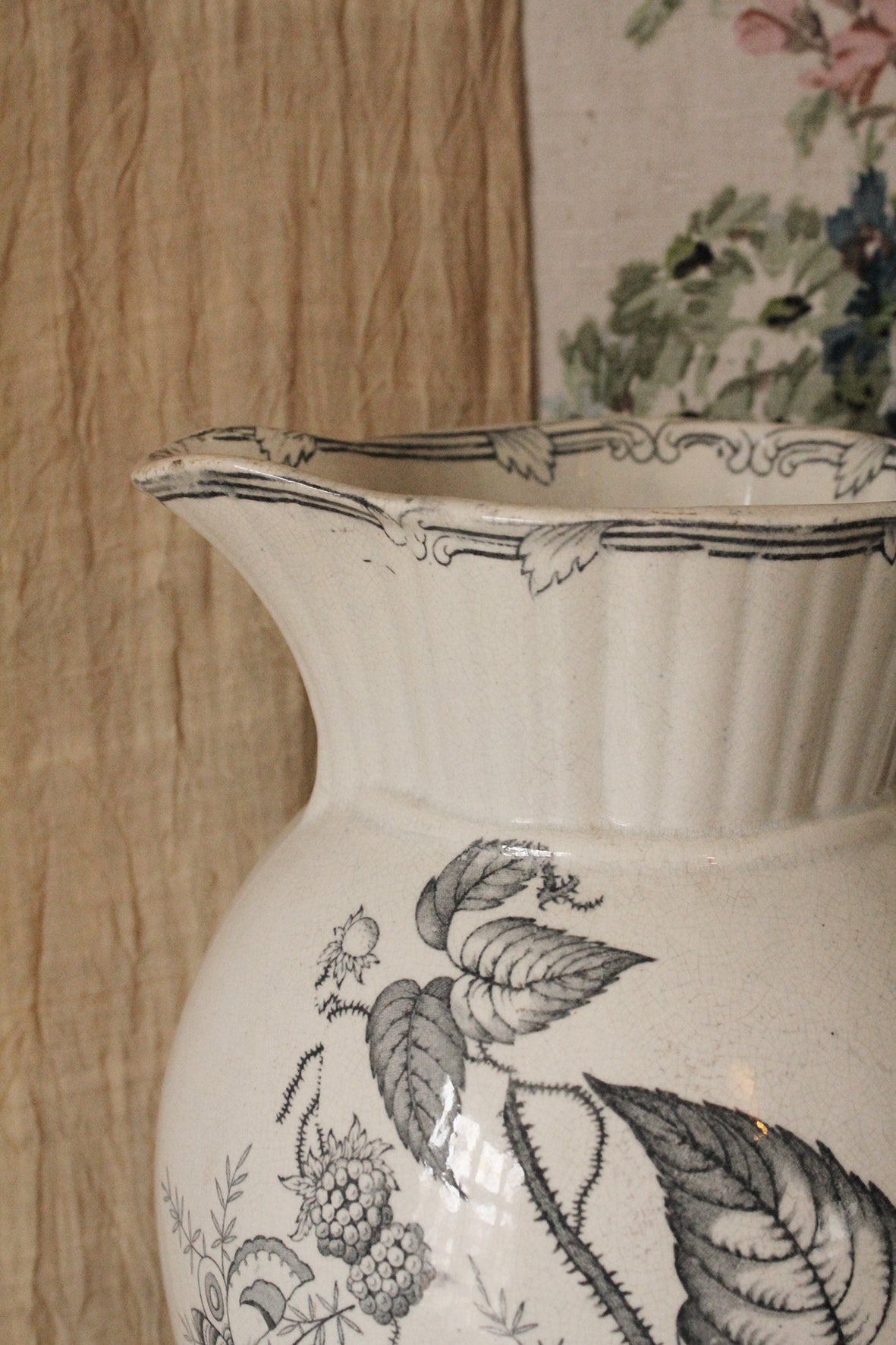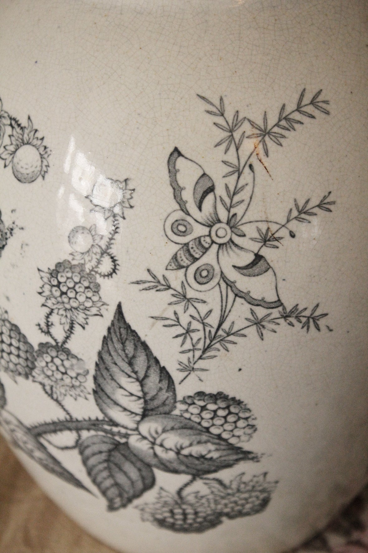 A wonderful old water pitcher that has a transfer linear design. Decorated with illustrated berry branches and a single decorative moth on both sides. The design differs on both sides. This pitcher is a very lovely shape indeed. The neck of the jug has a fluted wave finished with a detailed leafy transfer border that runs to the side of the handle too. In very very good condition for age just a little wear to the glaze where the nodule sits to the handle. I have taken lots of photographs to show you the detailing. Perfect for those larger foliage displays at this time of year or just beautiful to stand on its own in a quiet corner as a statement piece.