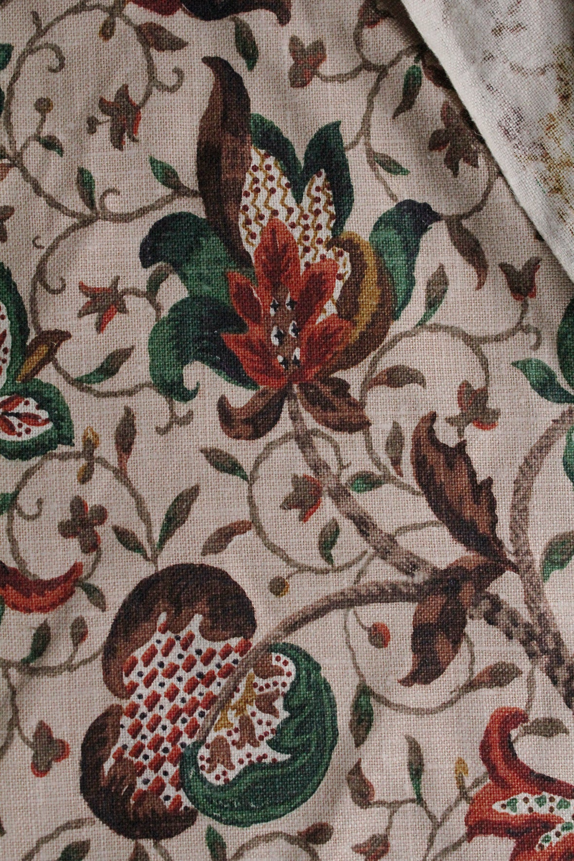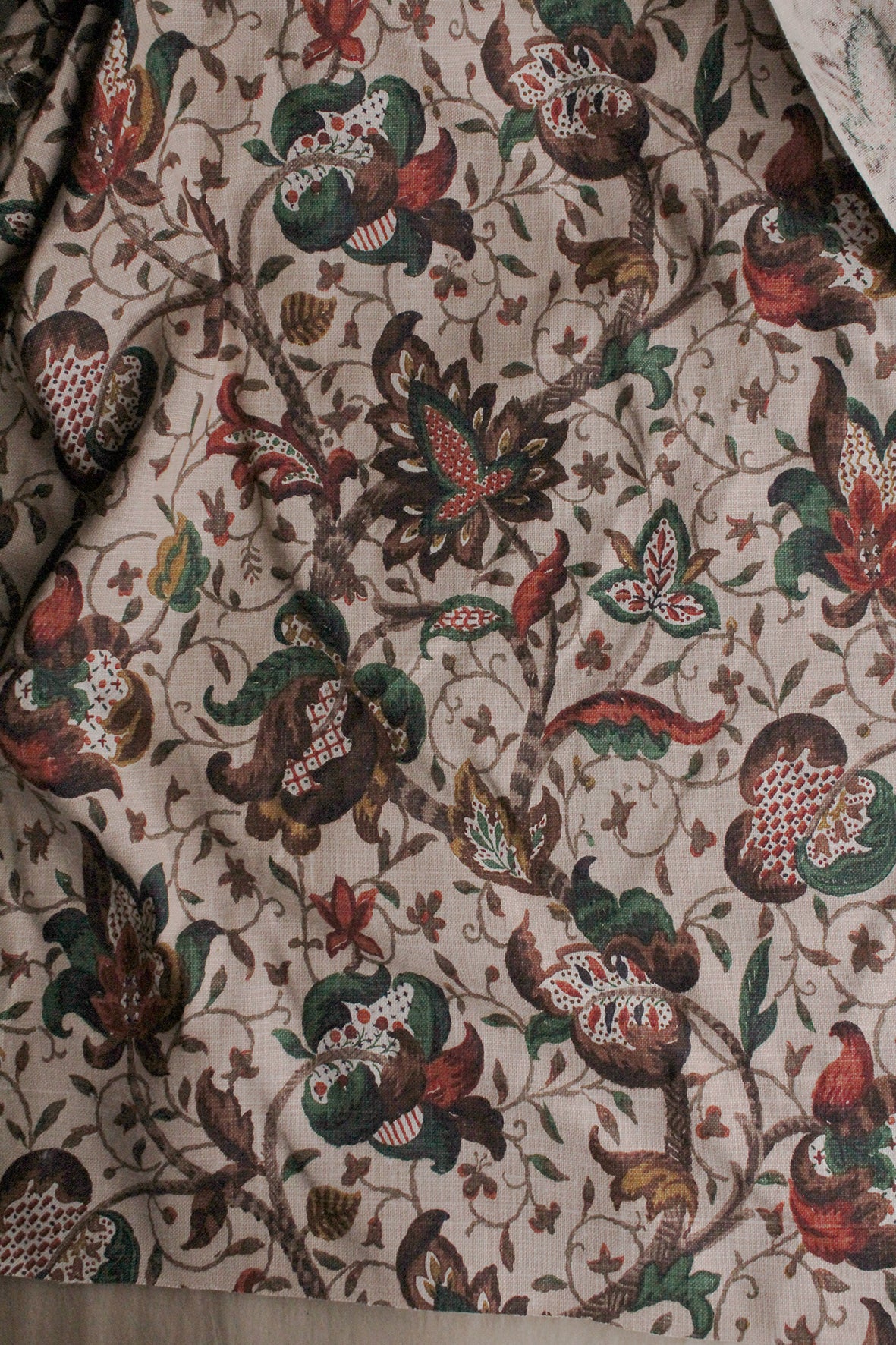 A beautiful piece of textile history. The print is still as fresh as the day it was manufactured. As this was screen printed (possibly rollered) it has the dye pressed through to the reverse so the reverse is a feint impression of the design which I always like to use when making cushions or a bag. I have taken close up photographs of the design too so you can see the detailing within this beautiful print. I particularly like the checks and stripes within the stalks and stems and the very small flowers and their unusual shapes. The main arts and crafts flowers are just wonderful in detailing as if they were directly painted onto the linen and not printed.