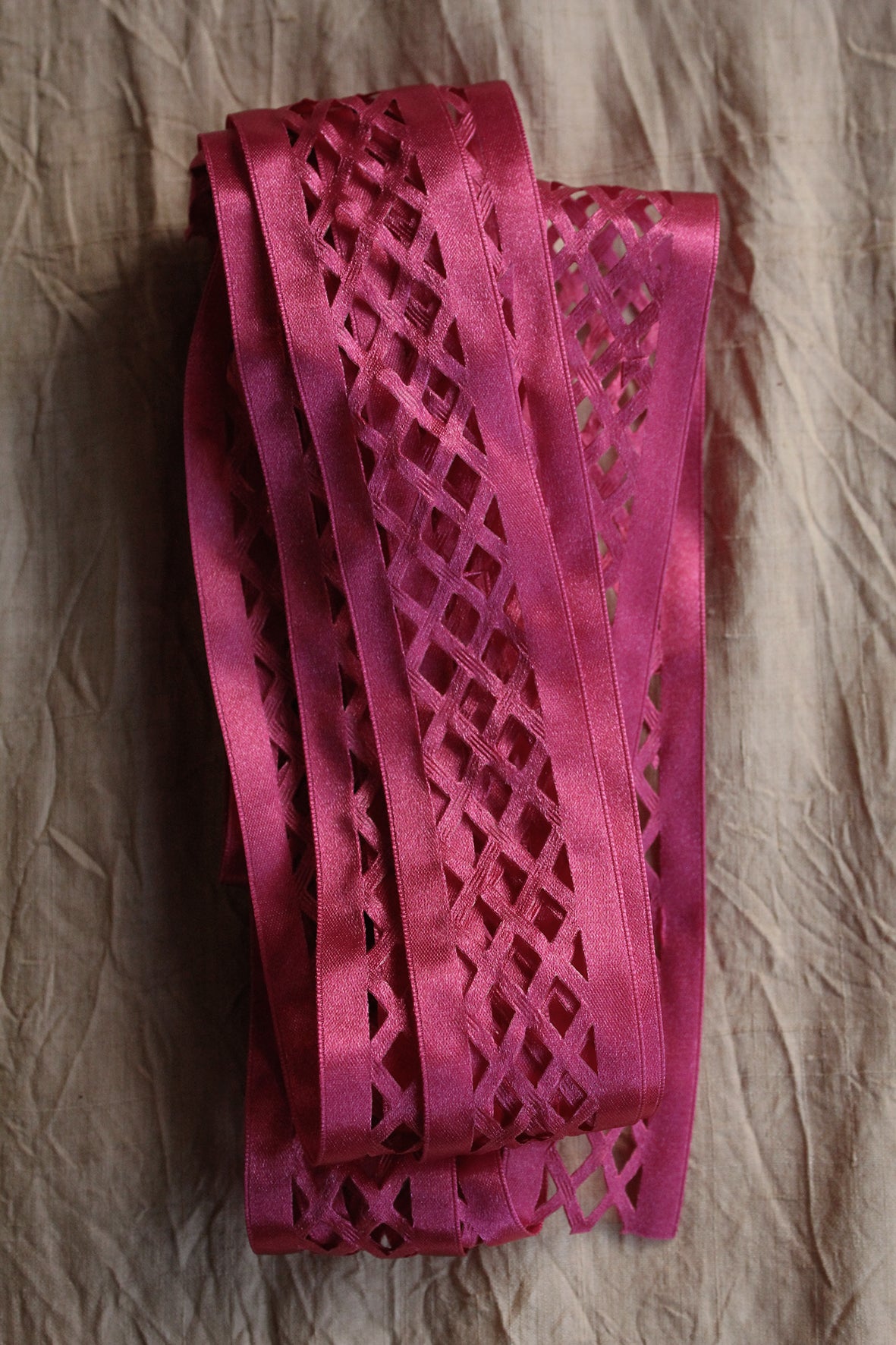 A lovely satin vintage ribbon in a warm magenta with lattice intercut detailing.