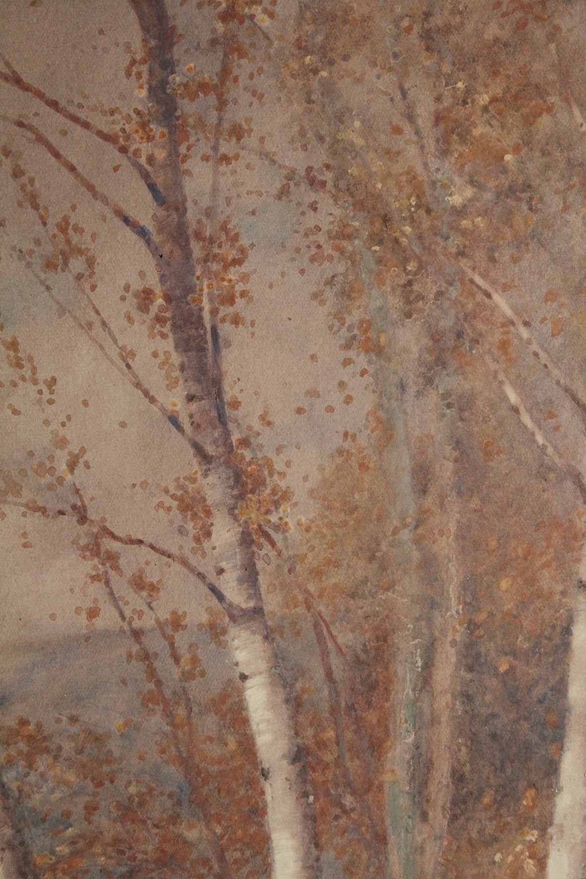 An exquisite old watercolour of a family of birch trees adorning a river bank on both sides. You can just see another row over on the other side of the river. There is a beautiful gentleness to this study. Carefully and thoughtfully painted. Please view the images to admire the details in description and technique.