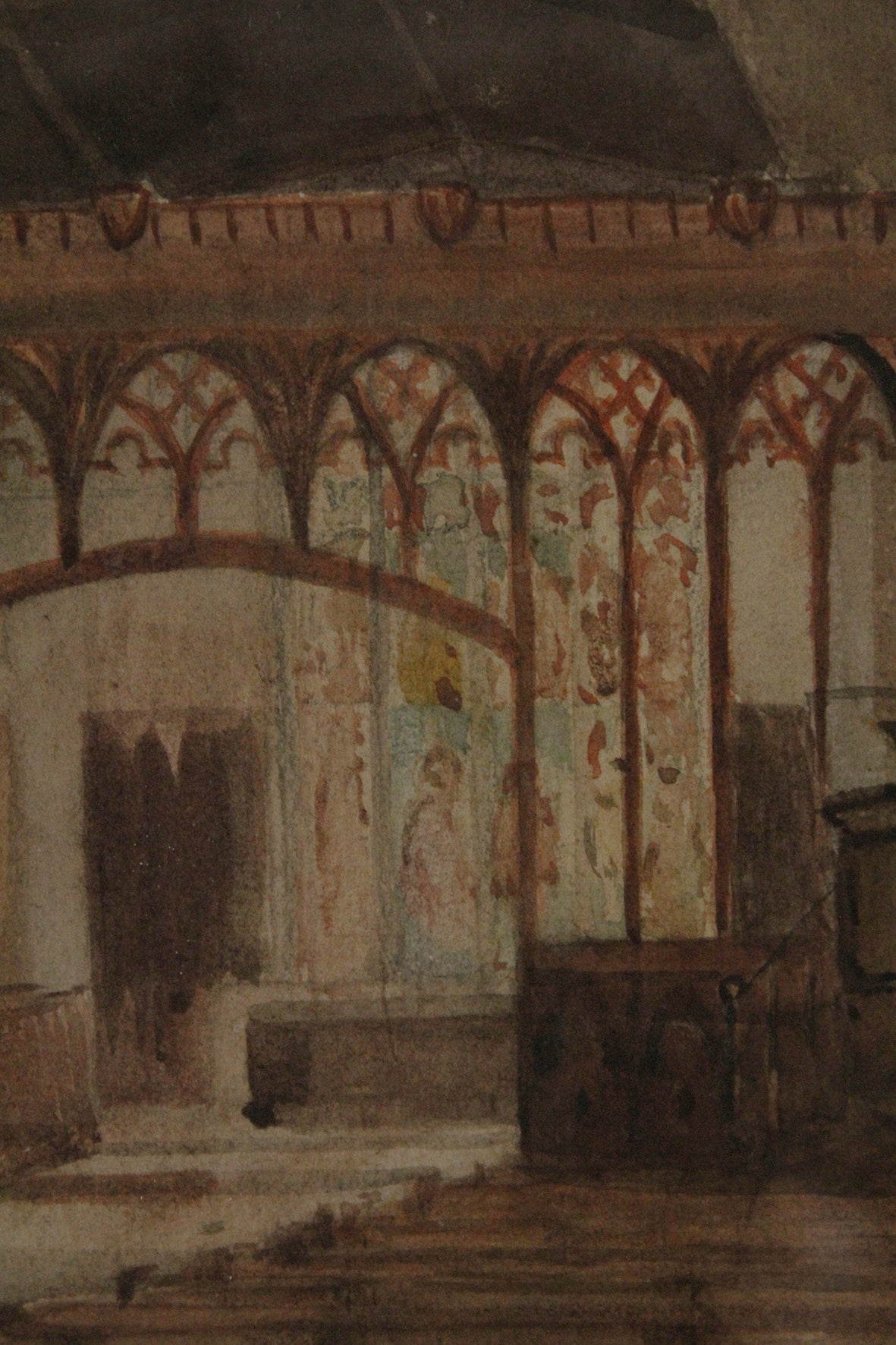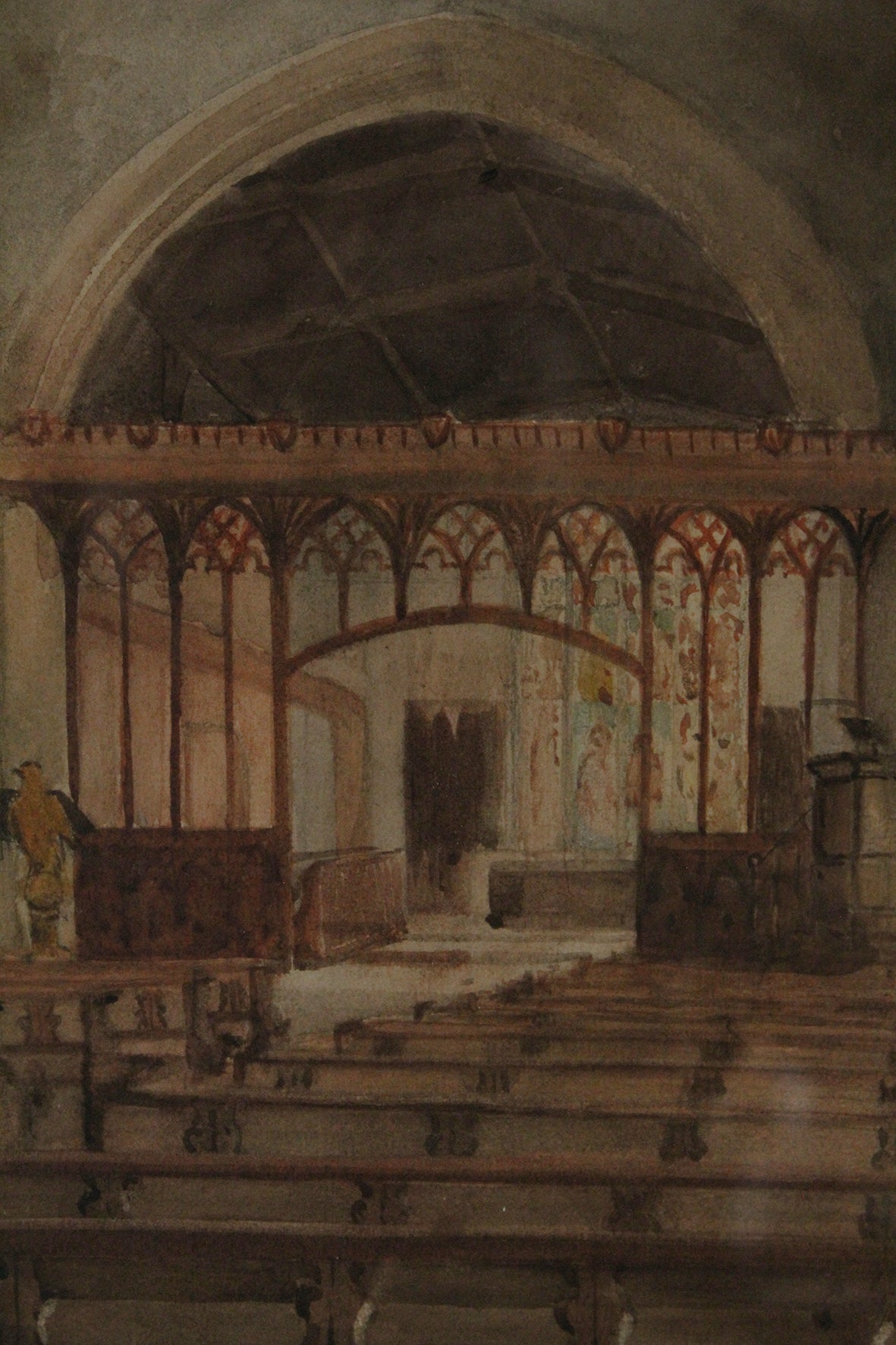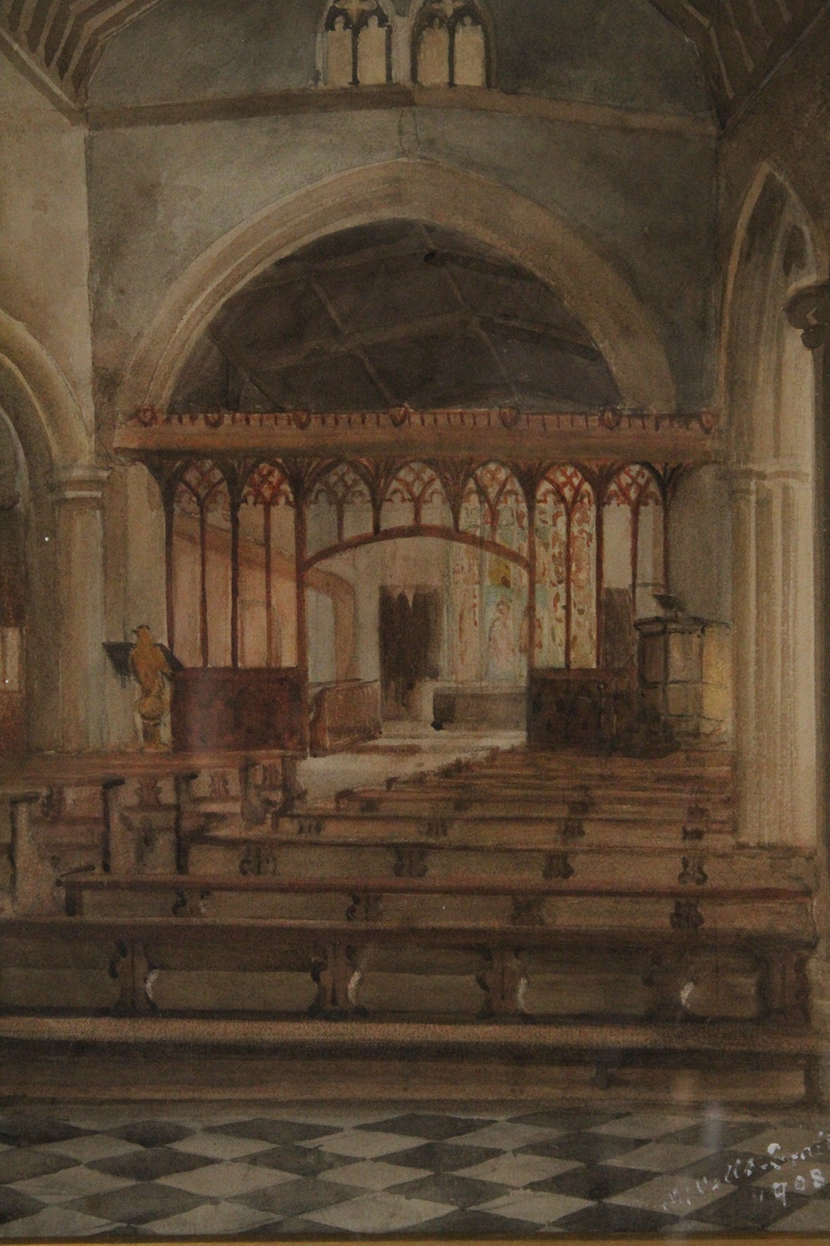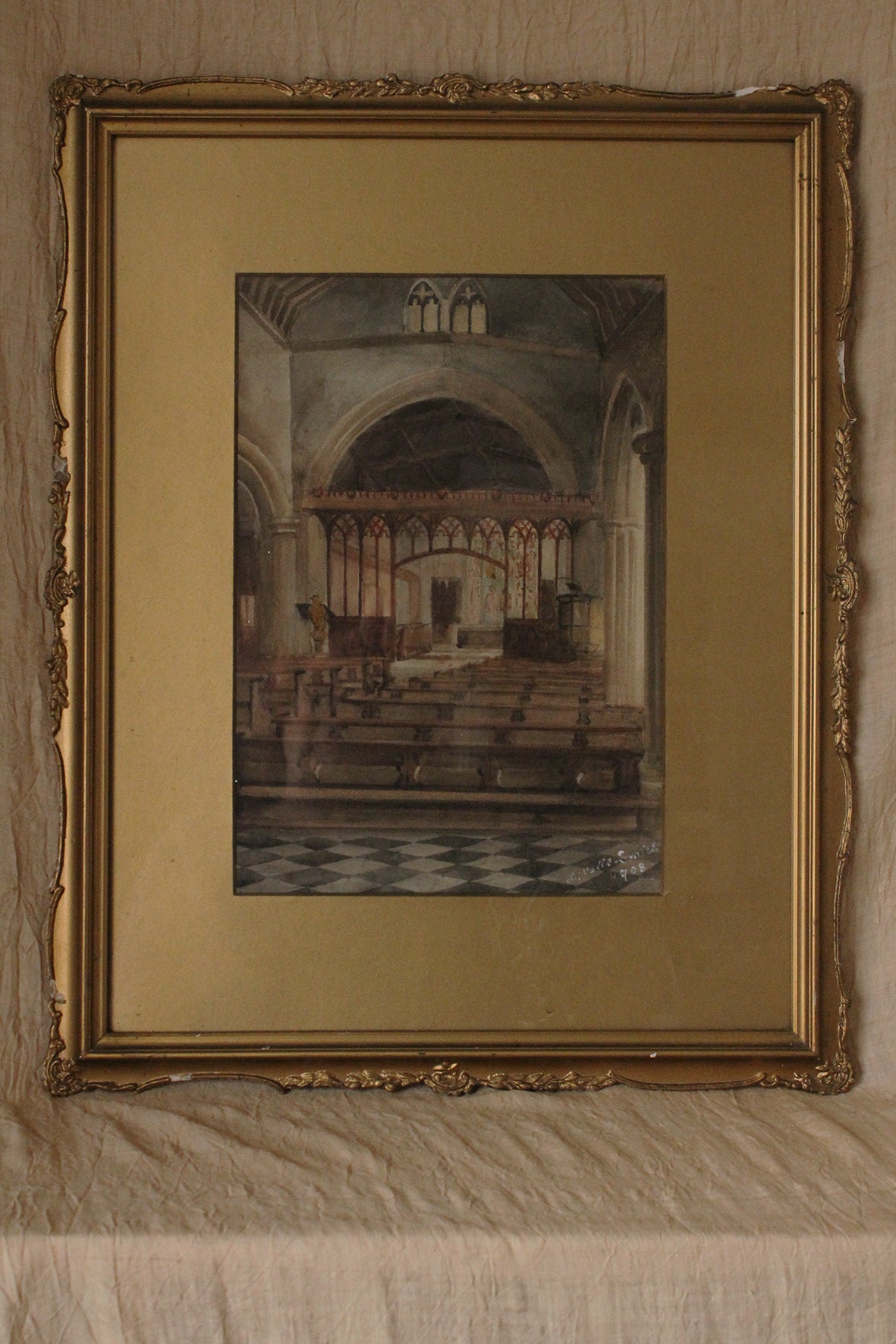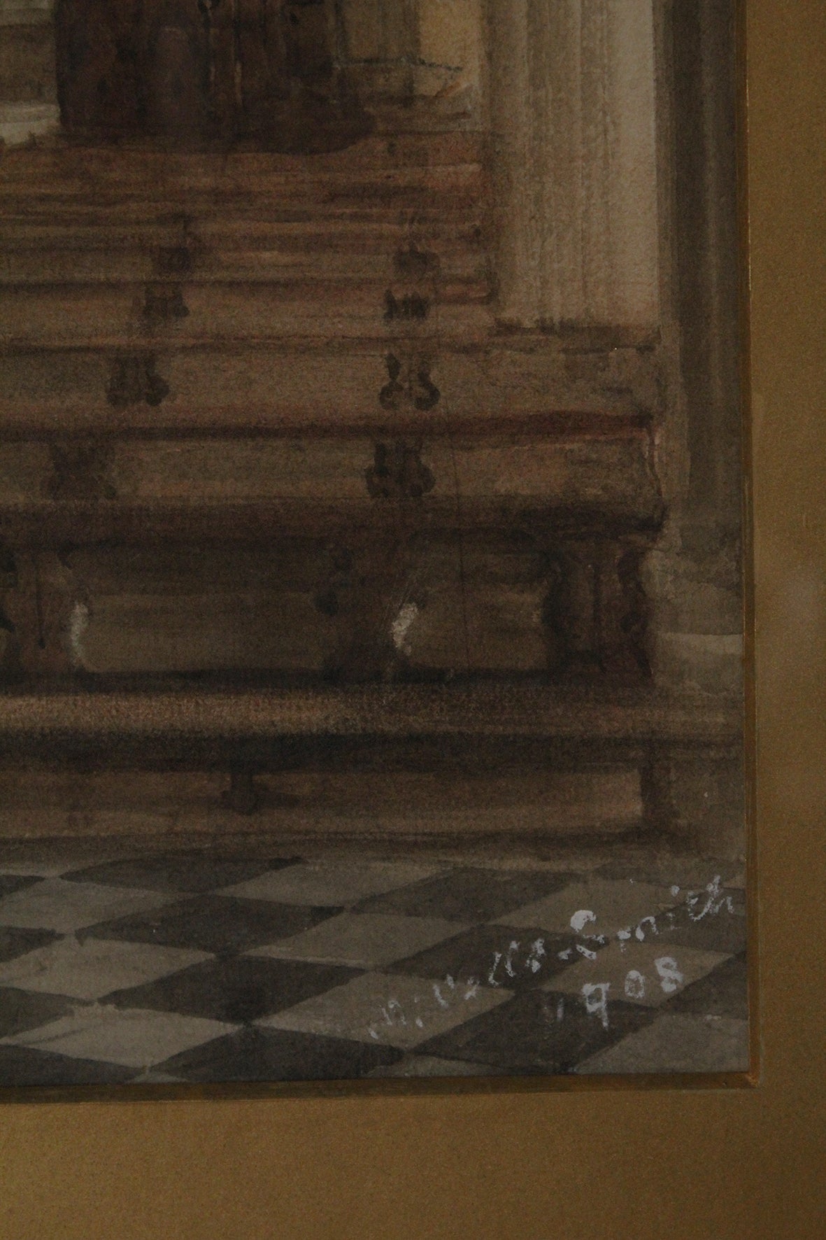 This painting is beautiful it is quite decorative and appears to be a view within a cathedral than a church but then some churches in more affluent parts of the country may have had similar qualities. I am unsure of where the location is but the painting has been signed and dated 1908 in white paint to the bottom right corner.