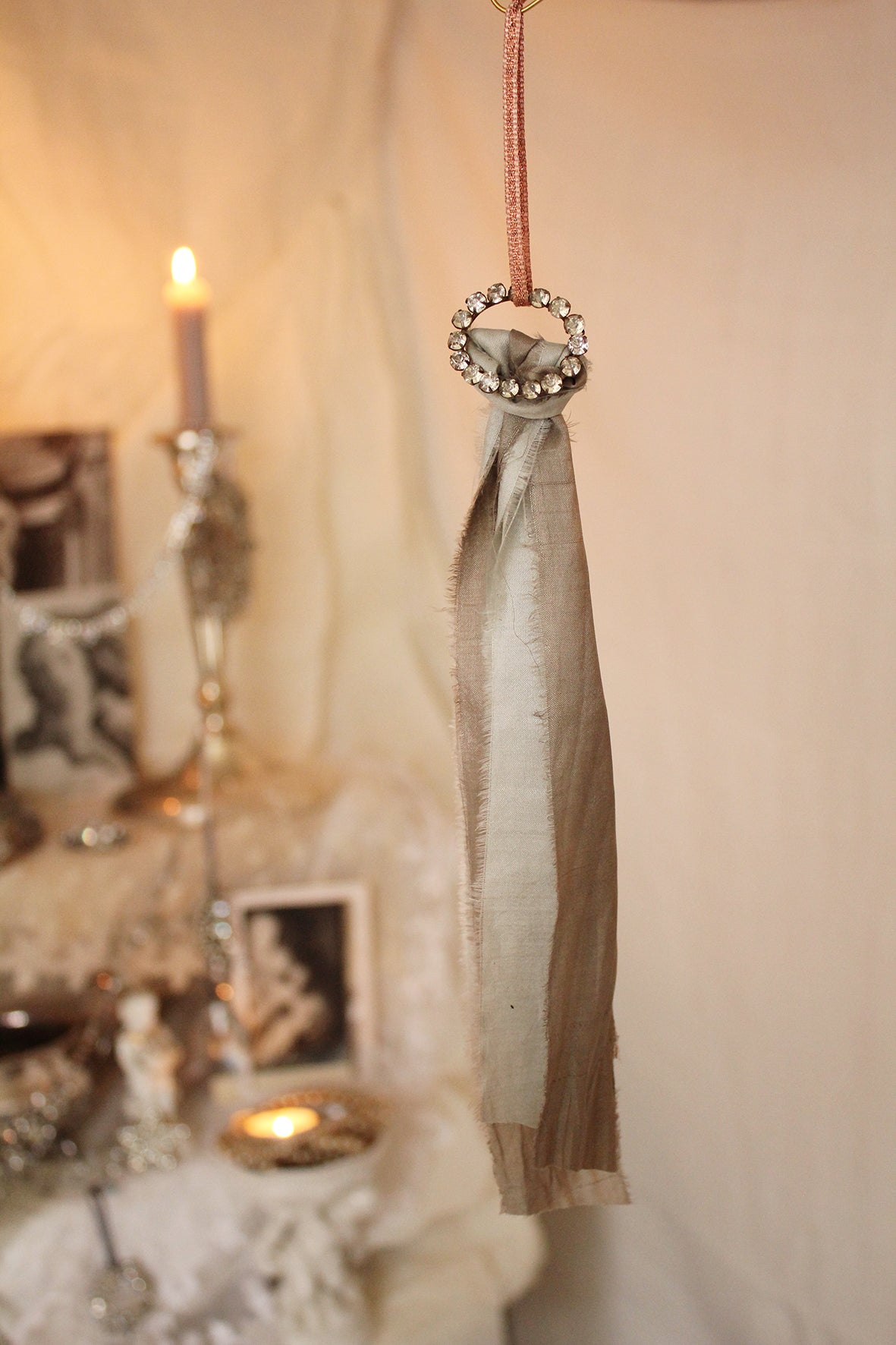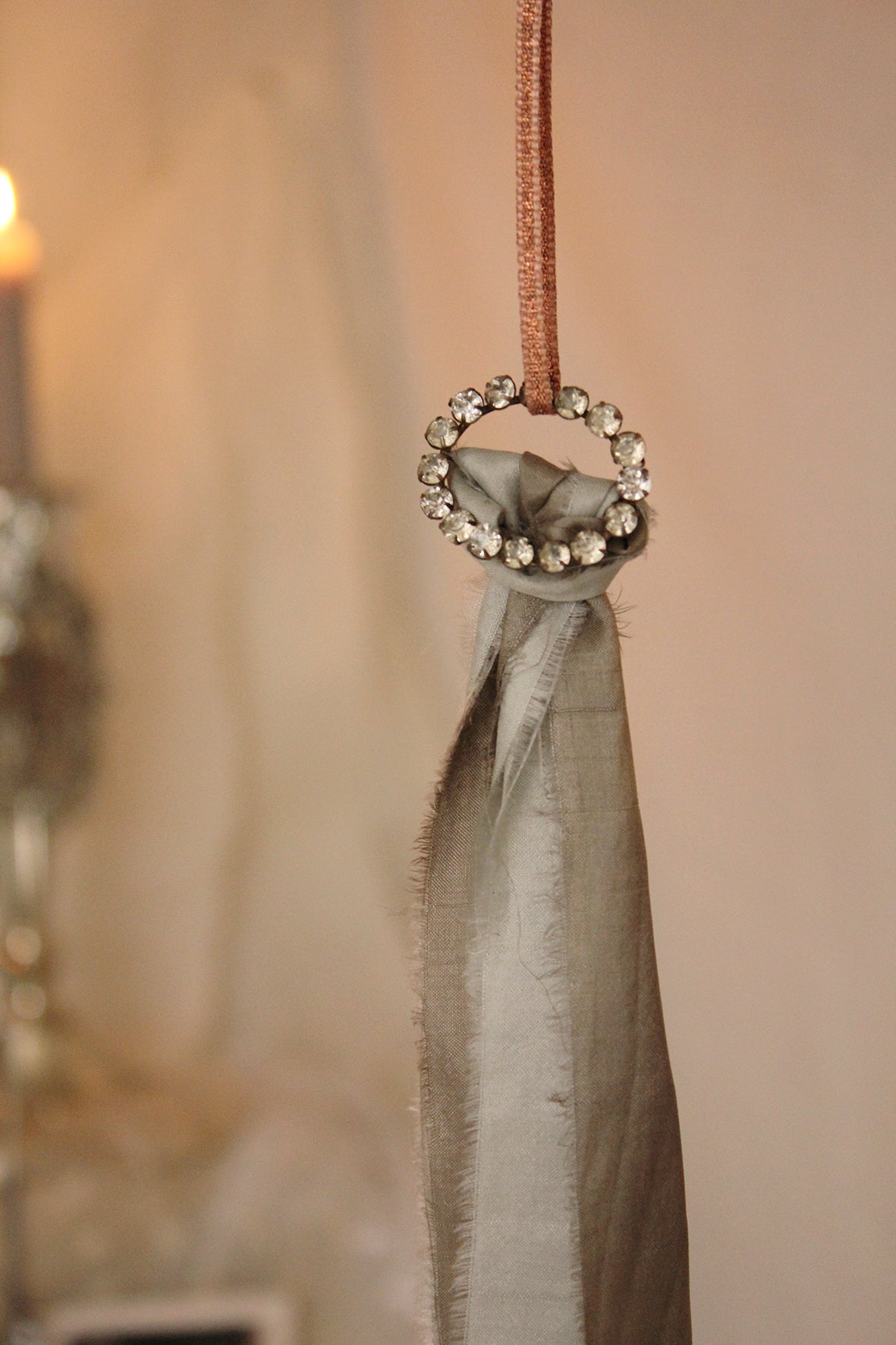 A lovely antique/vintage metal brooch dressed with jewels, silk ribbon tail, and a double satin ribbon as the hanger. Simply hang on a door handle of your armoire, from the wall, the corner of a painting, a garland, a wreath, a gift or simply place on your tree.