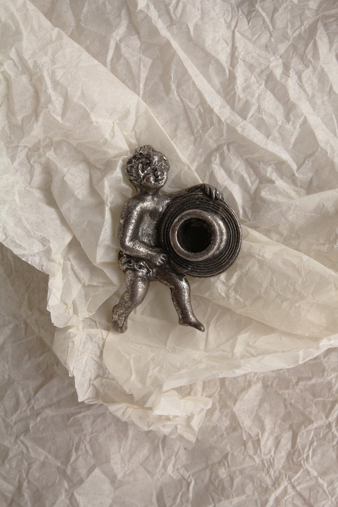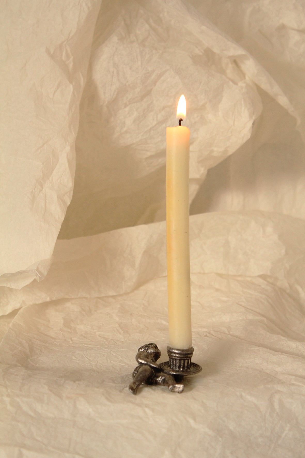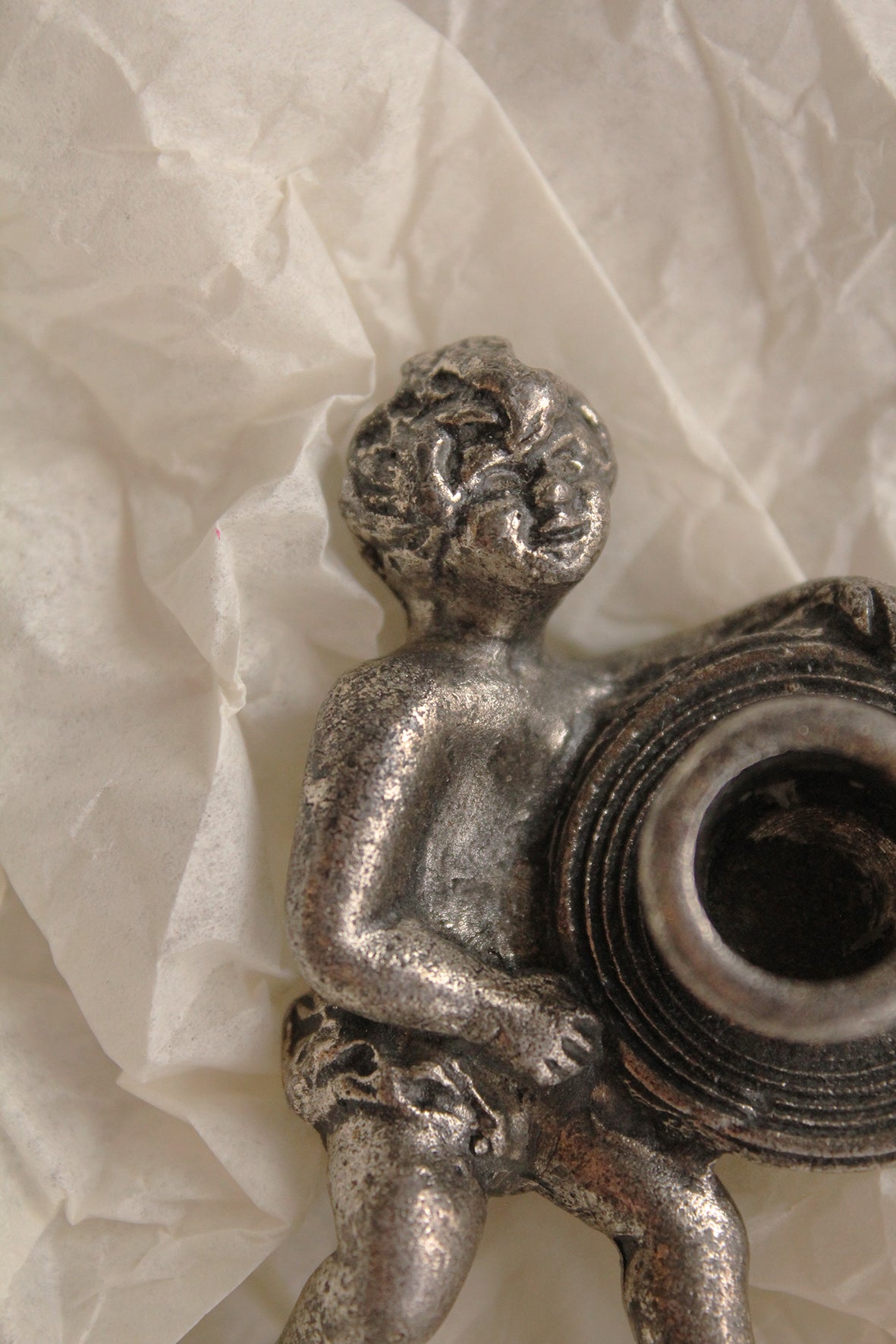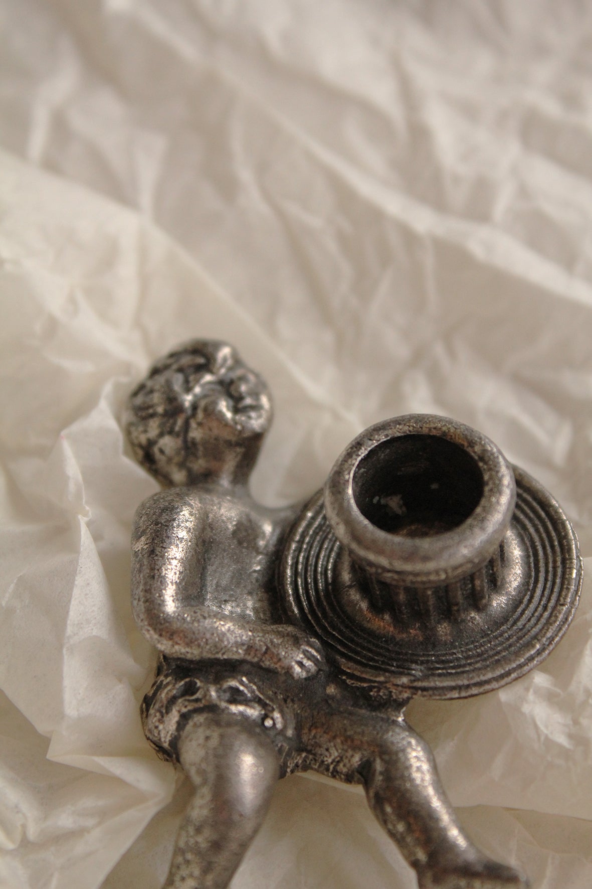 A lovely gem of a find. A sweet old cherub like figure embracing a candle holder made from pewter (I think( . This holds a very small church candle and I will send one with this so you can use immediately on receipt. You will just have to carve the bottom a little before use.