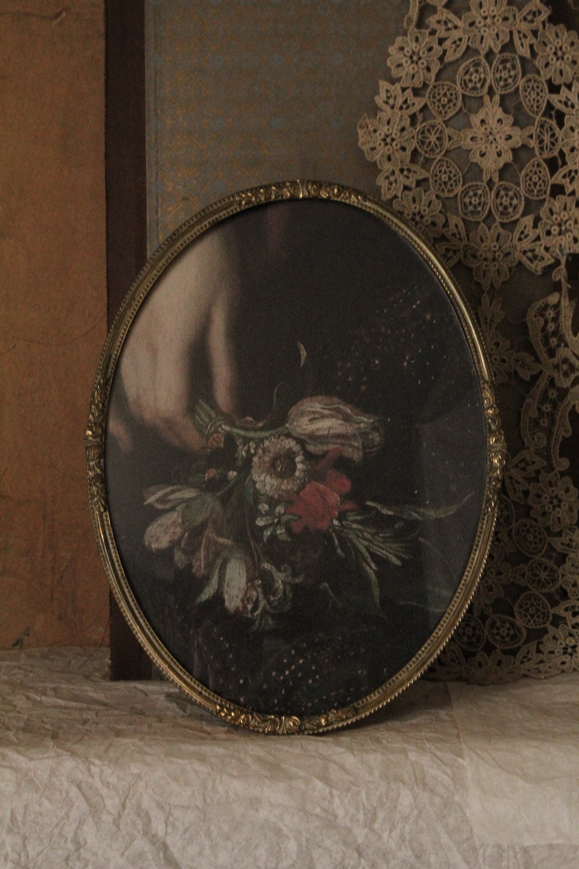 A very lovely old brass frame with raised floral swag detailing on each side. Their is a slight patina to the frame which perfectly suits the print.