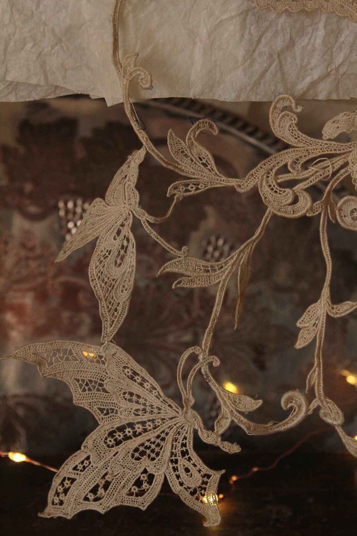 An exquisite example of Schiffli lace, beautiful in design and detail and wonderful to just own to study and research and take inspiration. This intricate panel is made up of varied leaves and flowers but the particularly special detail is the series of sculptured flower heads that appear within the panel. I have taken lots of photographs as a visual description.