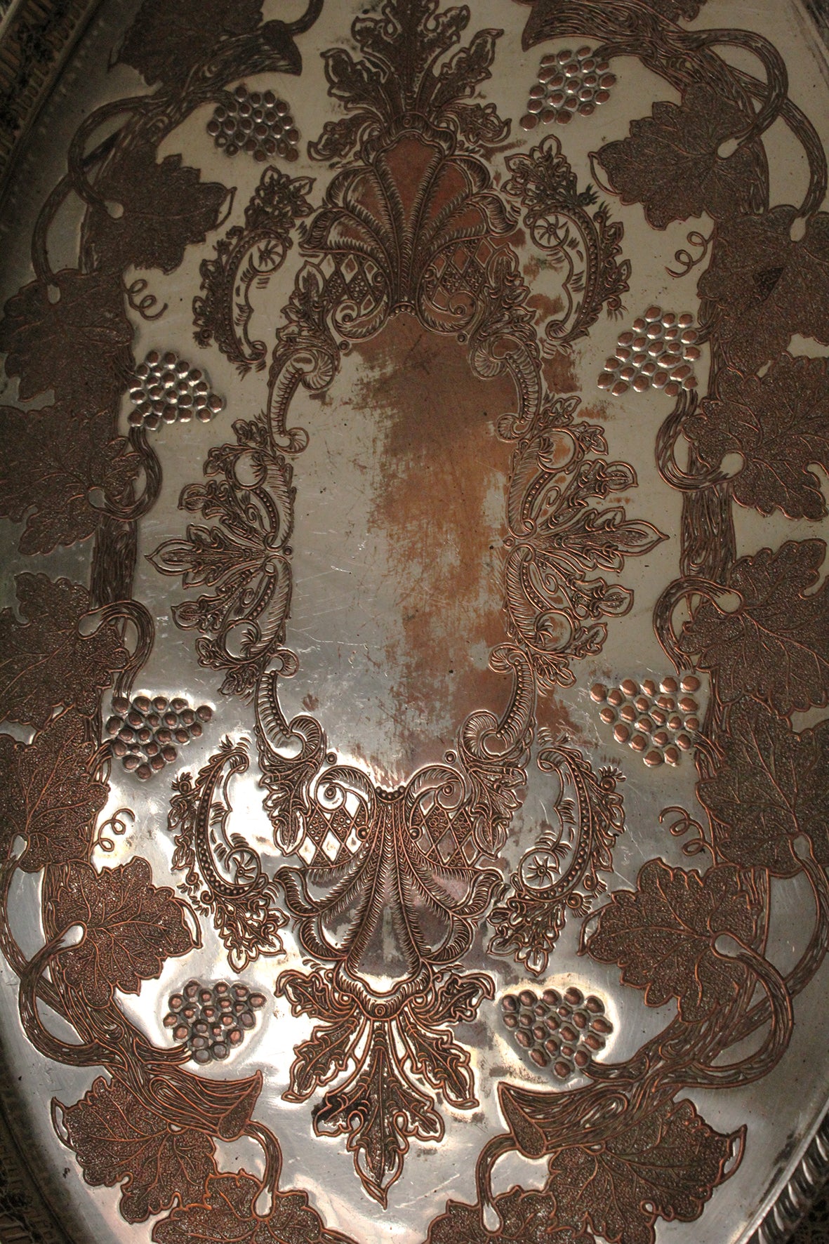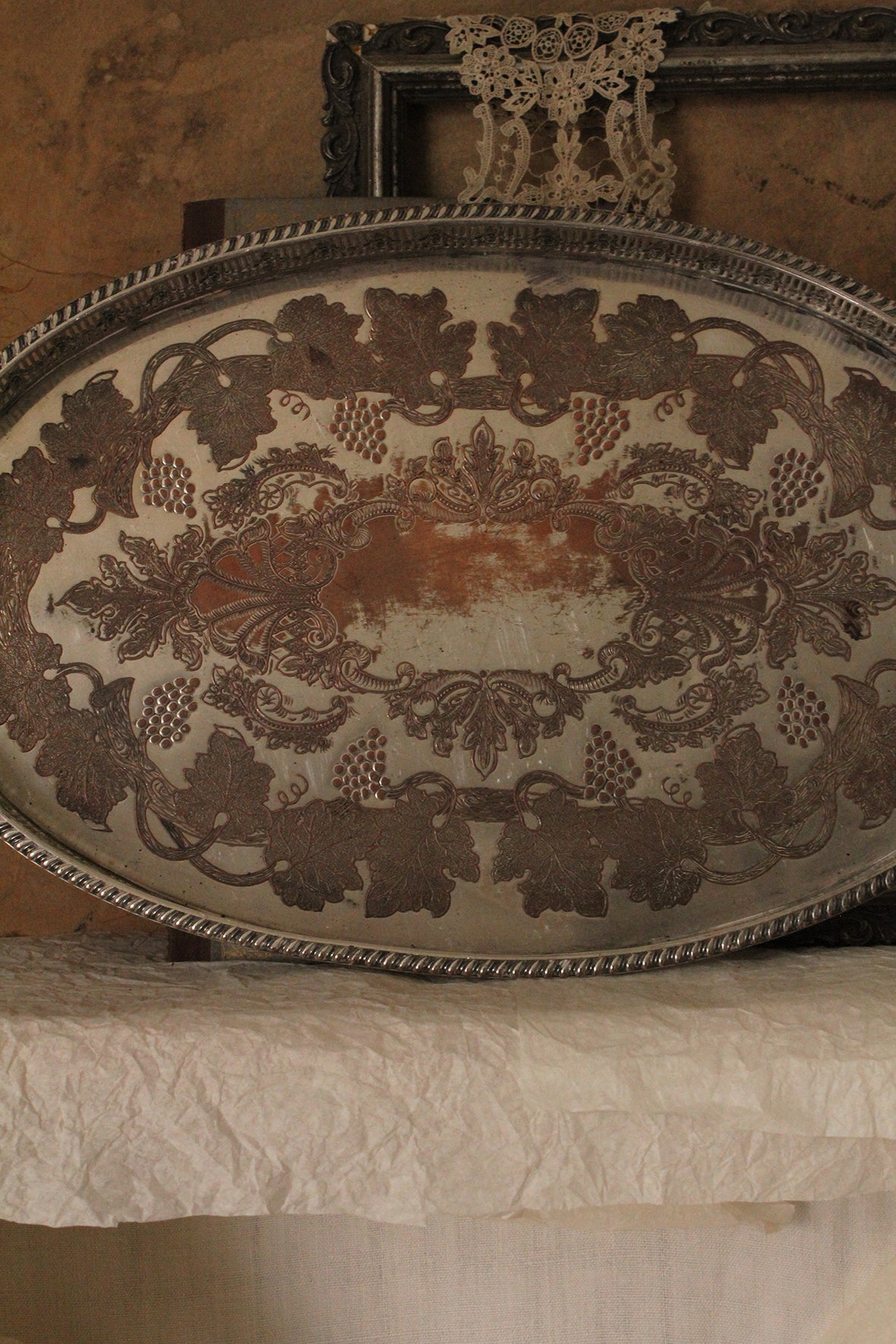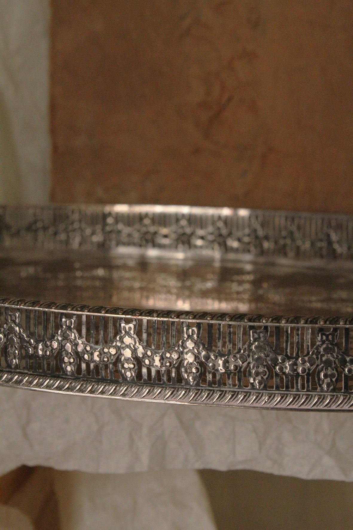 This beautiful and detailed old silver plated tray with detailed sides is just lovely to hold greenery, candle filled votives and additional details such as shells or nuts or berries to create a display. The etched decorative details are just beautiful, the plate and etched details to the centre have worn to reveal the warmth of the copper underneath.