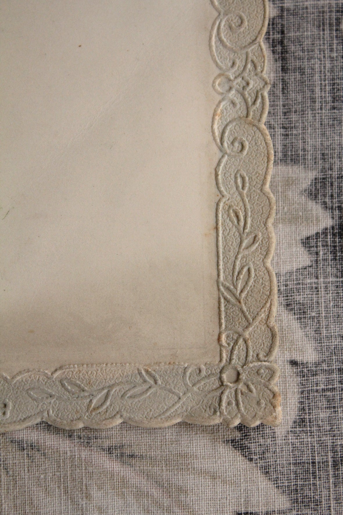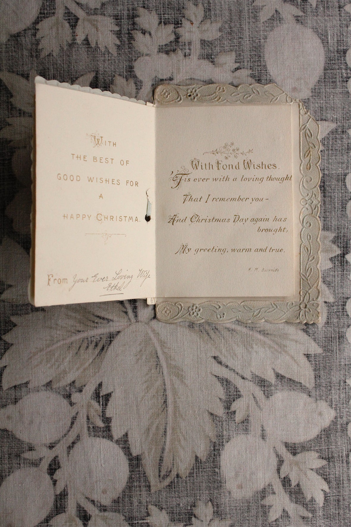 A beautifully illustrated and embossed celluloid Christmas card. There is an original silk tie and the insert page with verse and message is still present inside. The back cover has a lovely embossed border.