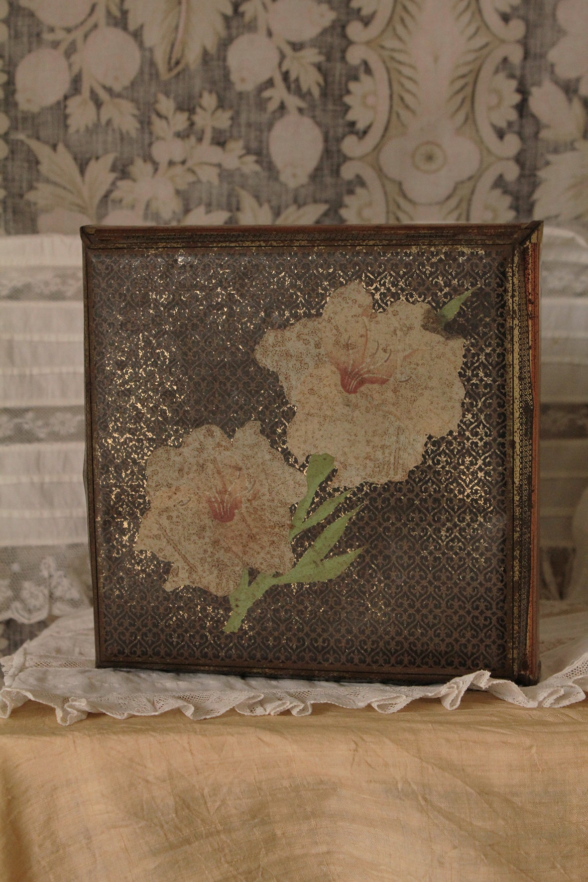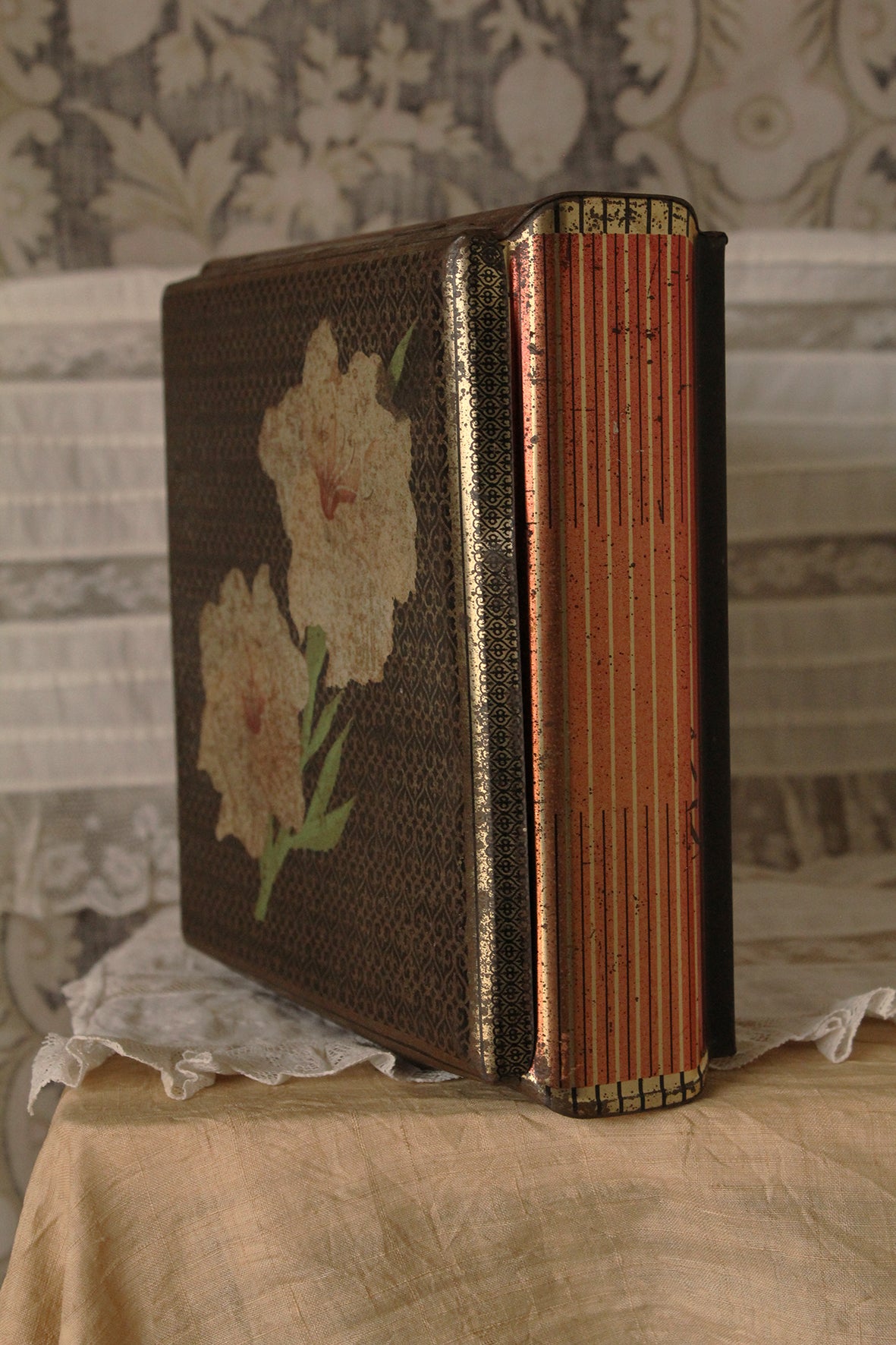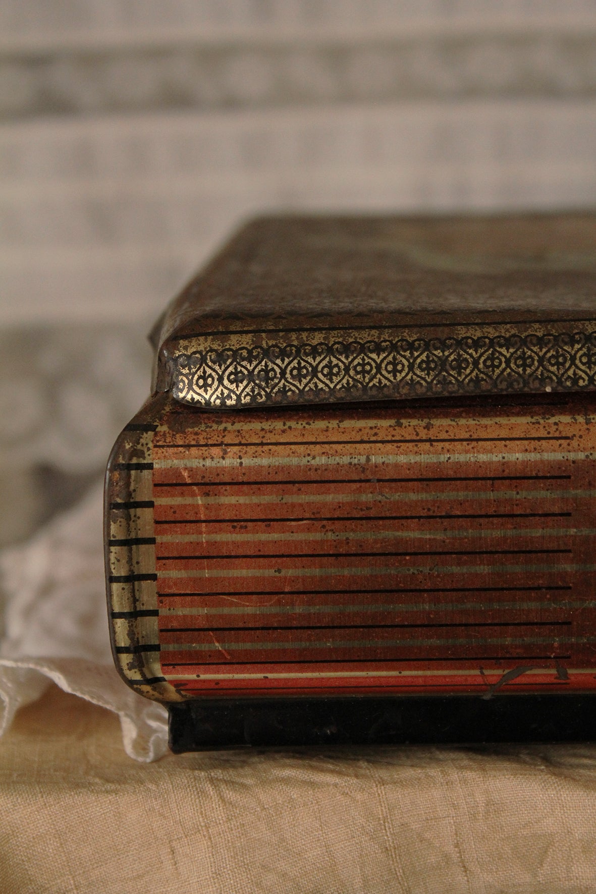 This is a very attractive old tin, with a worn floral lid and a striped design that travels around the sides. This is an old Liqourice tine.
