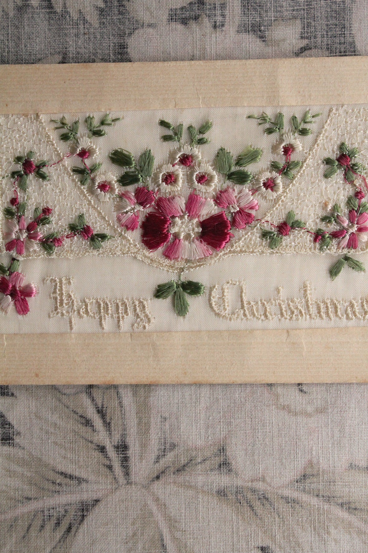Old WW1 Embroidered Postcard - Floral - Happy Christmas
