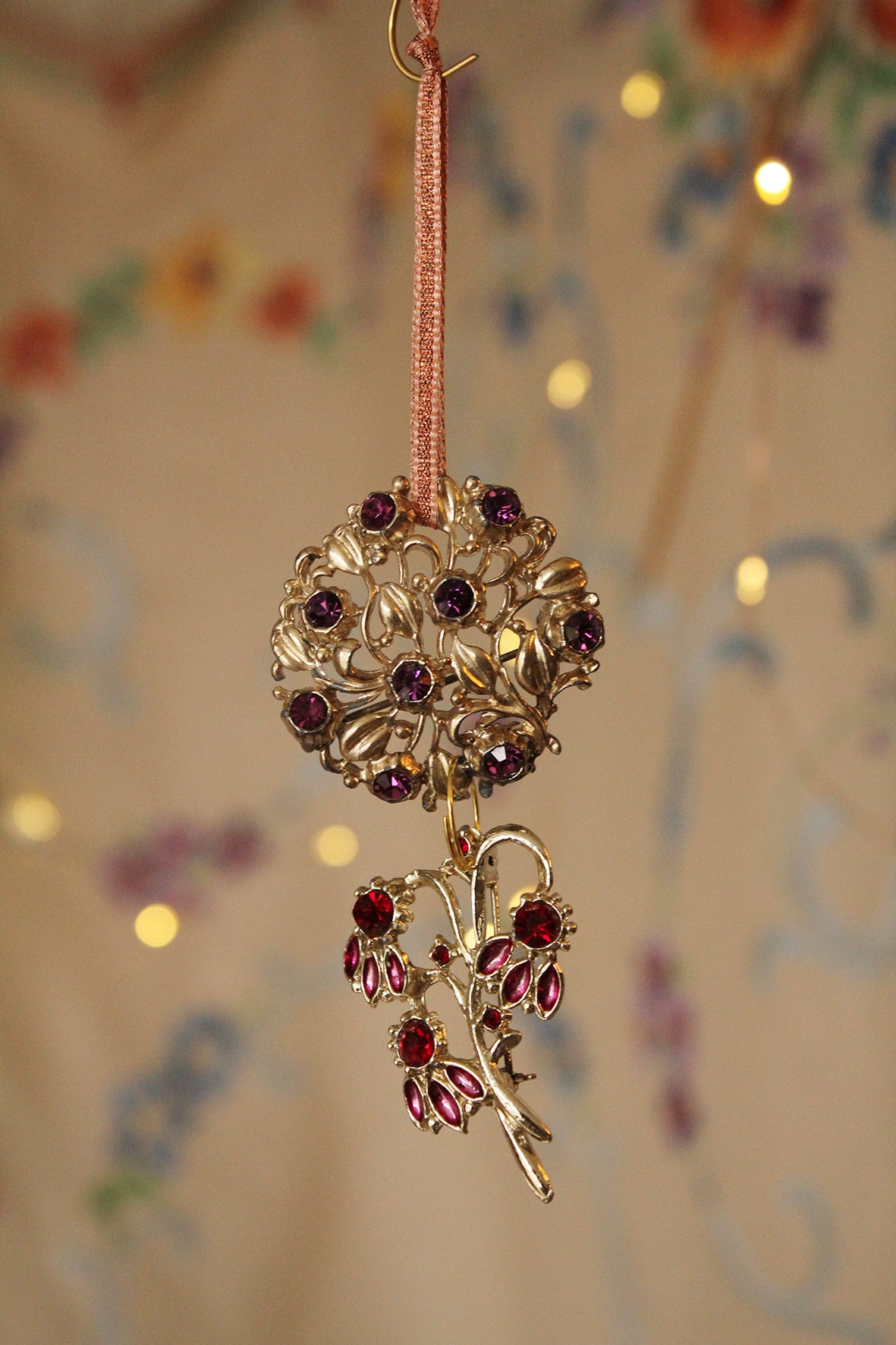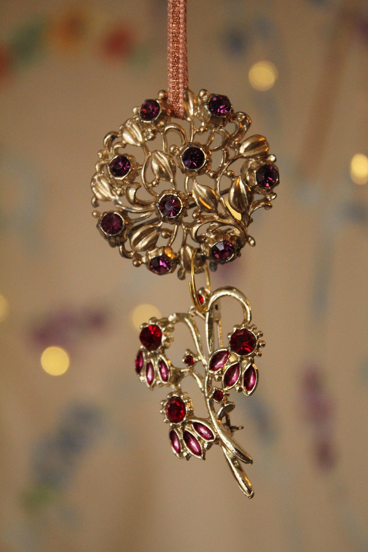 Layers and layers of jewels and sparkle are brought together with love. The jewels are connected with chandelier bow clips and loops and finished with a double satin ribbon hanger. Simply hang on a door handle of your armoire, from the wall, the corner of a painting, a garland, a wreath, a gift or simply place on your tree.