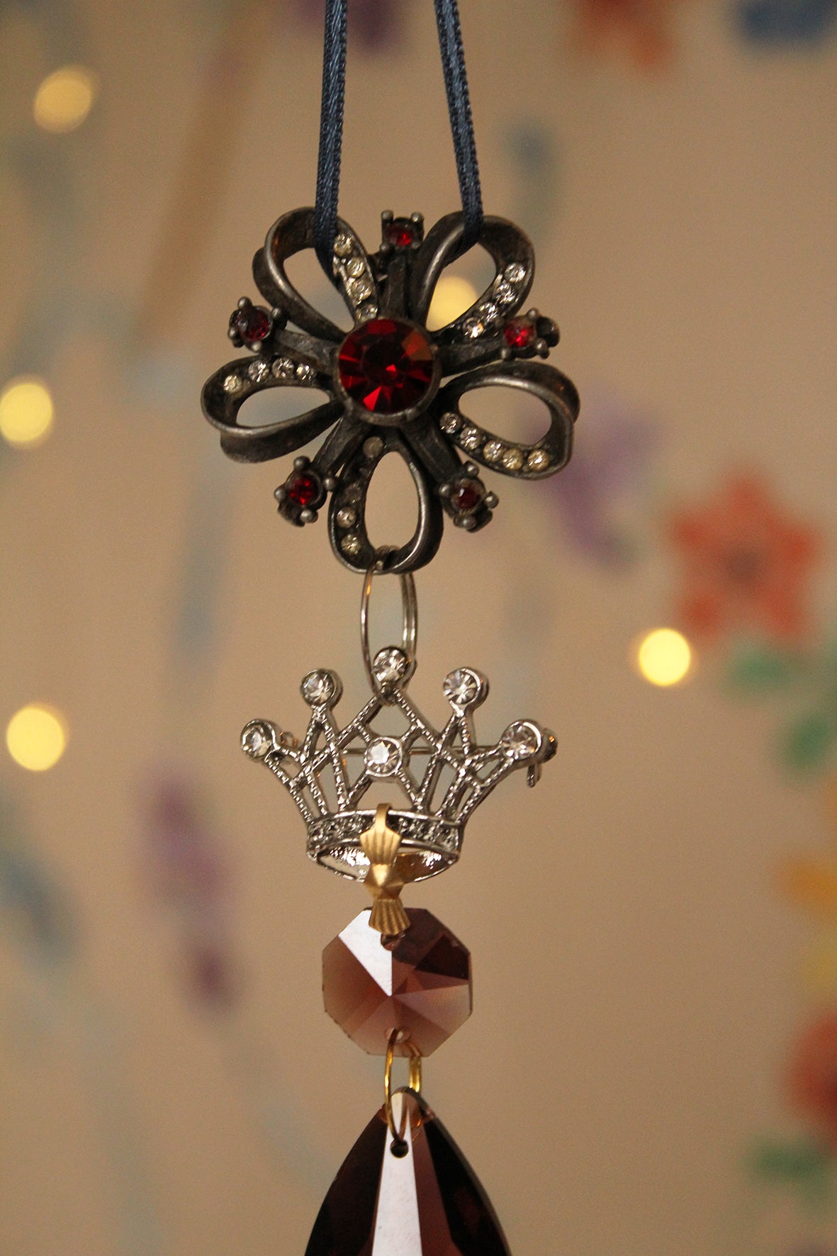 Layers and layers of jewels and sparkle are brought together with love. The jewels are connected with chandelier bow clips and loops and finished with a double satin ribbon hanger. Simply hang on a door handle of your armoire, from the wall, the corner of a painting, a garland, a wreath, a gift or simply place on your tree.