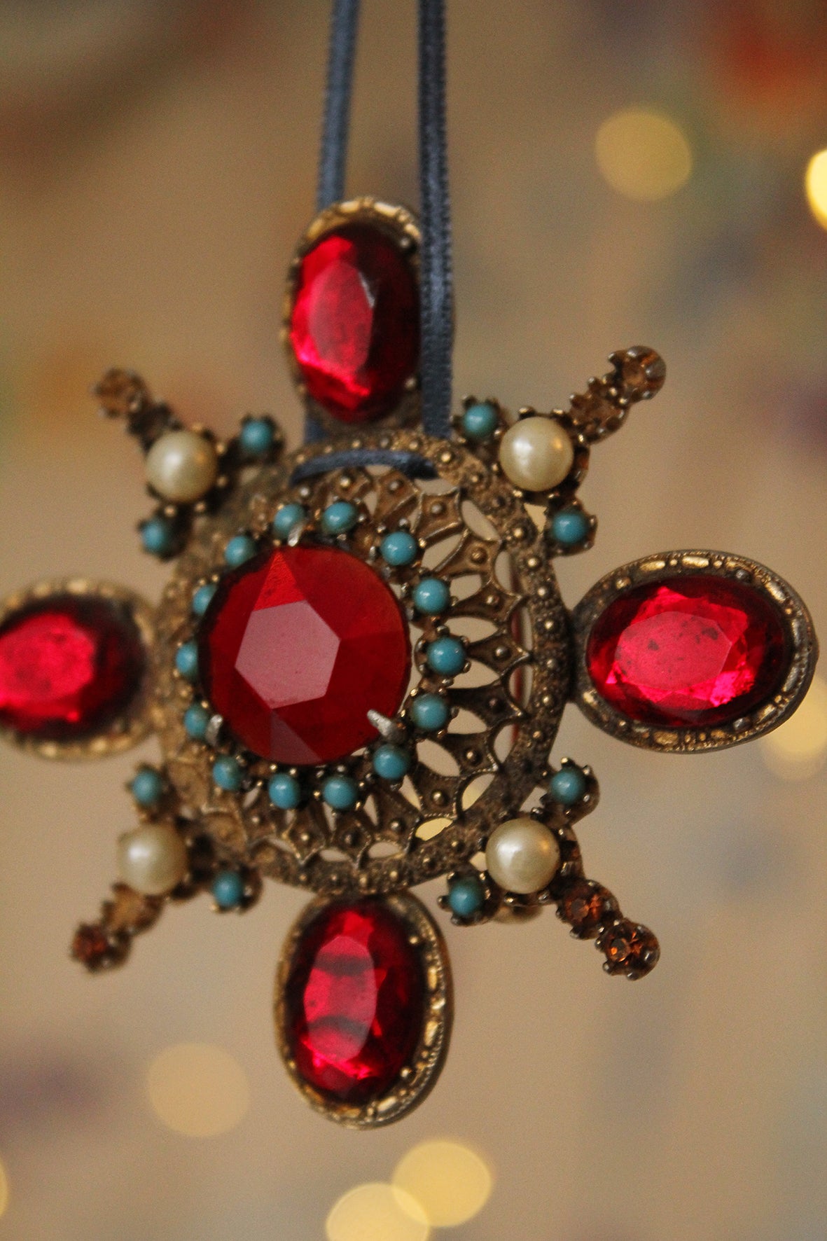 Layers and layers of jewels and sparkle are brought together with love. The jewels are connected with chandelier bow clips and loops and finished with a double satin ribbon hanger. Simply hang on a door handle of your armoire, from the wall, the corner of a painting, a garland, a wreath, a gift or simply place on your tree.