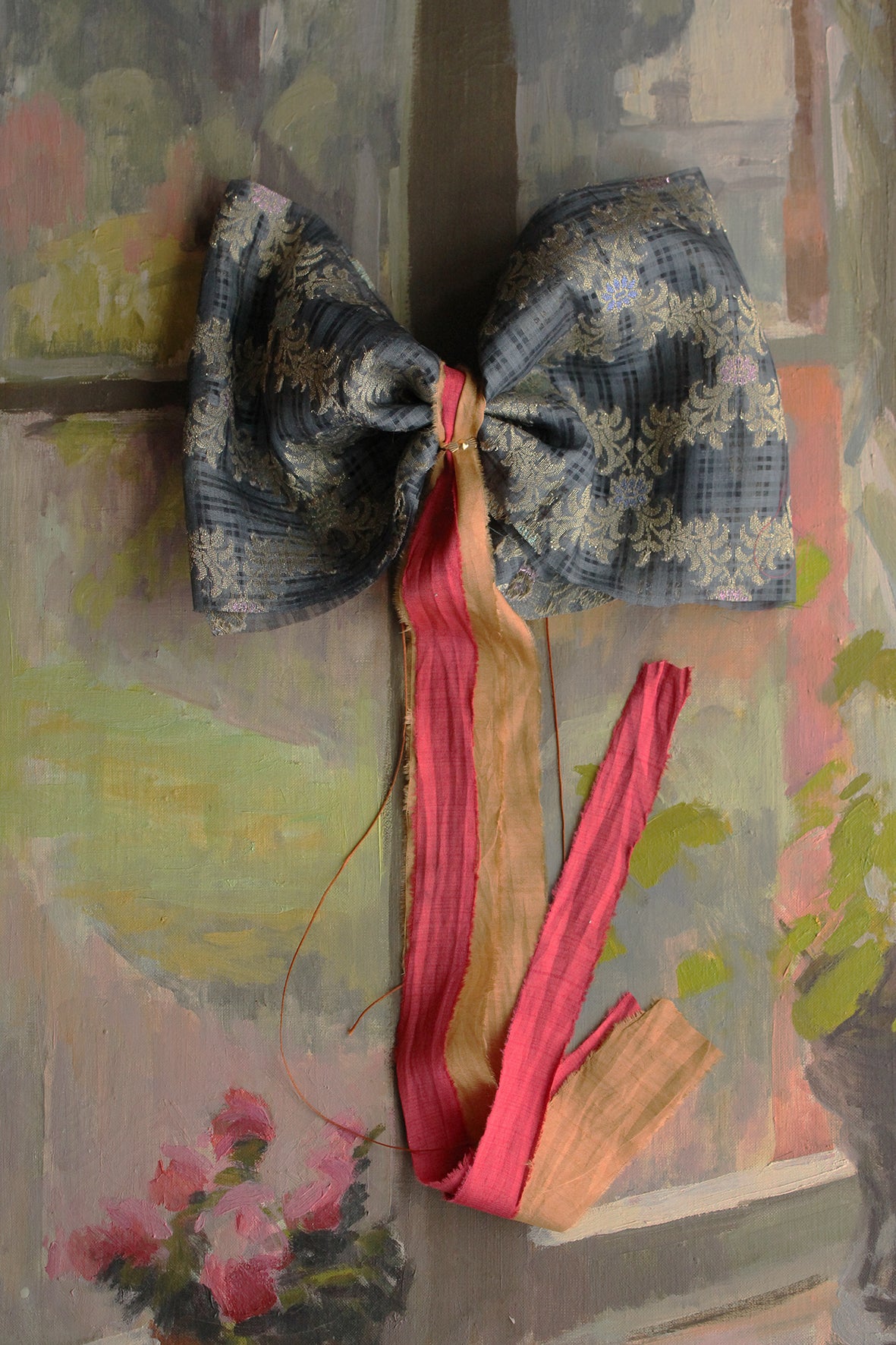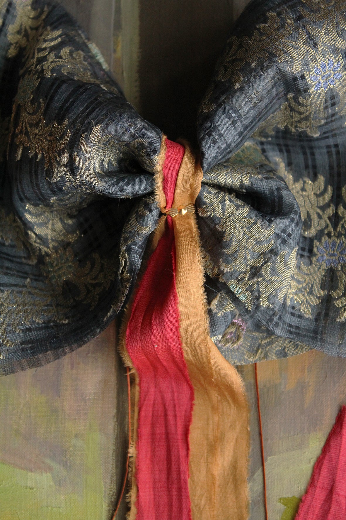 A large bow that is perfect for placing on your wreath, tree or a large gift that needs a little special adornment. Made from a panel of vintage woven sari fabric and silk ties. There's a waxed linen thread that has loose ends for you to tie as you wish to attach the bow. The long silk tie is attached to the bow using a chandelier bow clip.