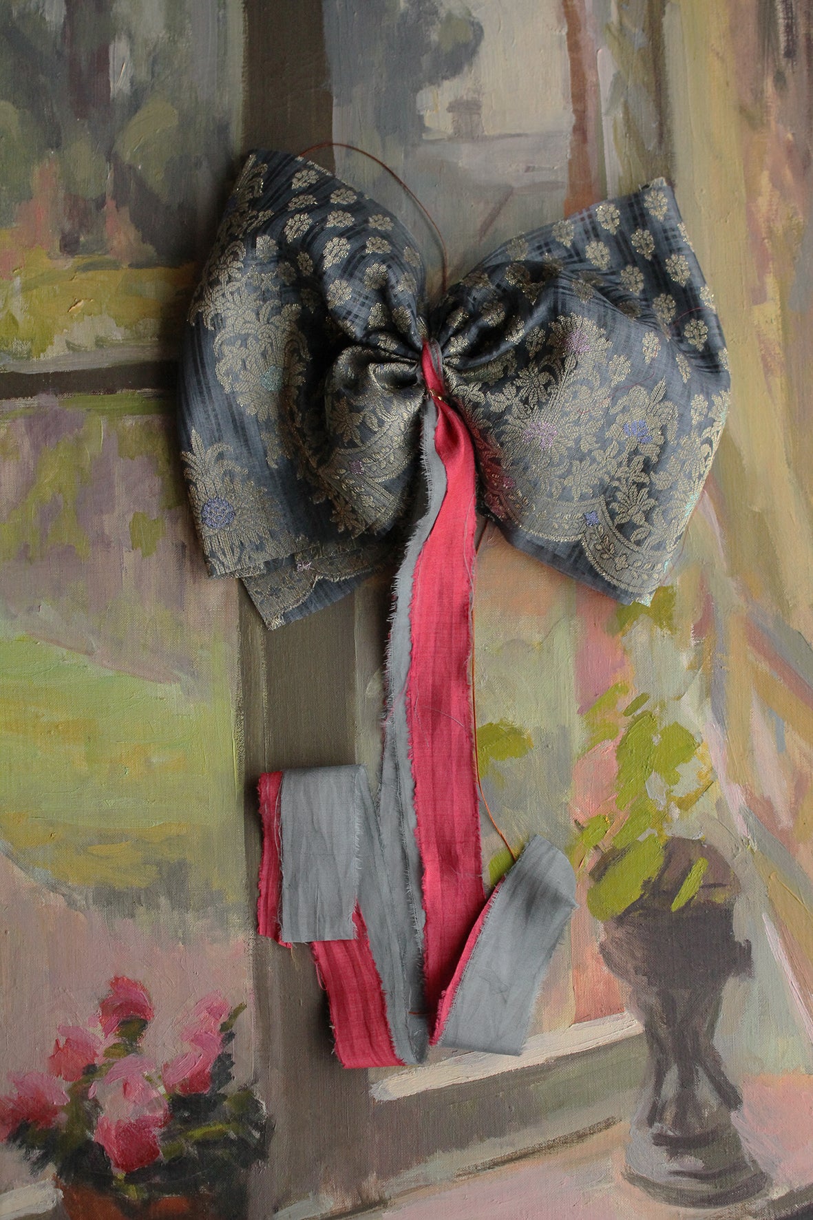A large bow that is perfect for placing on your wreath, tree or a large gift that needs a little special adornment. Made from a panel of vintage woven sari fabric and silk ties. There's a waxed linen thread that has loose ends for you to tie as you wish to attach the bow. The long silk tie is attached to the bow using a chandelier bow clip.