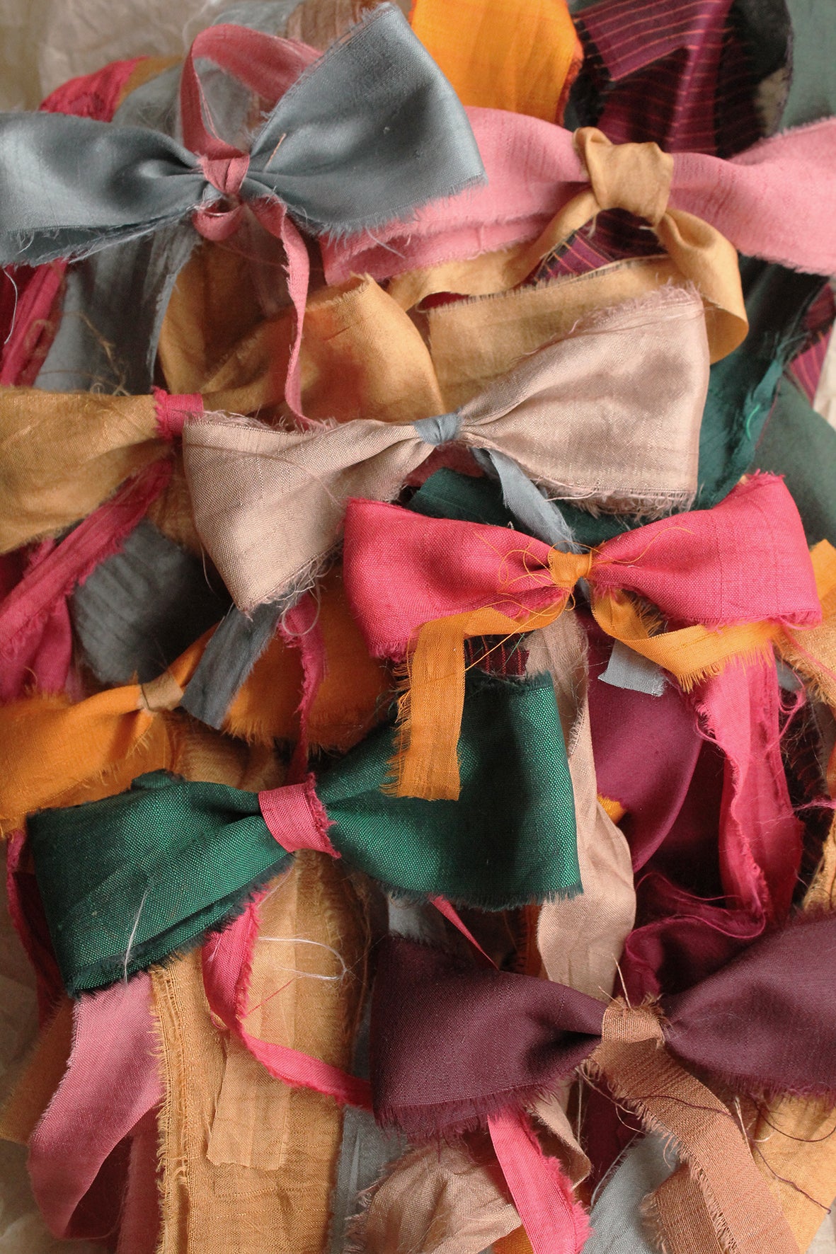 It is that time of year where I stand for hours on end and prep all the vintage and antique silk sari ribbon that has arrived over the last couple of months. This silk ribbon is so lovely to use especially at this time of year. You can use to decorate presents, add to wreaths and swags, make bows, or use as lengths to add to your decorations for the tree. Sometimes changing the hangers to simple glass baubles in complimentary or contrasting colours can change the look of the decoration. It is also lovely to just have in your craft room to use within your own projects.